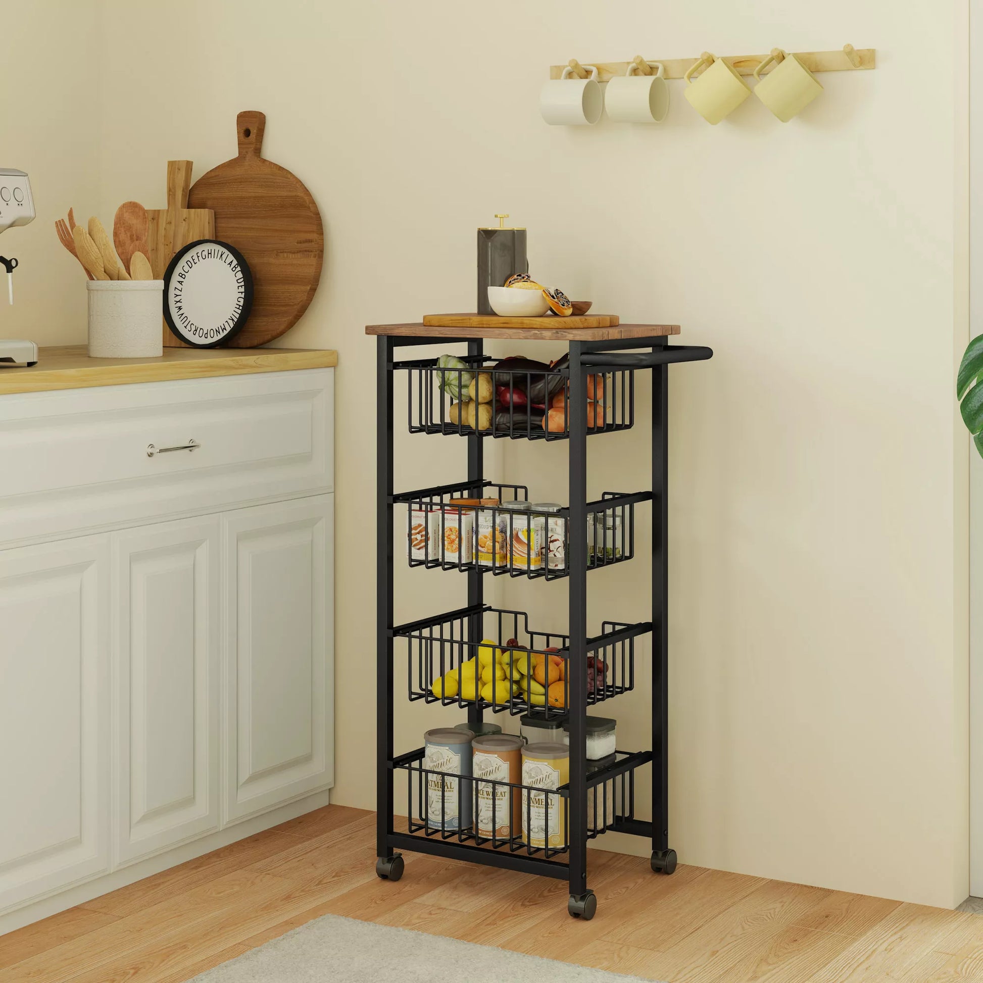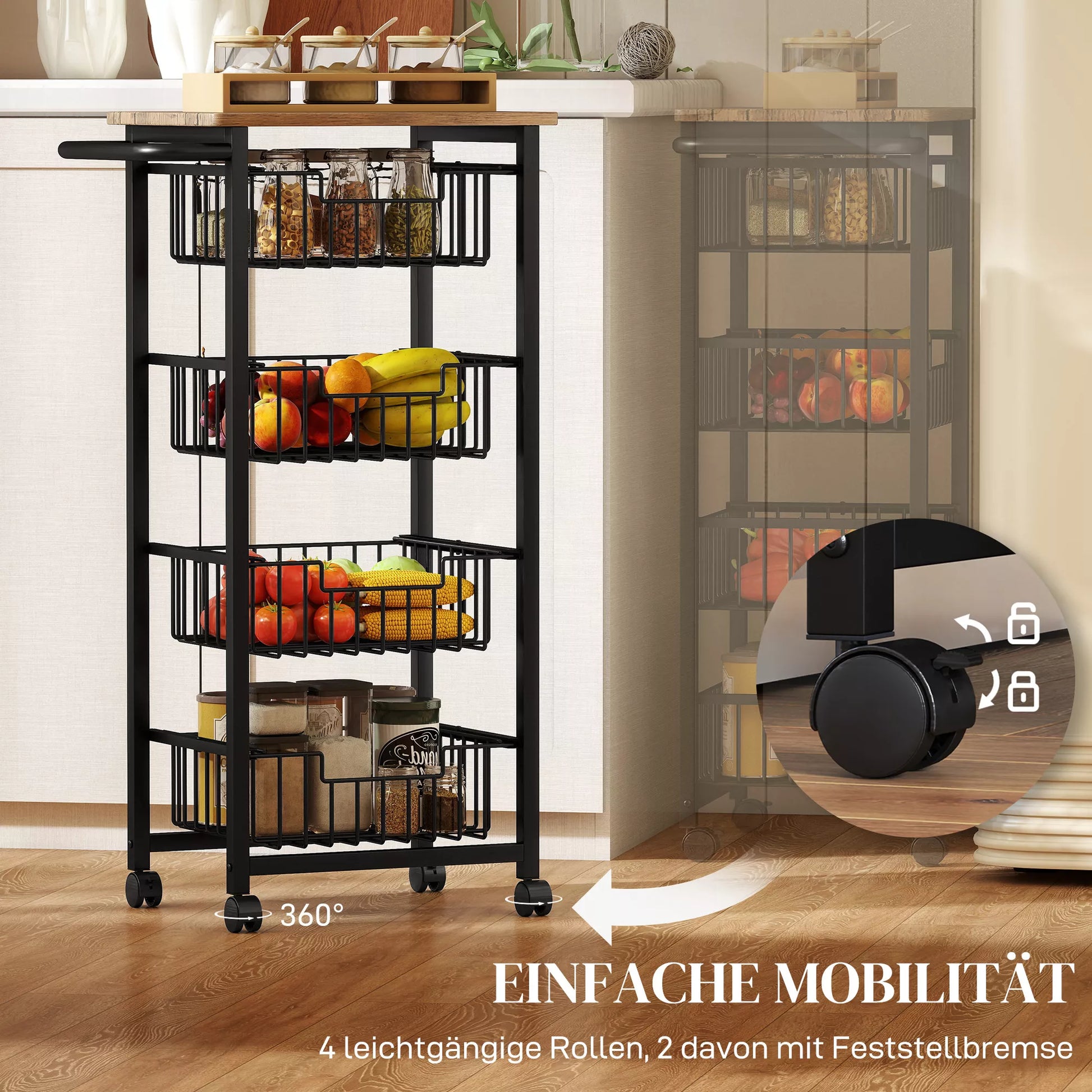 Padidinkite savo virtuvės funkcionalumą su šiuo vežimėliu ant ratukų! Šis praktiškas vežimėlis turi keturis ištraukiamus krepšius ir didelį stalviršį – puikiai tinka maistui ruošti ir rūšiuoti. Dėl keturių dirbtinės odos ratukų jį lengva judinti, o du iš jų yra su stabdžiais, užtikrinančiais stabilumą. Idealiai tinka kasdieniam naudojimui arba kitam vakarėliui su draugais ir šeima!