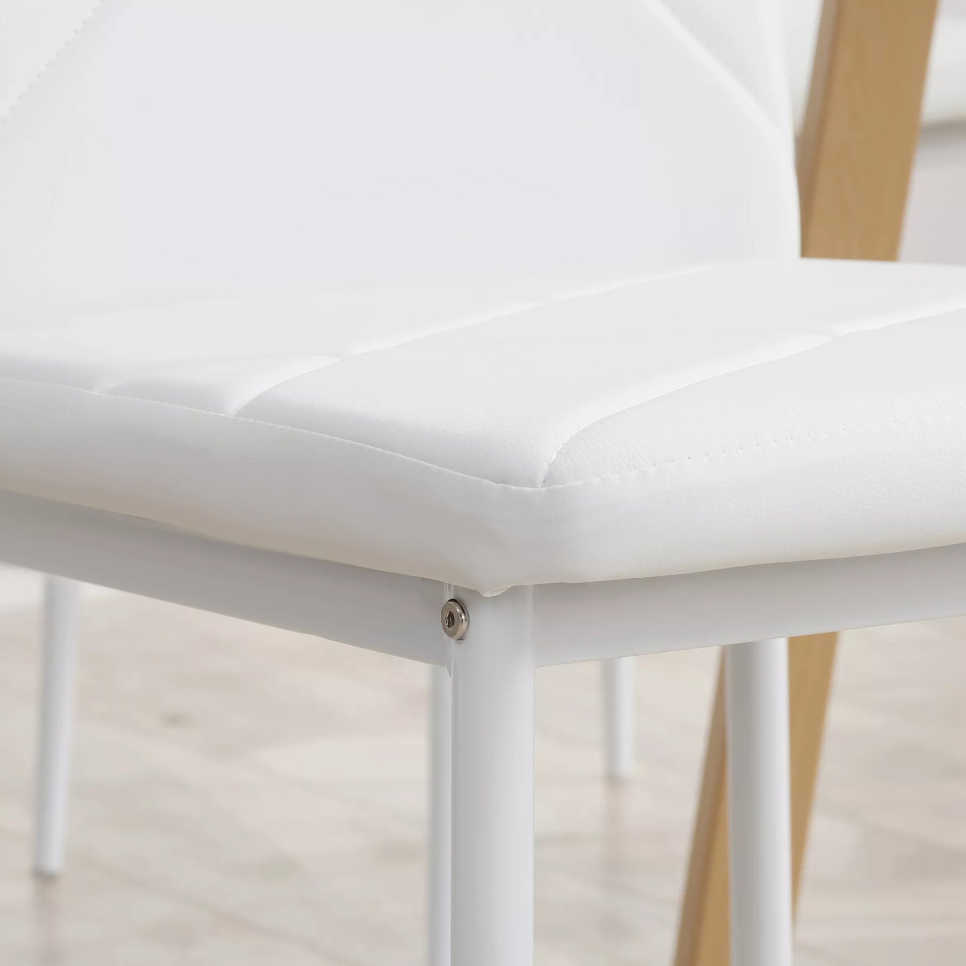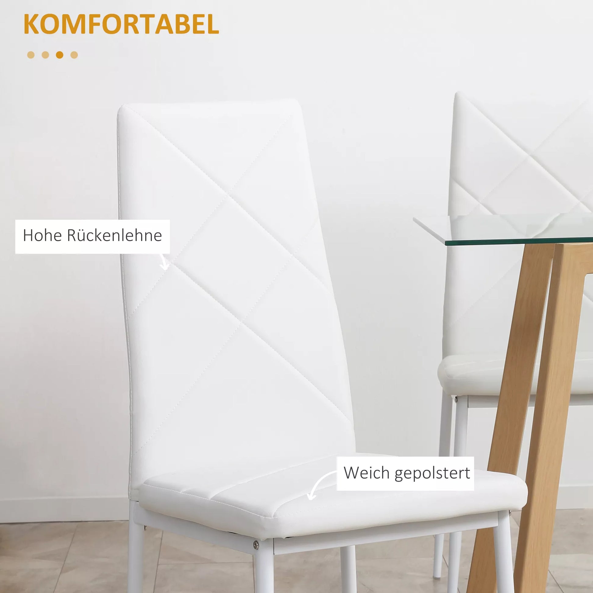 Sukurkite vietos kiekvienam jūsų svečiui: Virtuvės kėdžių komplektas iš susideda iš 4 modernių kėdžių. Jos tinka prie įvairių interjero stilių ir bet kokių namų. Aukšta atlošas užtikrina optimalų atramą. Minkšta sėdimoji dalis su dirbtinės odos apmušalu suteikia maksimalų komfortą. Plieninis rėmas daro valgomojo kėdes tvirtas ir tinkamas kasdieniam naudojimui. Siekiant išvengti įbrėžimų, kėdės turi grindų apsaugas.