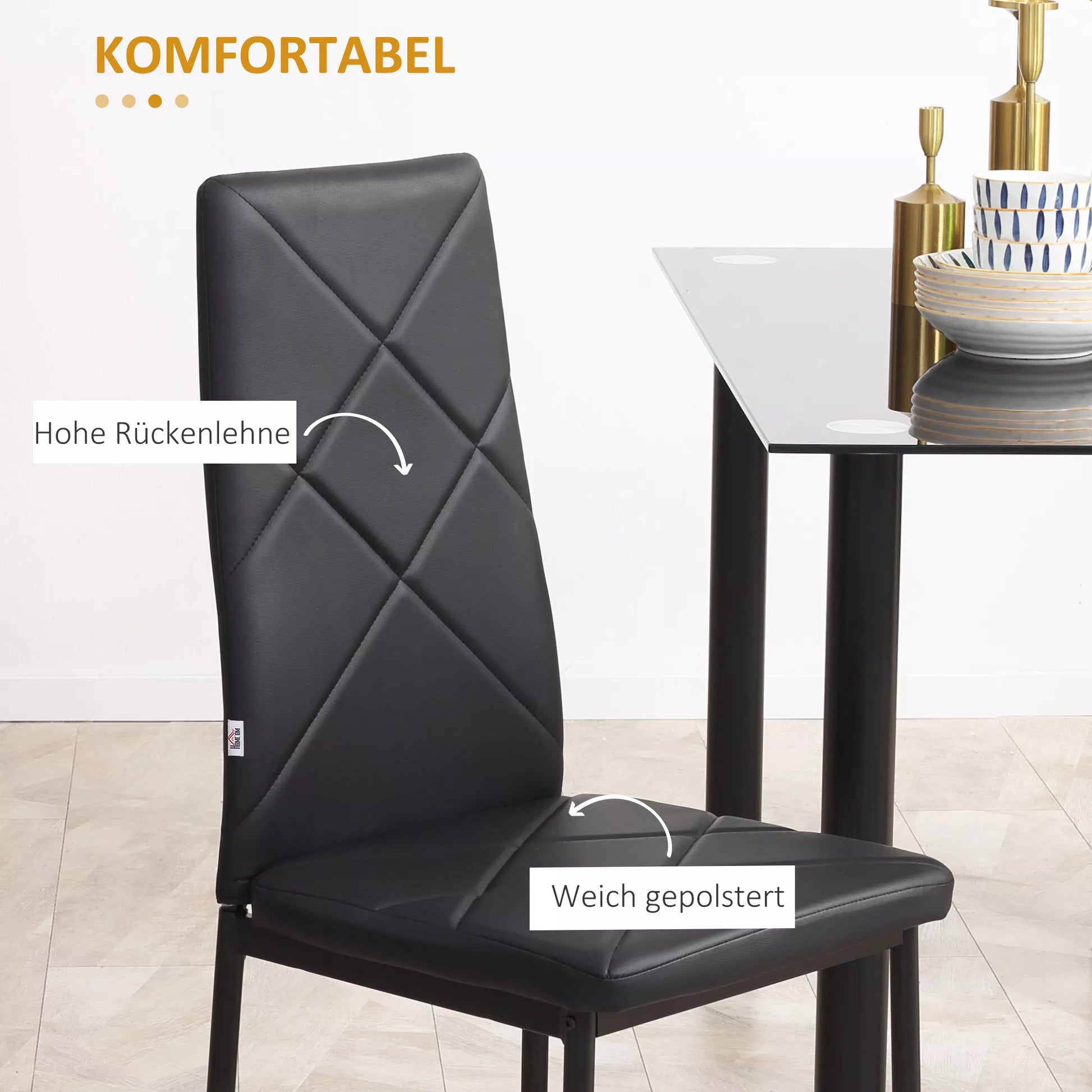 Sukurkite vietos kiekvienam jūsų svečiui: [Brand Name] virtuvės kėdžių komplektą sudaro 4 modernios kėdės. Jos dera prie įvairių interjero stilių ir tinka bet kuriuose namuose. Aukštas atlošas užtikrina optimalų atramą. Paminkštinta sėdynė su dirbtinės odos apmušalu suteikia maksimalų komfortą. Plieninė konstrukcija daro valgomojo kėdes tvirtas ir tinkamas kasdieniam naudojimui. Siekiant išvengti įbrėžimų, kėdės turi grindų apsaugas.