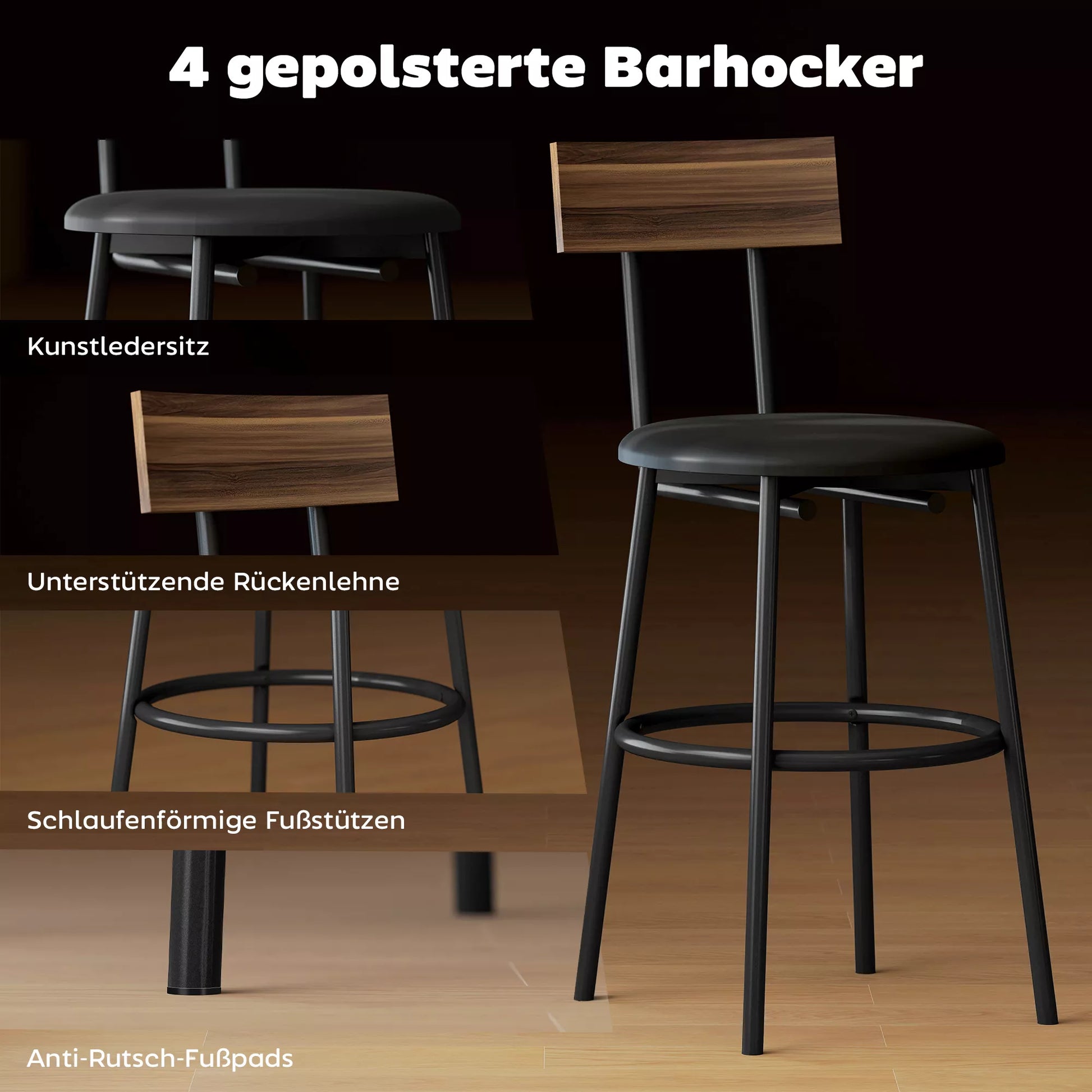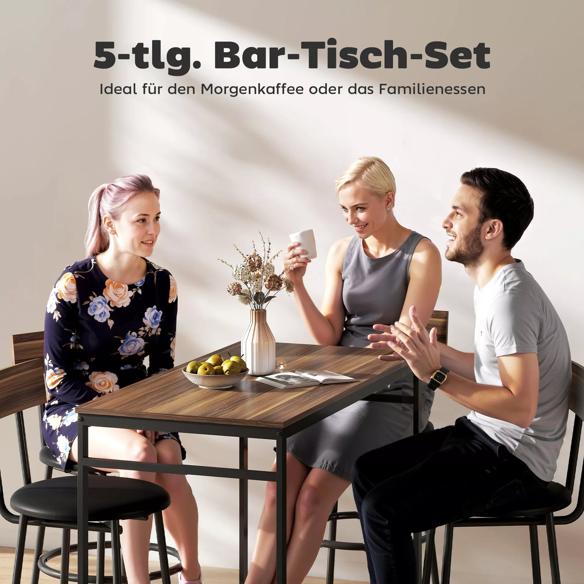 5 dalių baro stalo komplektas su 4 kėdėmis, pramoninio dizaino, virtuvei, valgomajam, medžio, plieno, rudos spalvos
