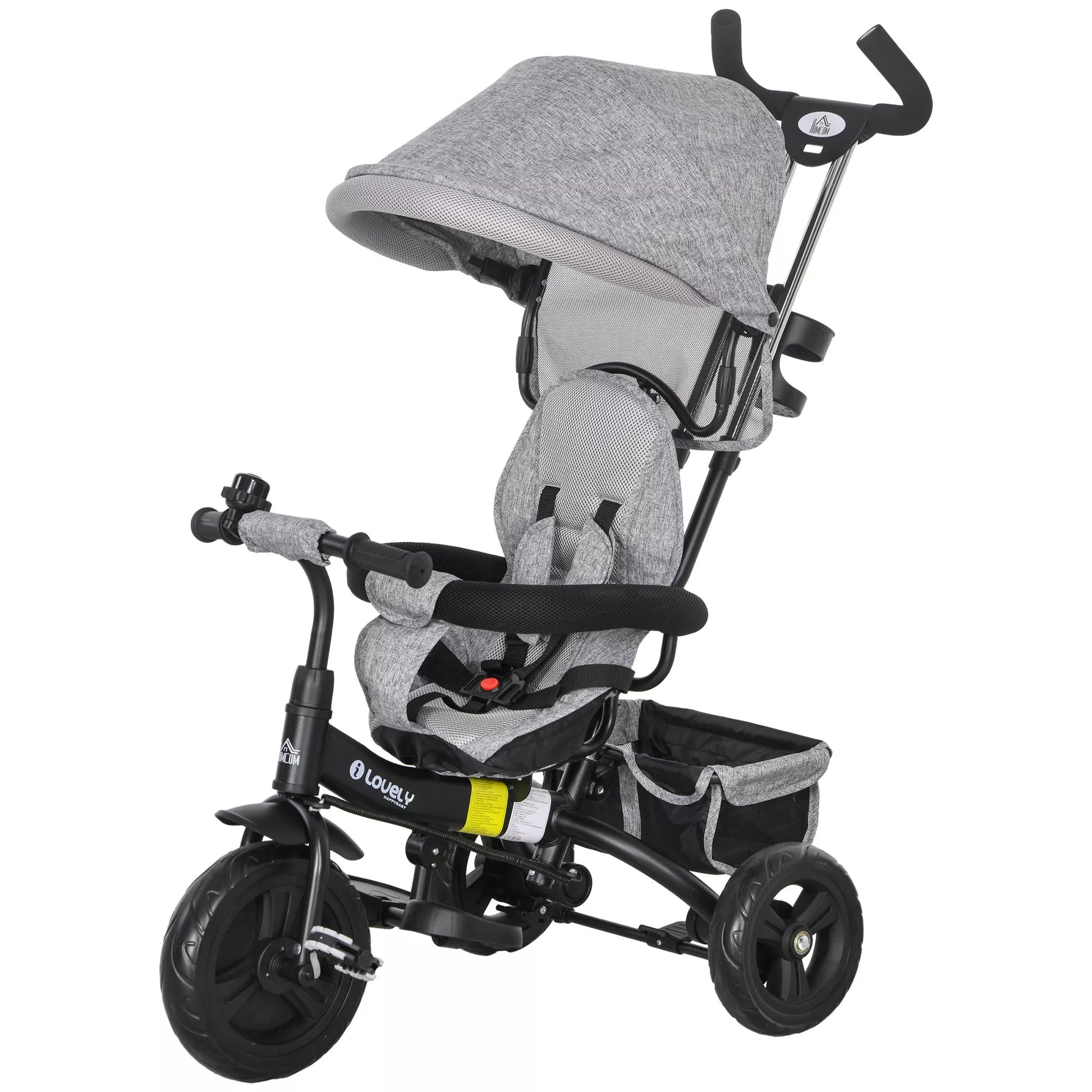 6in1 vaikiškas triratukas su stūmimo rankena, stogeliu, saugos diržu, daiktadėže, 1–5 metų vaikams, pilkas