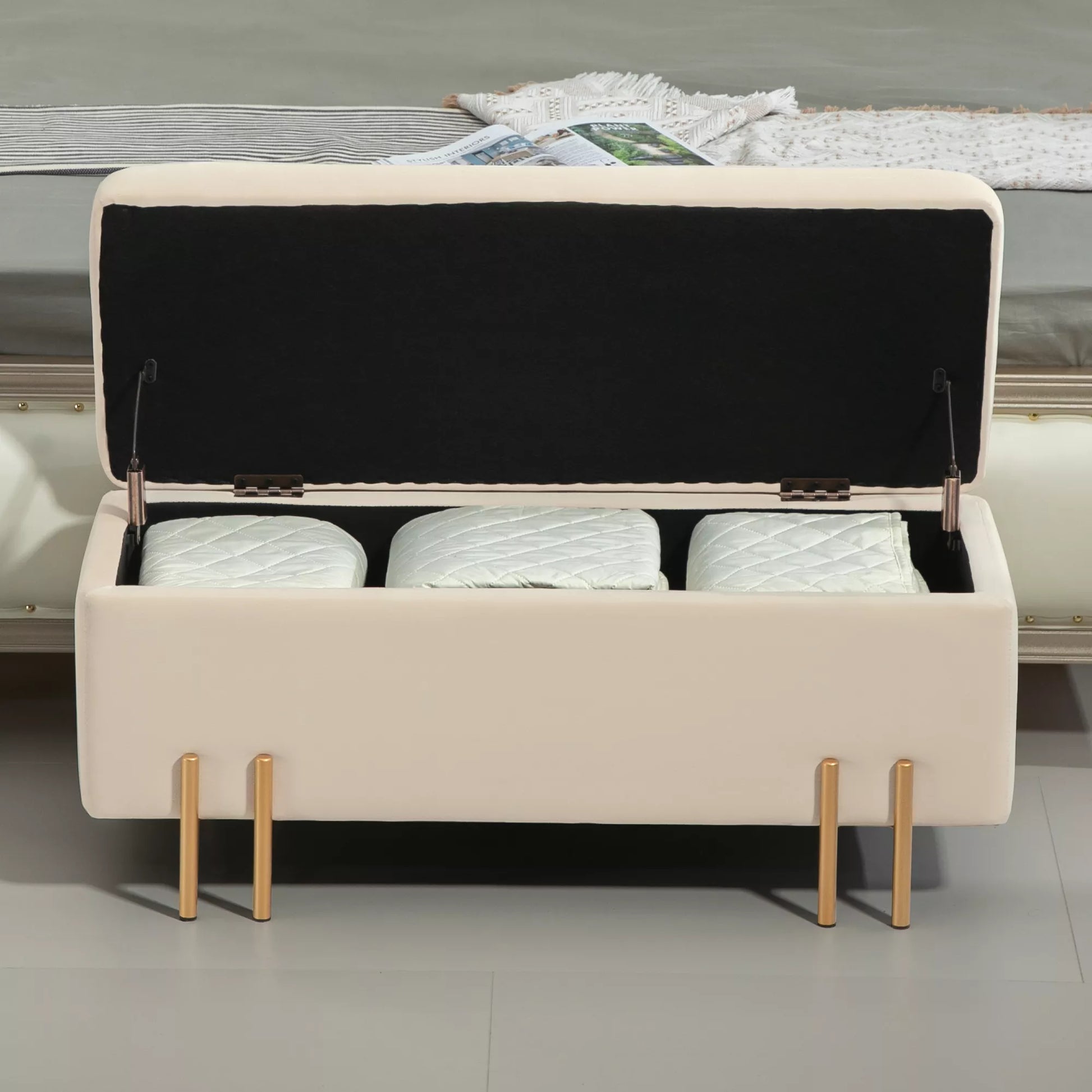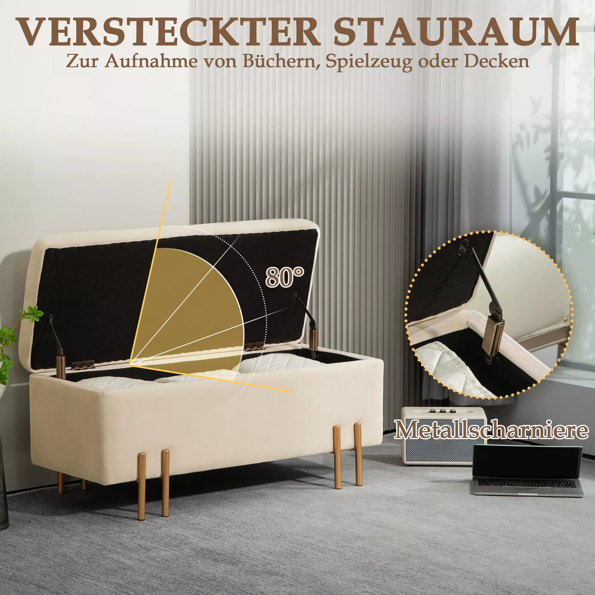 Minkšta banketė su daiktadėže, talpinė banketė, putplastis, metalas, gumuotas medis, 100 x 40 x 42 cm, smėlio spalvos