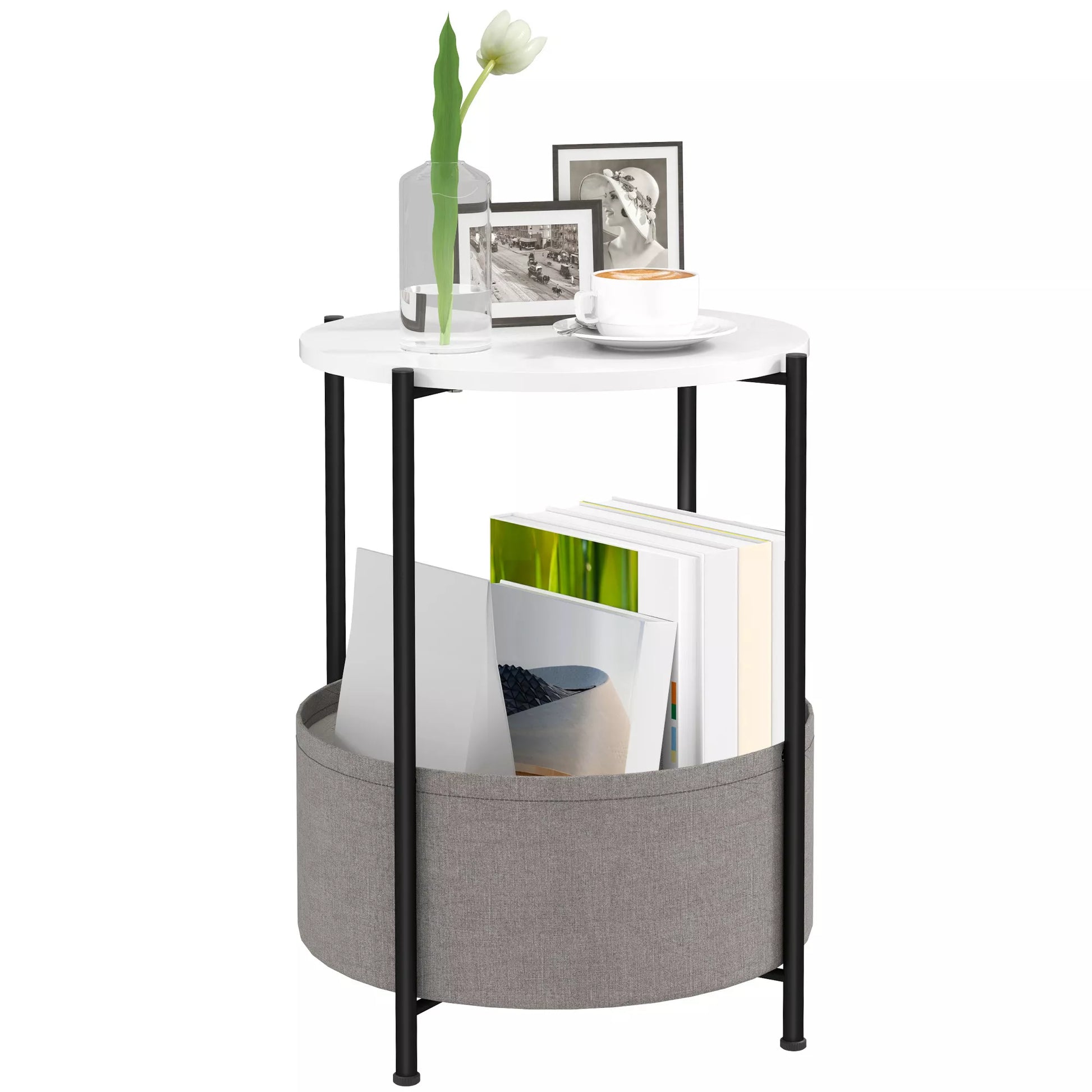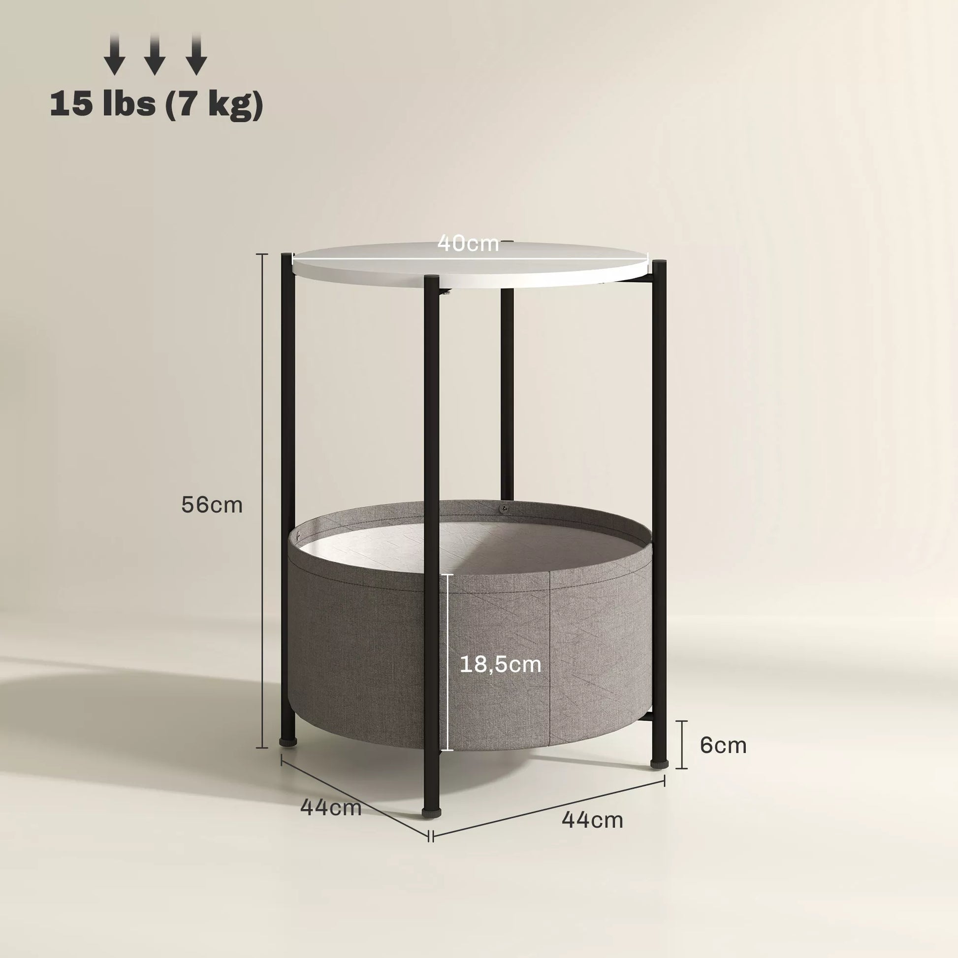 Apvalus staliukas su medžiaginiu krepšiu, 2 pakopų kavos staliukas svetainei, miegamajam, mažoms erdvėms, metalas, pilka+balta