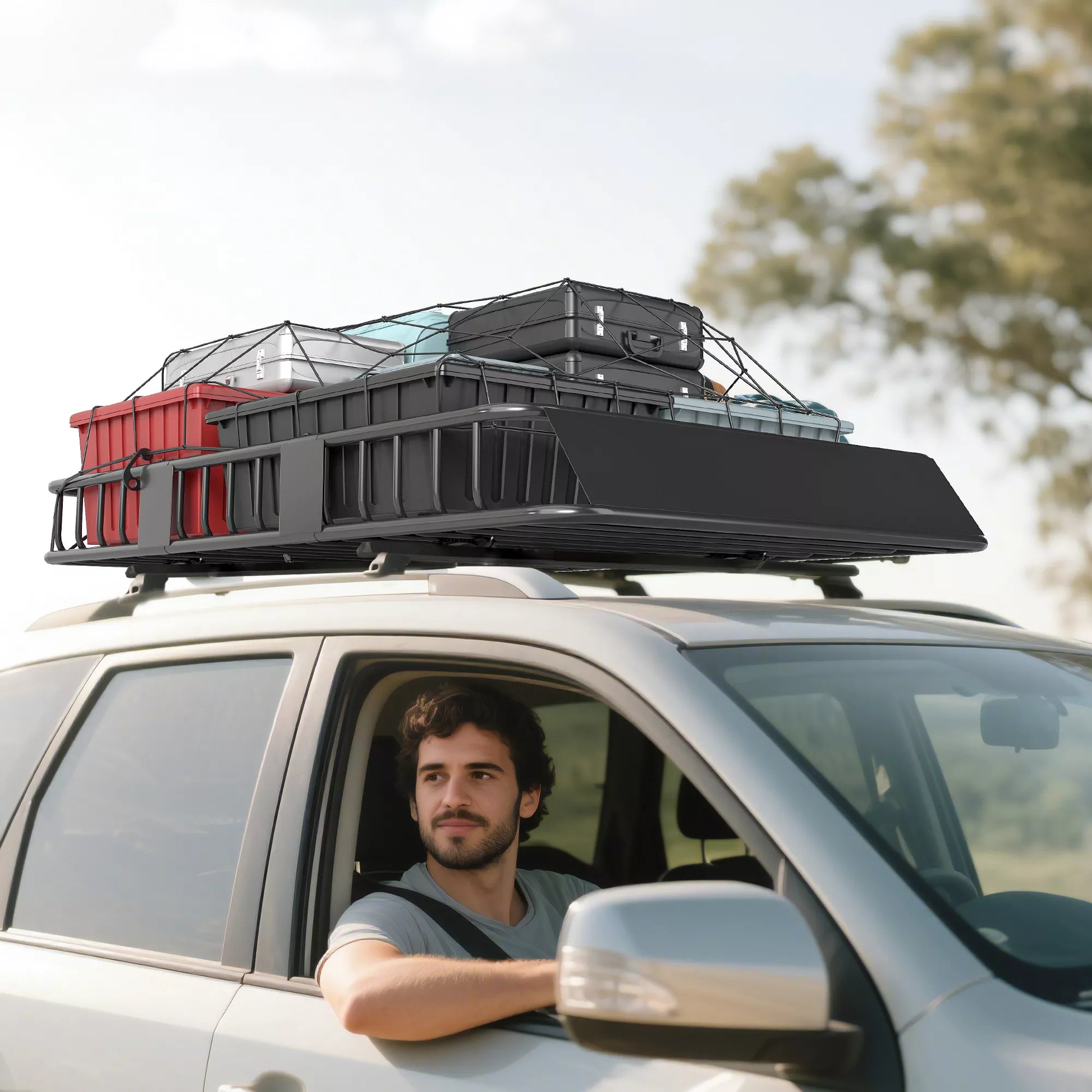 Universalus metalinis automobilio stogo bagažo krepšys, 162x99x16cm, keliamoji galia 100 kg, skirtas stovyklavimui, kepsniams, kelionėms automobiliu, juodas