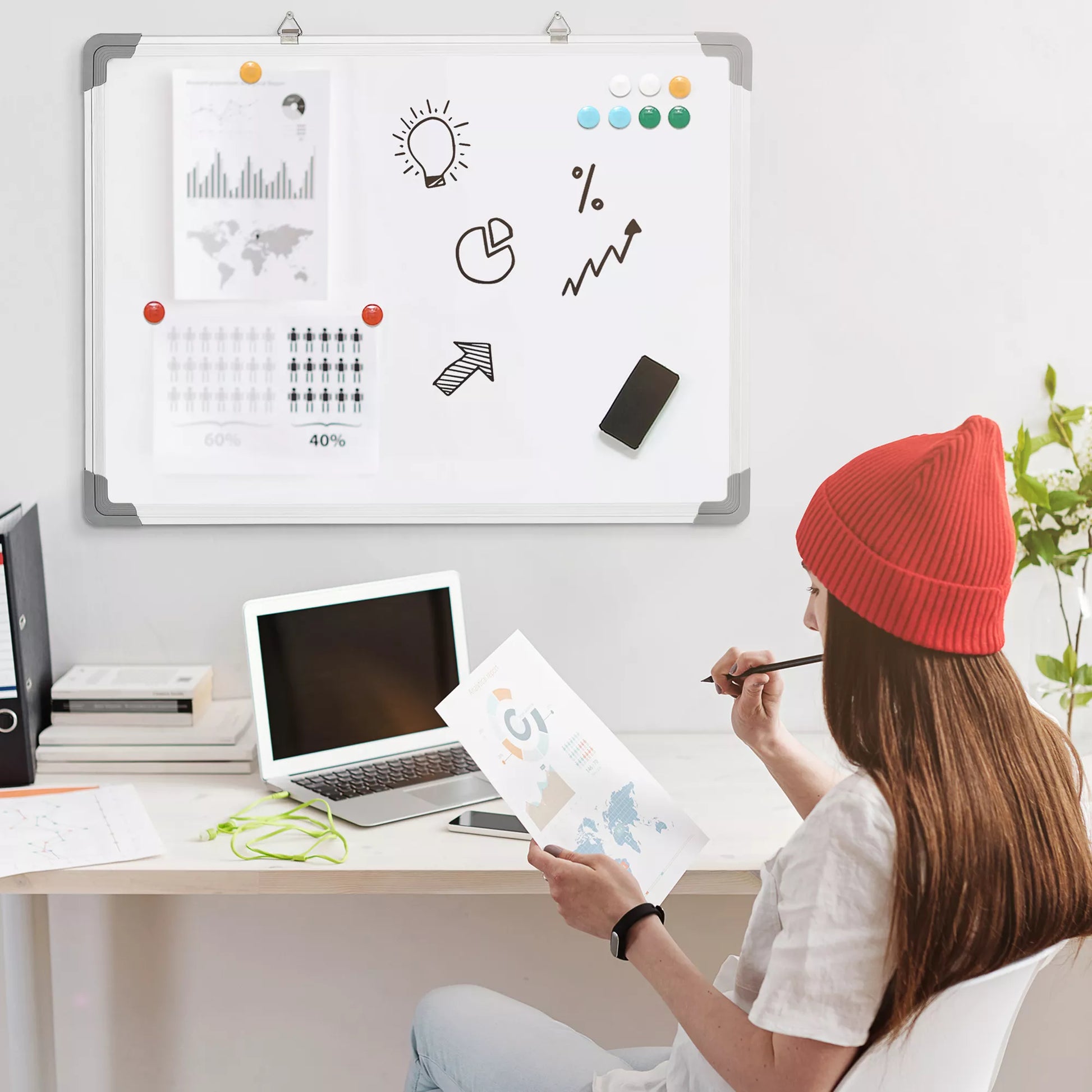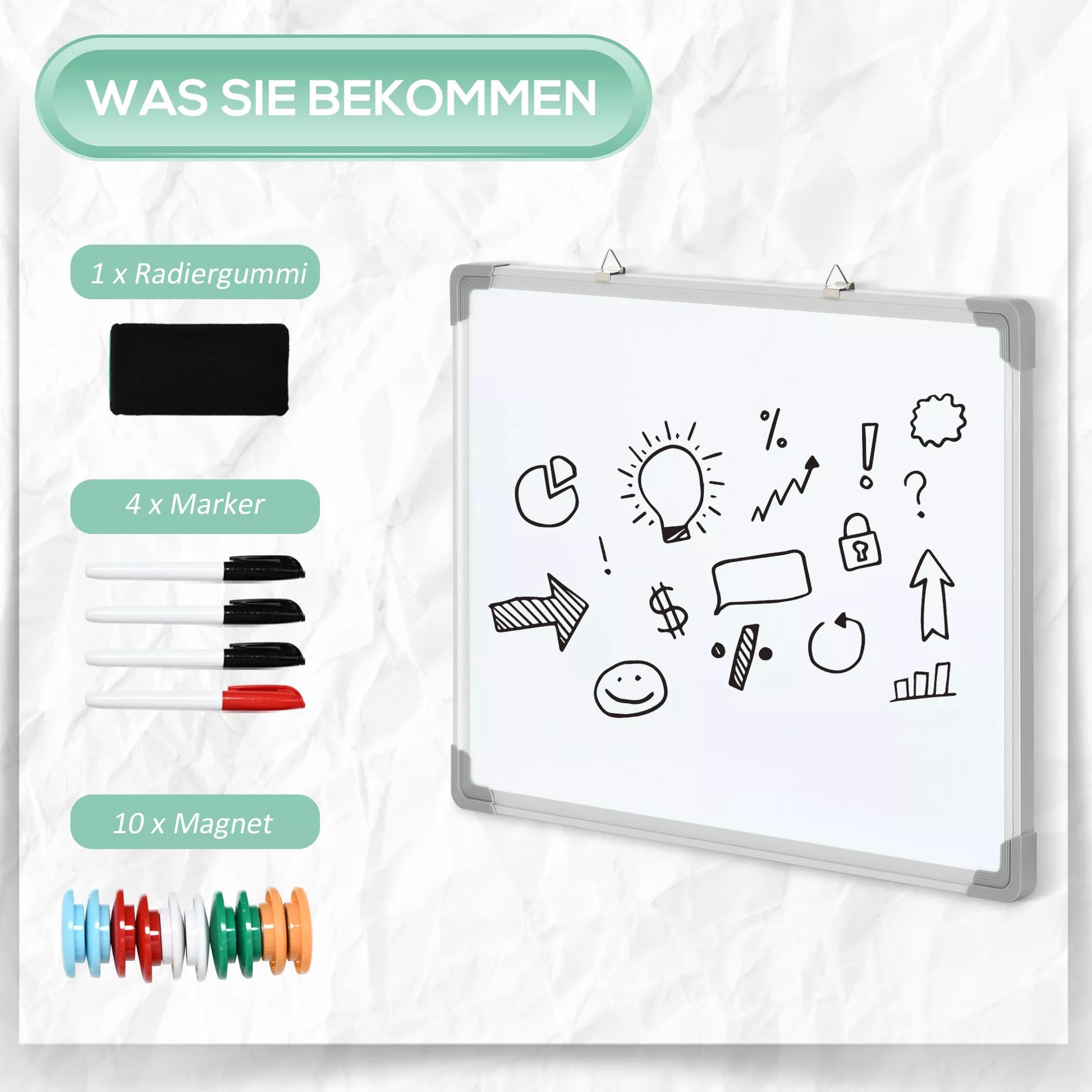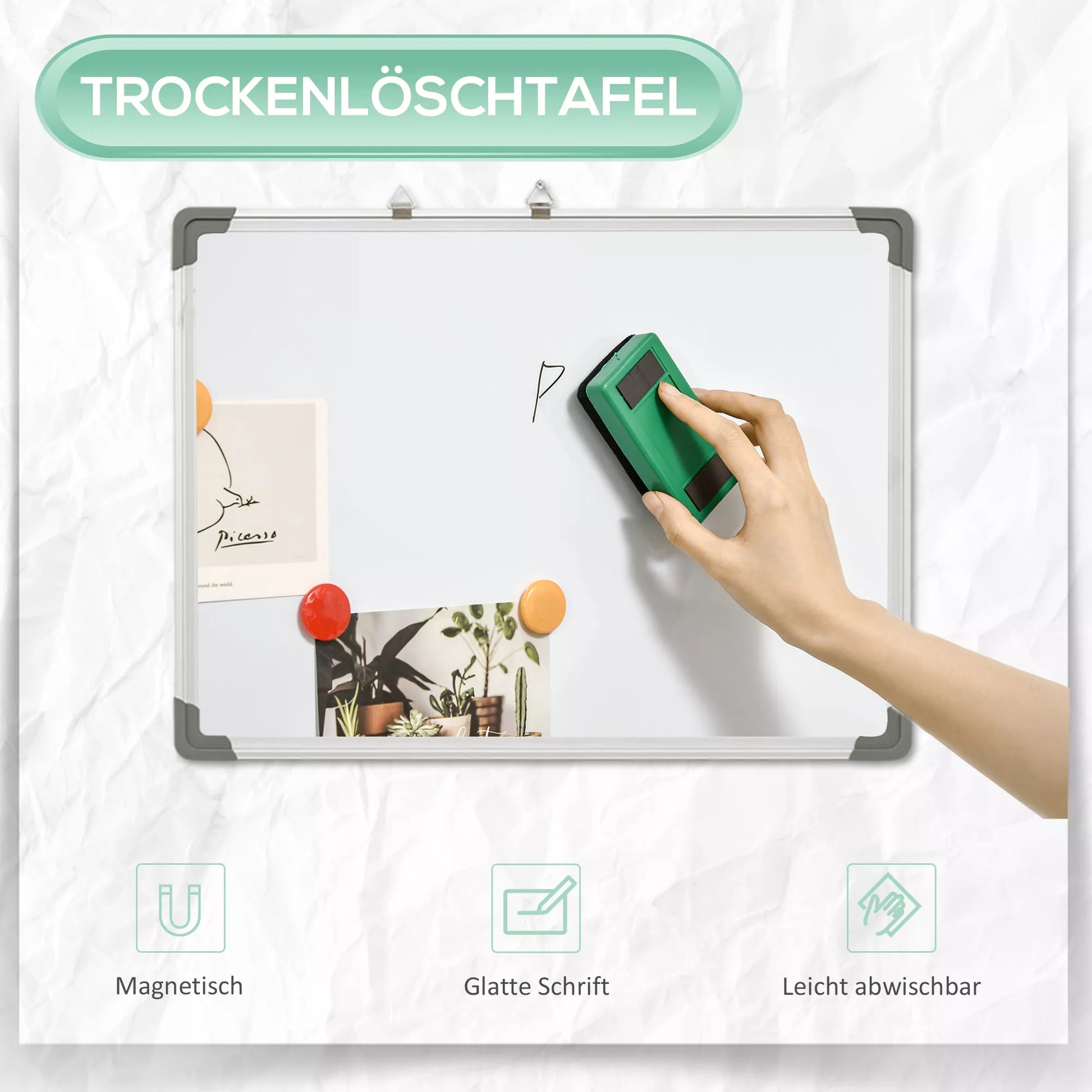 Ši balta lenta idealiai tinka naudoti namuose ar biure. Ji turi plastiko kampus, kad būtų išvengta sužalojimų. Naudodami pridedamą trintuką, lentą galite patogiai ir švariai nuvalyti. Komplekte yra keturi žymekliai; kiekvienu žymekliu galite parašyti iki 1000 žodžių. Išbandykite mūsų baltą lentą ir dirbkite efektyviau!