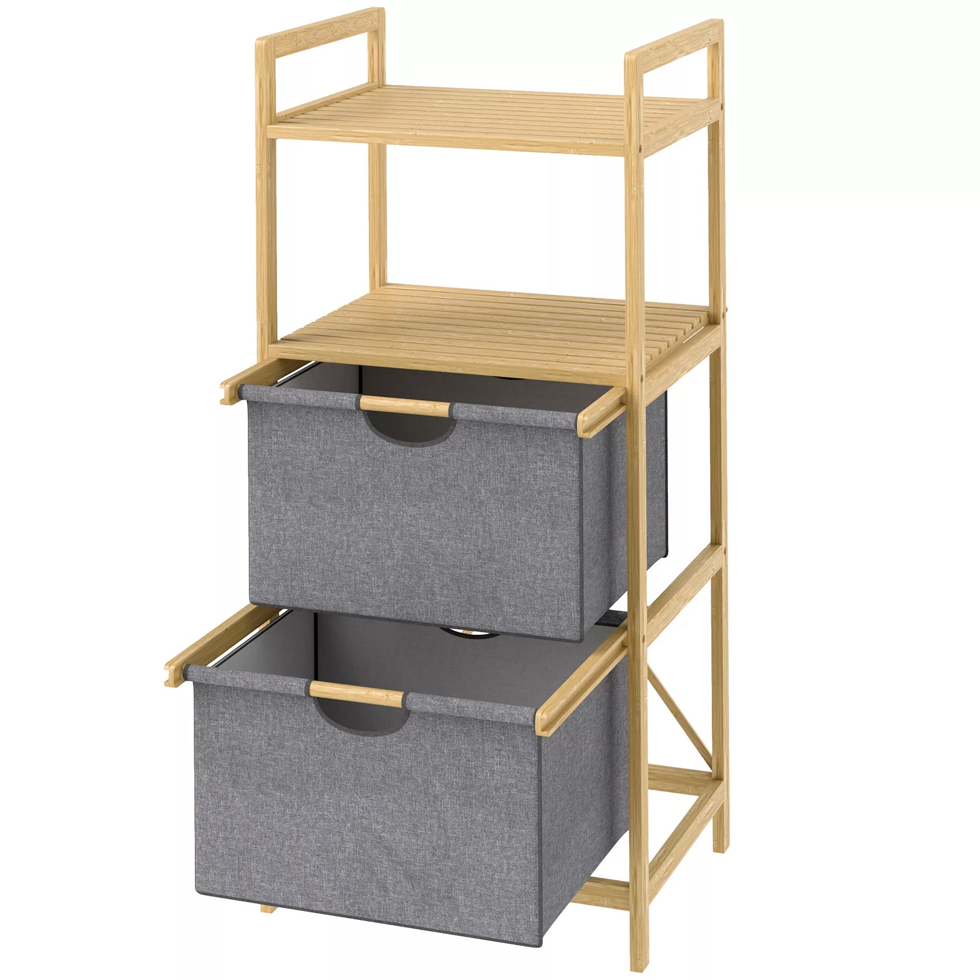 Bambukinis skalbinių stovas su 2 audinių krepšiais, atviromis lentynomis, vietą taupantis, natūralaus medžio