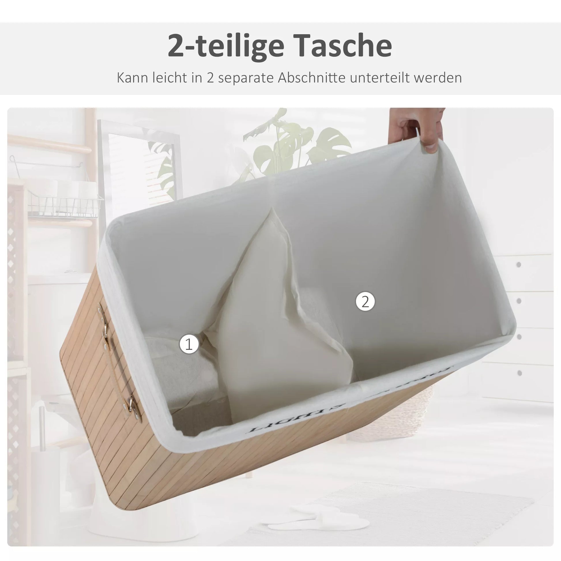 Bambukinė skalbinių dėžė su dangčiu, 100 L talpos, su PU rankenomis, drobinis skalbinių maišas, skalbinių rūšiuoklis skalbyklai, miegamajam, vonios kambariui, natūrali spalva