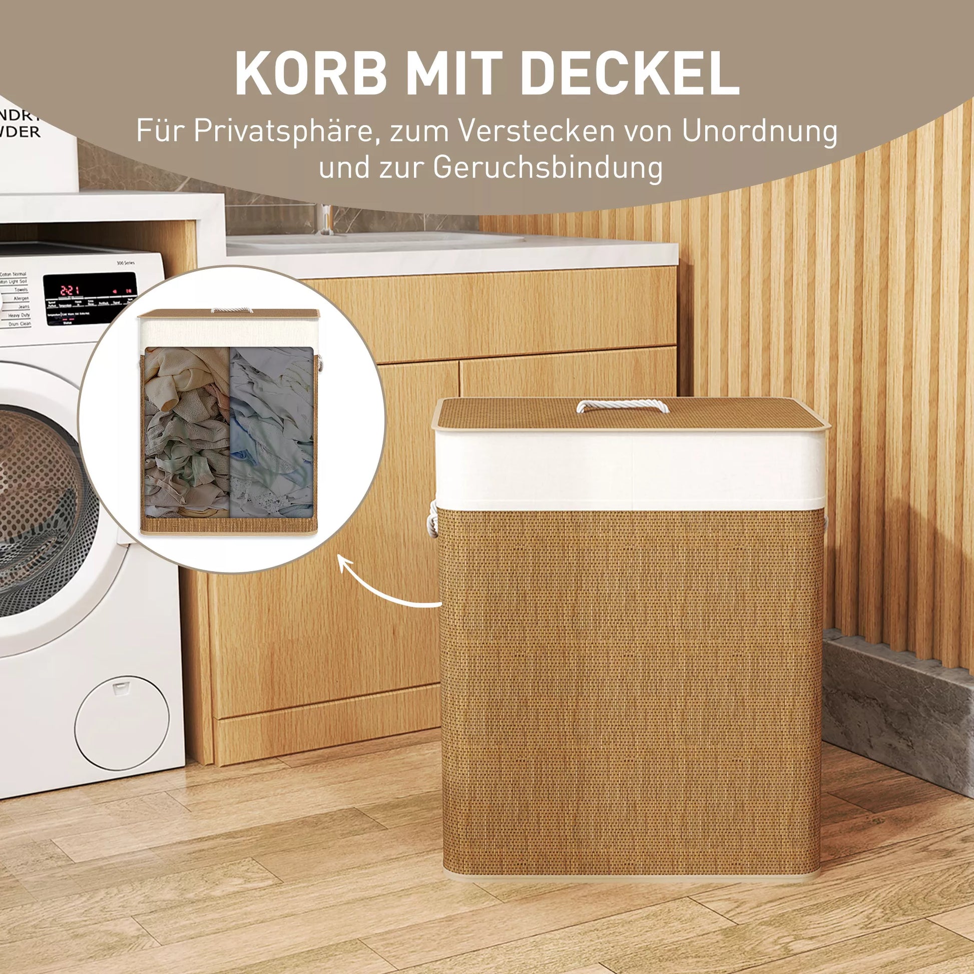 Bambukinė skalbinių dėžė su dangčiu, 2 skyrių, 100 L talpos skalbinių surinktuvas su virvinėmis rankenomis, išimamas skalbinių maišas