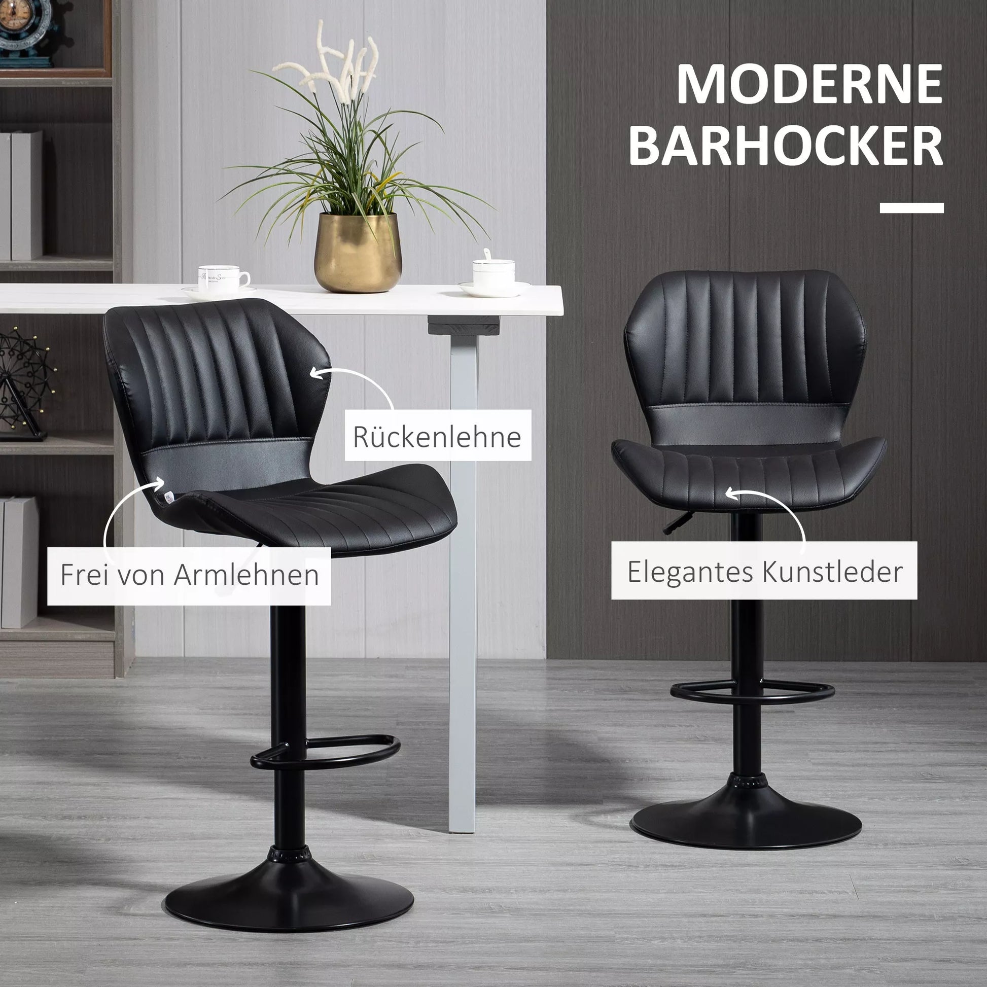 Atgaivinkite savo namus su šiais dviem skoningais HOMCOM baro kėdžių komplektais. Kriauklių formos atlošas yra ne tik dekoratyvus, bet ir leidžia ypač patogiai bei atsipalaiduoti. Jau su laisvai besisukančiu sėdynės mechanizmu ir praktišku kojų atramu, visada greitai rasite optimalią padėtį. Švelnus aukščio reguliavimas leidžia lengvai pritaikyti baro kėdę prie įvairių stalviršių ir stalų aukščių.