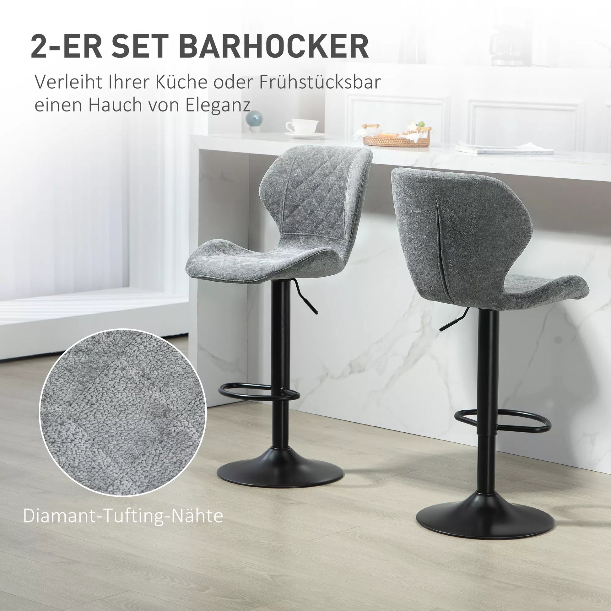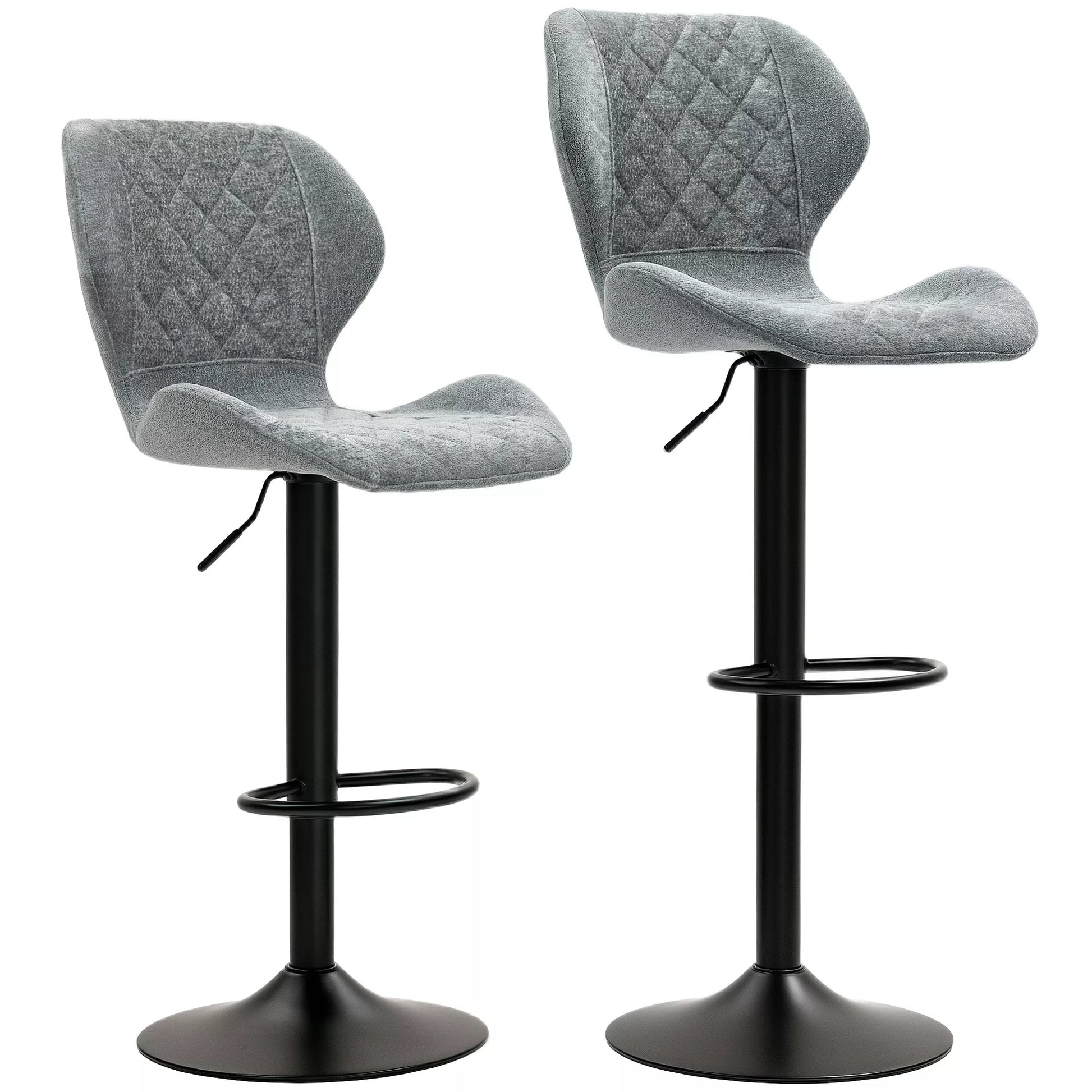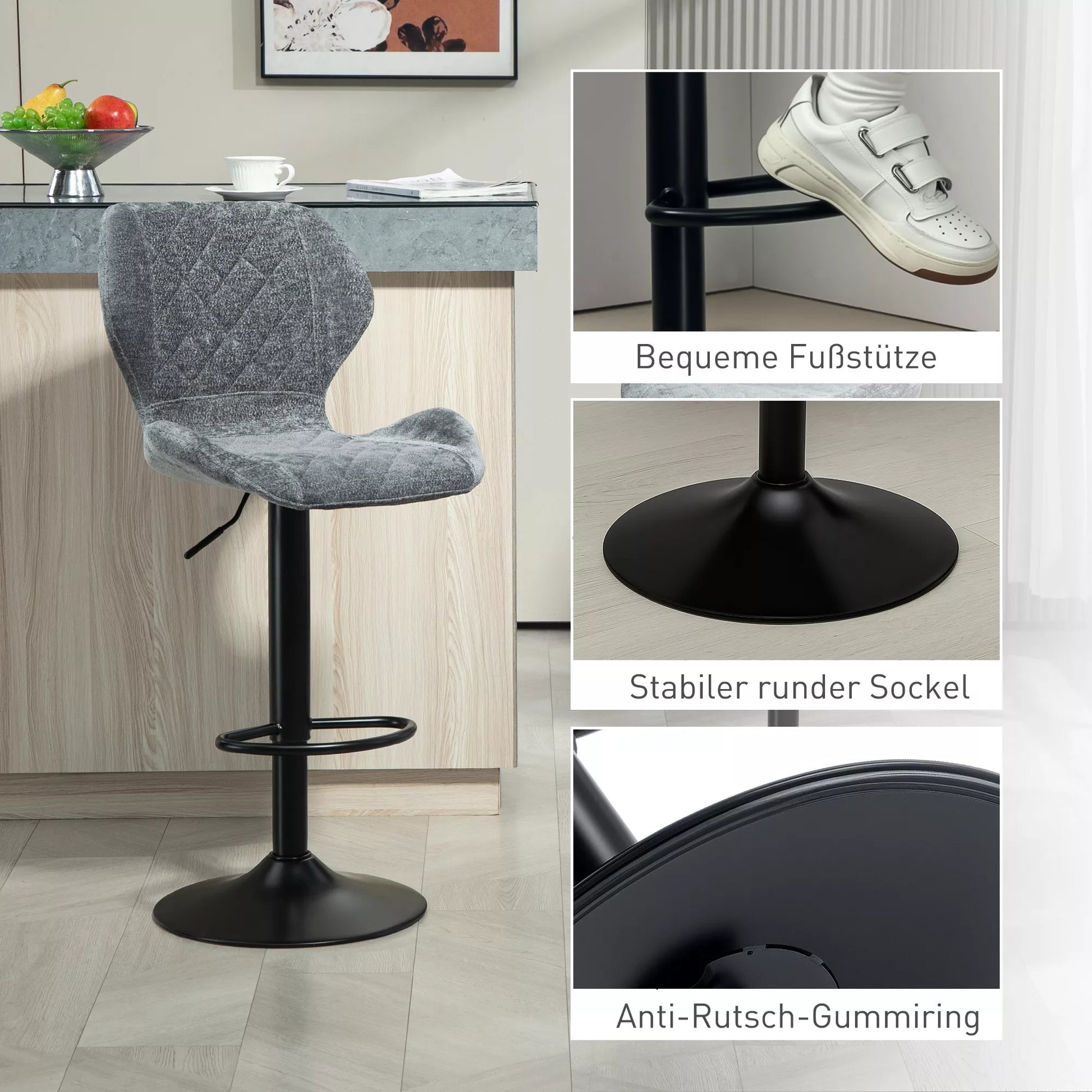 Baro kėdės 2 vnt. komplektas, aukščio reguliuojamos virtuvės kėdutės su atlošu, dujiniu keltuvu, atrama kojoms, pasukamos, pilkos