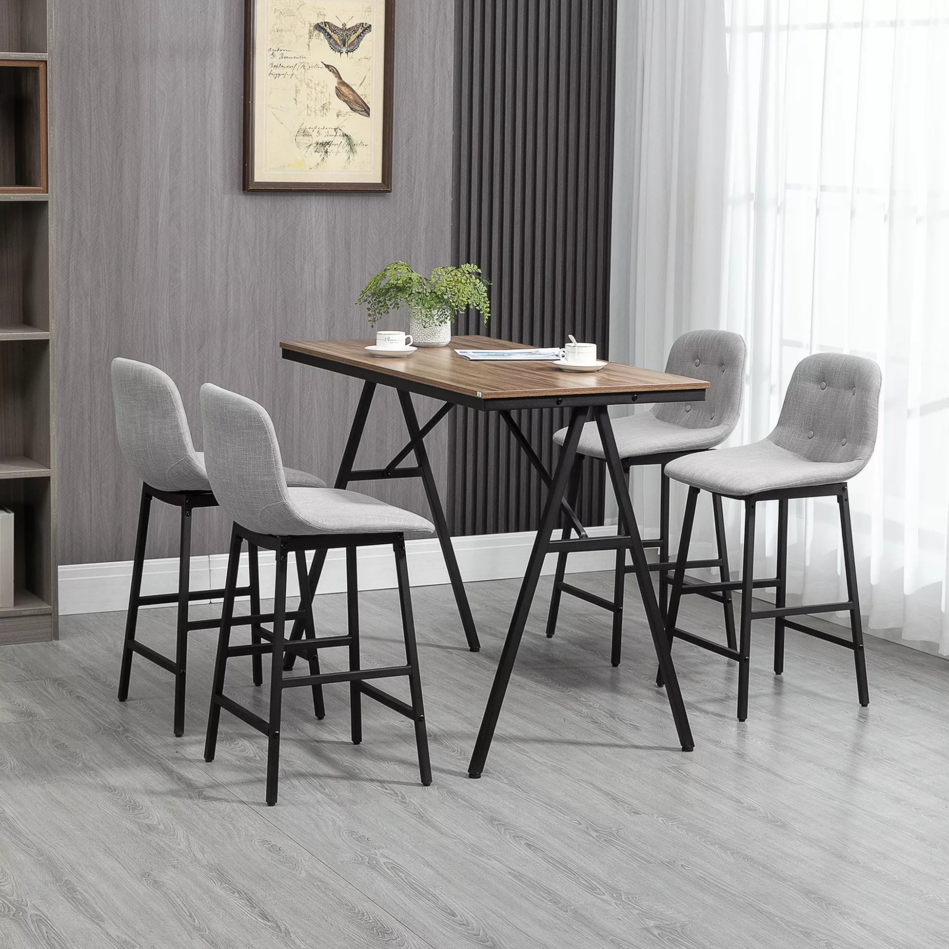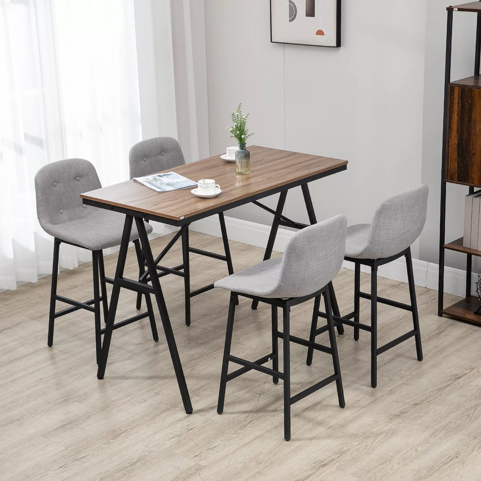 Paversti savo kambarį į jaukią valgomojo kambarį su 5 dalių baro stalo komplektu. Šis valgomojo komplektas yra stilingas ir jaukus sprendimas kasdieniams pietums, žaidimų vakarams ar darbo valandoms. Modernus pramoninis valgomojo komplekto dizainas puikiai dera su bet kokia patalpa ir sukuria šiltą atmosferą. Idealiai tinka mažoms patalpoms, suteikia papildomų sėdėjimo vietų ir paverčia jūsų namus bendravimo ir poilsio vieta.