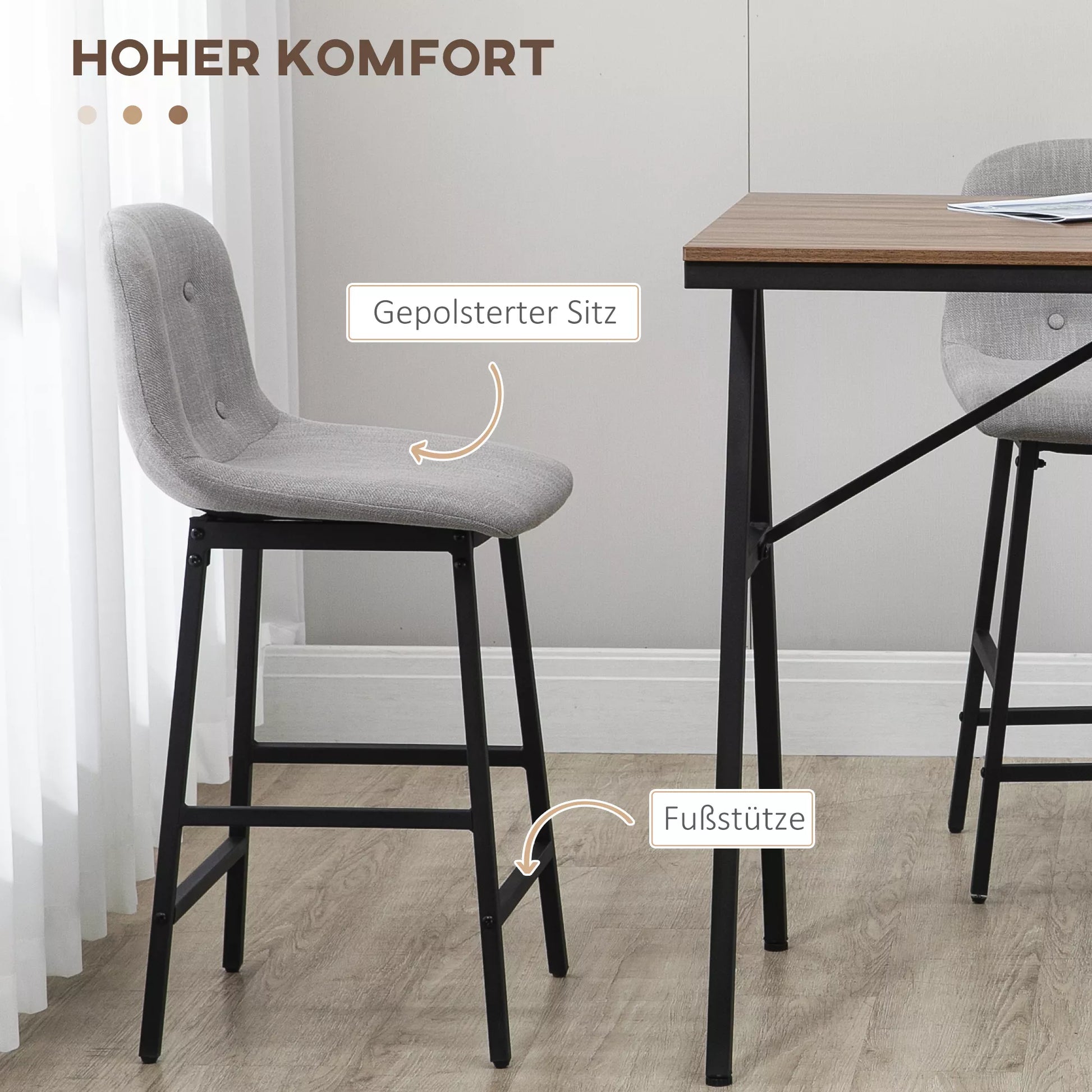 - ✔ Reguliuojamos baro stalo komplekto kojos apsaugo grindis nuo įbrėžimų ir užtikrina stabilumą