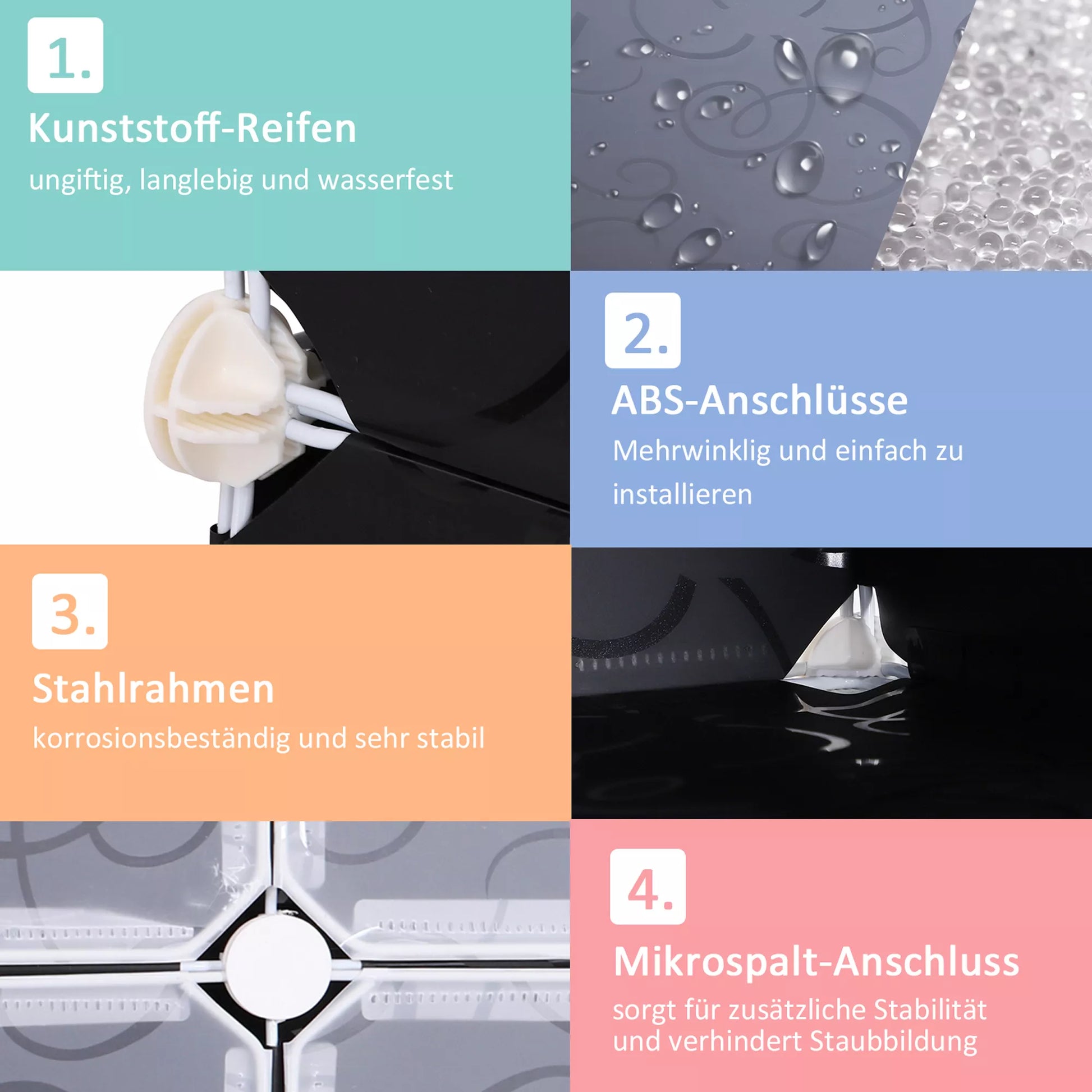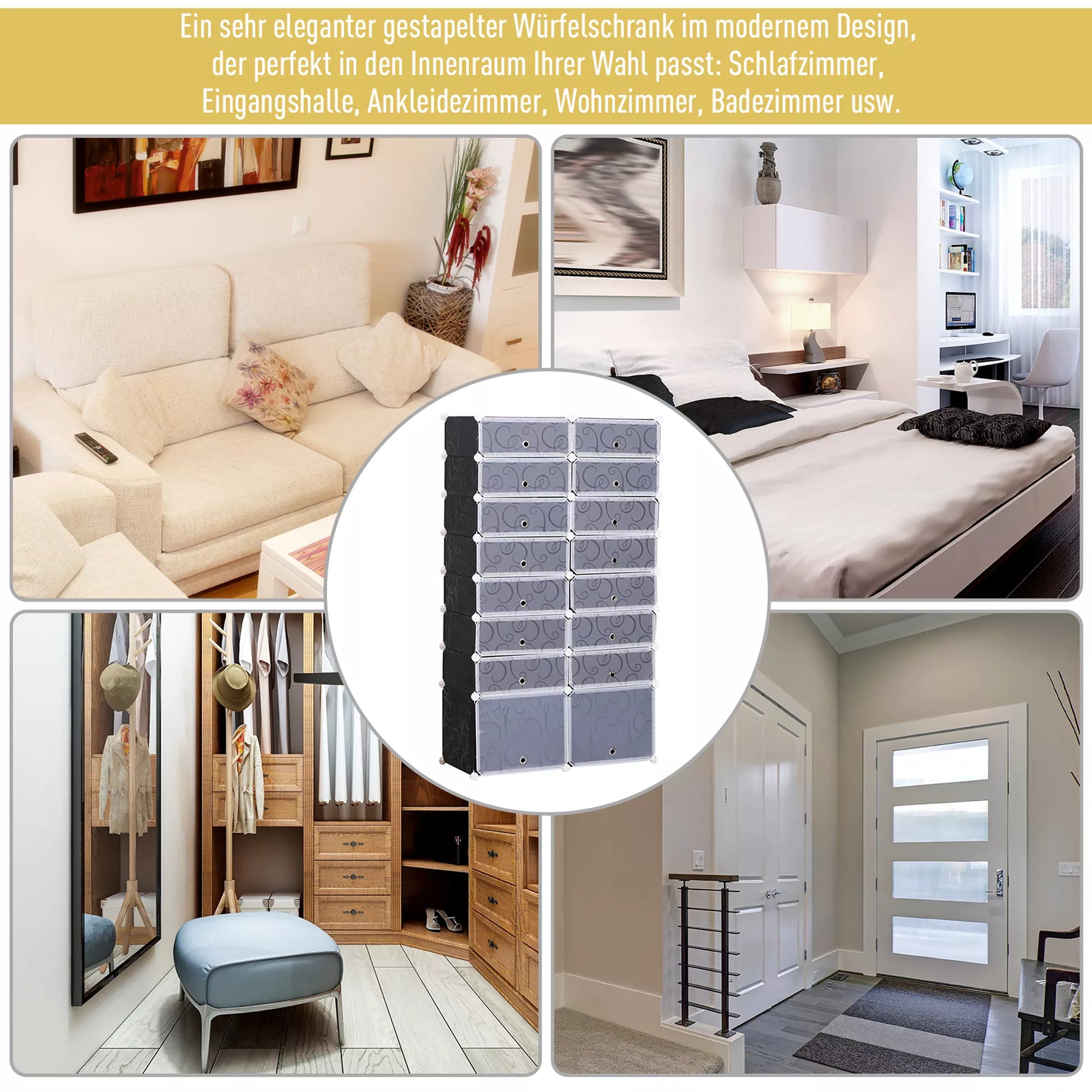 Šio [Brand Name] modulinio spintos surinkimas yra ne tik paprastas ir praktiškas, bet ir linksmas! Suteikite laisvę savo fantazijai ir puikiai pritaikykite spintą savo patalpoms – net po laiptais ar siaurose nišose galėsite sutalpinti savo batų spintą dėl lankščios jungčių sistemos. Plastikinės plokštės ir milteliais dengtas metalinis rėmas yra ilgaamžiai ir ypač lengvai prižiūrimi. Čia viskas ras savo vietą, o per pusiau permatomas baltas dureles greitai rasite tai, ko ieškote. Nesvarbu, ar kaip batų spintą, kambario pertvarą, ar universalią daiktų laikymo vietą – ši spintos sistema su savo stilingu juodai baltu dizainu ir gražiu raštu yra elegantiškas sprendimas jūsų daiktų laikymui.