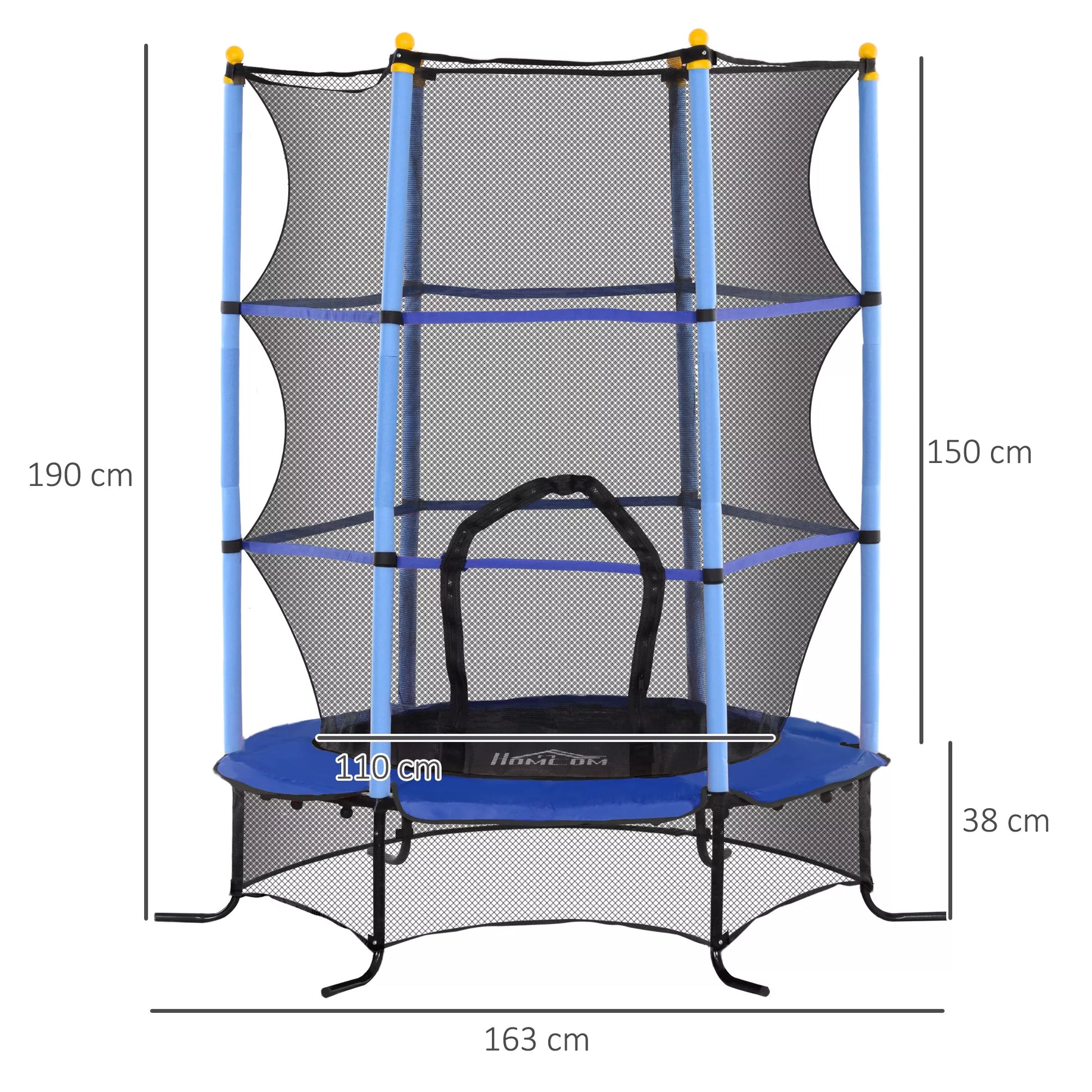 Tramplinas vaikams, Ø163 cm, su saugos tinklu, tinkamas naudoti lauke ir viduje, apkrova iki 50 kg, plienas, plastikas, mėlynas