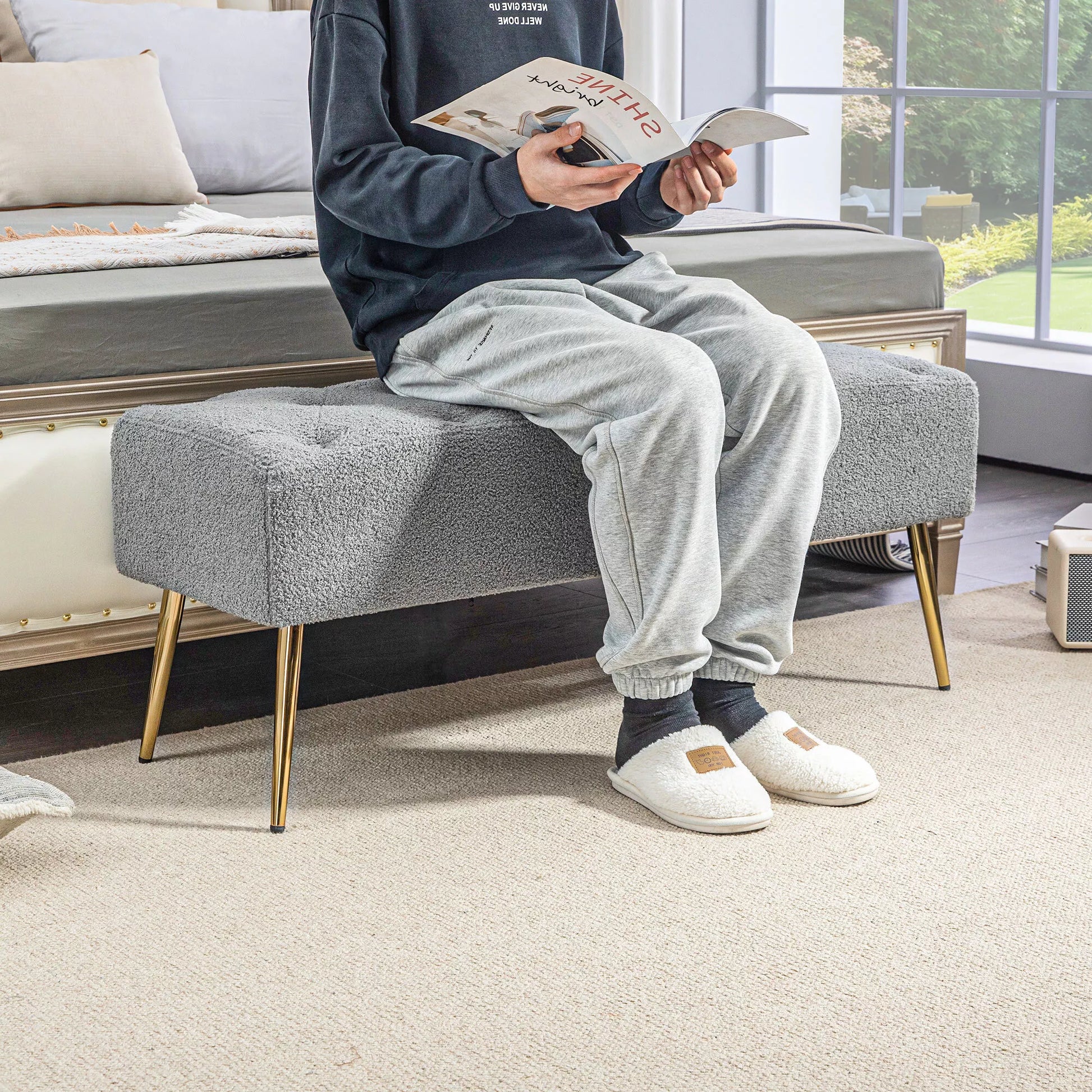 - ✔ Modernaus stiliaus suolas prie lovos su paauksuotomis kojomis ir sagų dygsniavimu kaip dekoratyvinis akcentas