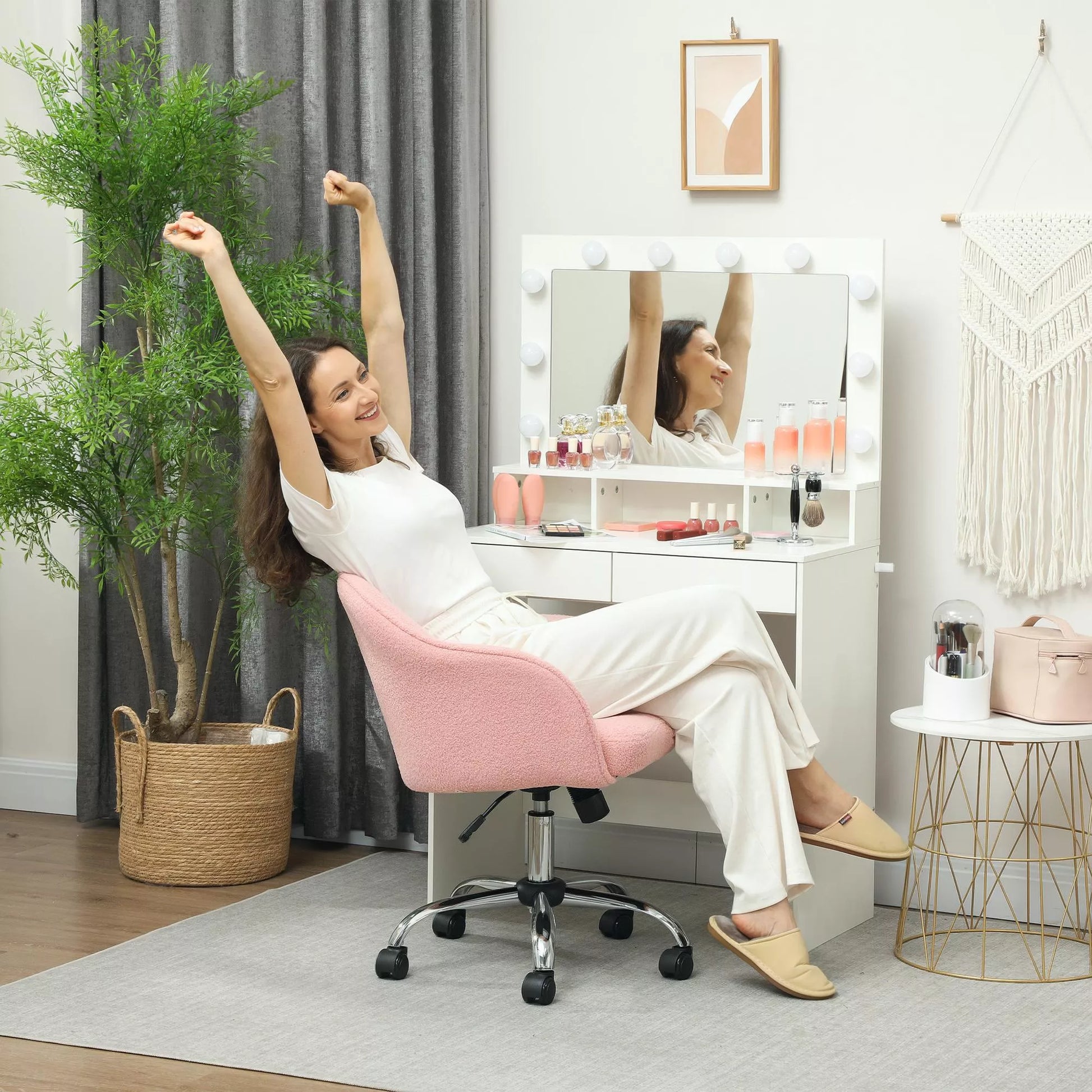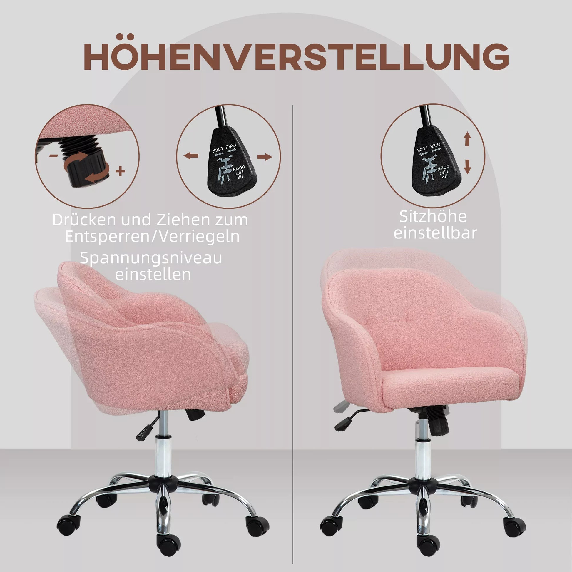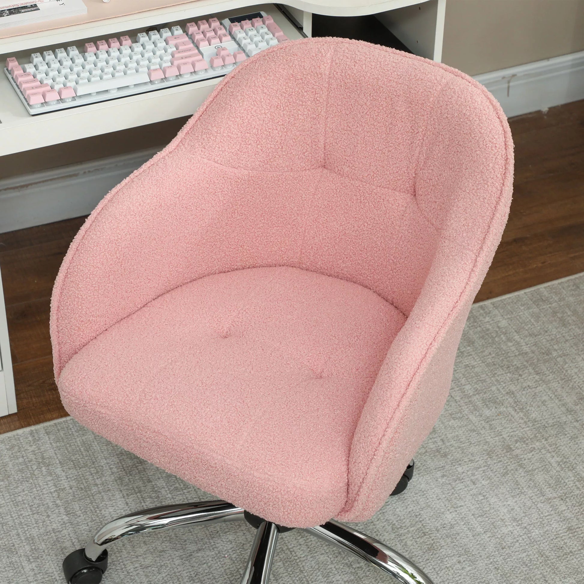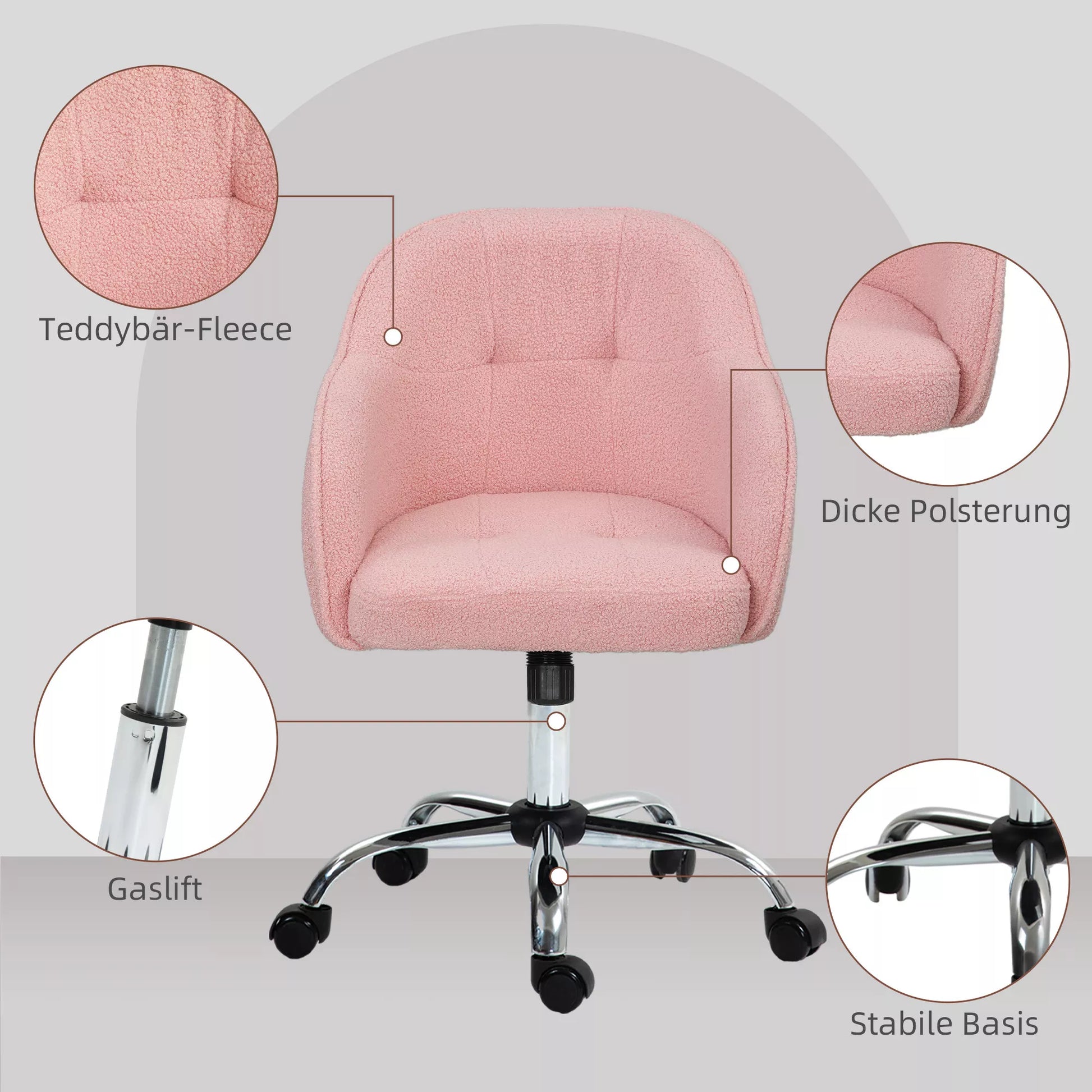Namų biuro kėdė, Ergonomiška rašomojo stalo kėdė su svyravimo funkcija, Teddy aksomo išvaizda, 56 x 61 x 86 cm, Rožinė