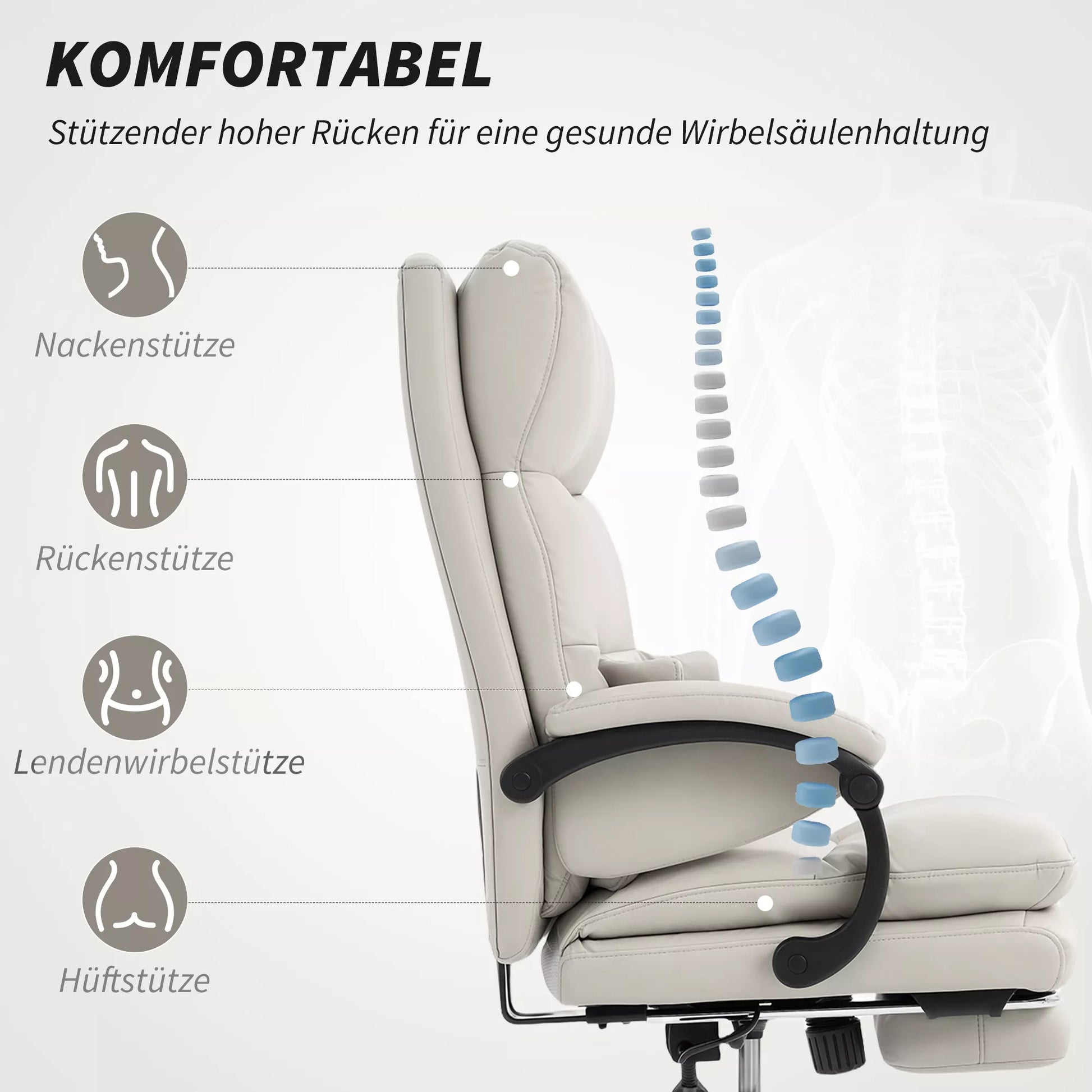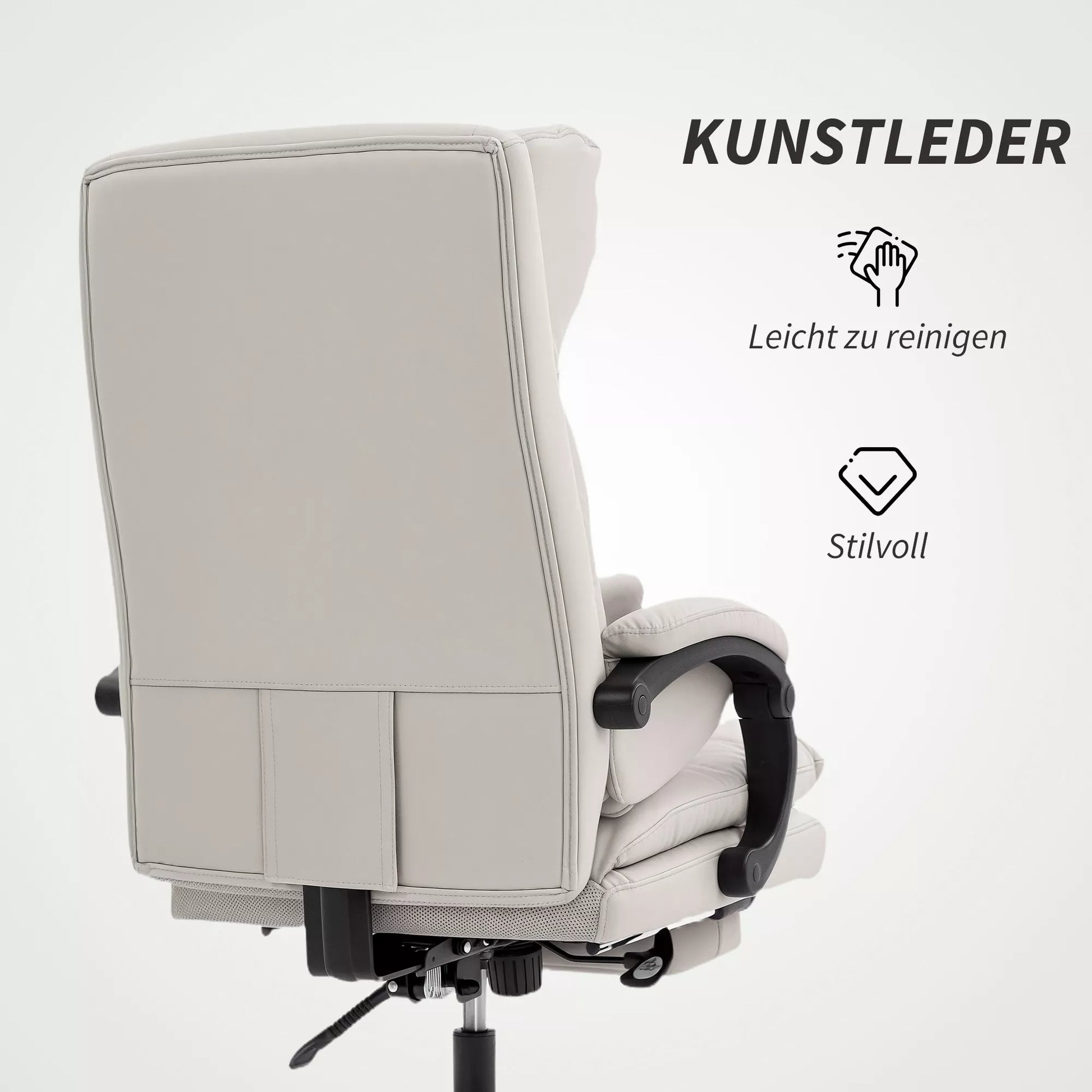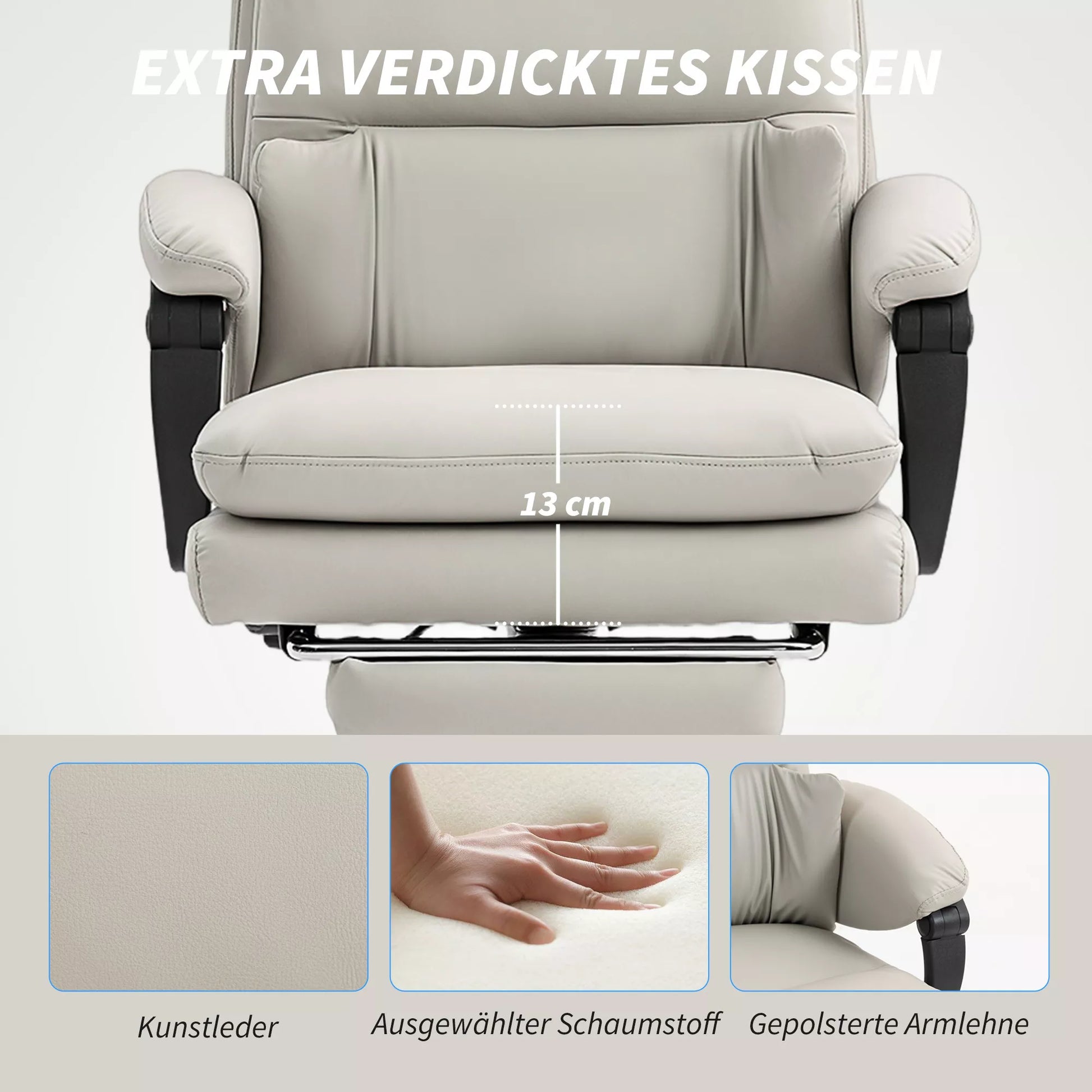 Biuro kėdė su reguliuojamu aukščiu, juosmens atrama, porankiais, atrama kojoms, pagaminta iš dirbtinės odos, šviesiai pilka