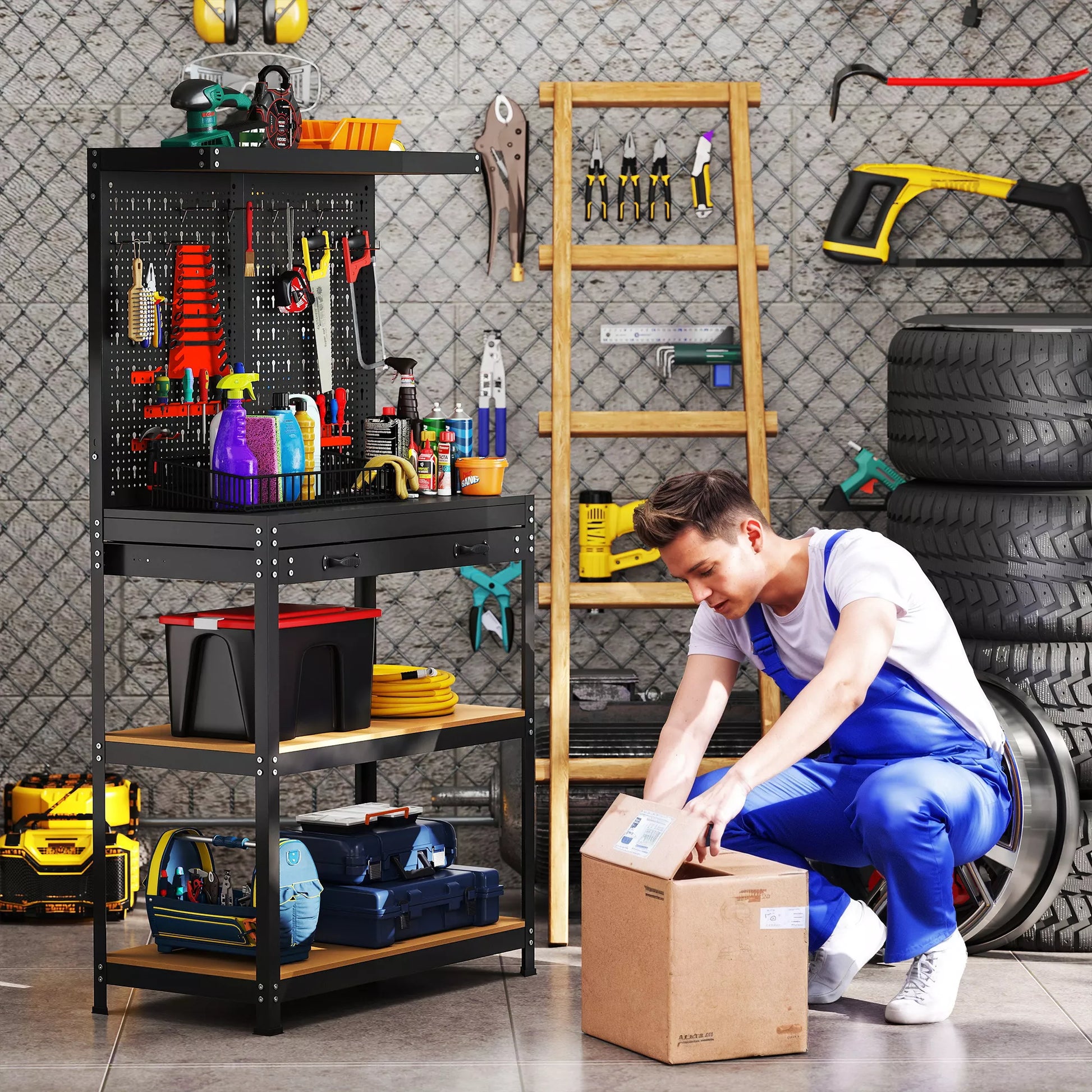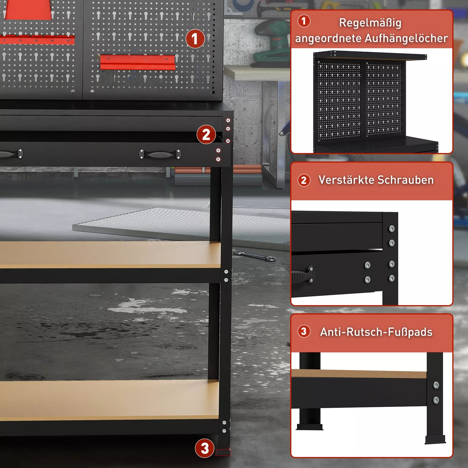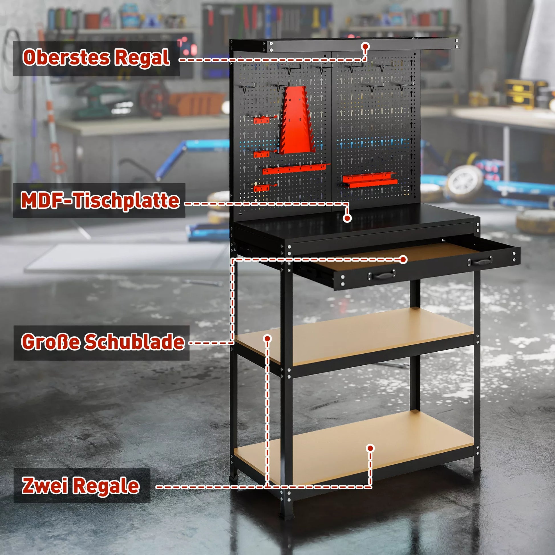 Įrankių stalas 80 x 40,5 x 155 cm, su perforuota sienele, kabliukais, stalčiumi, 2 lentynomis dirbtuvėms, juodas