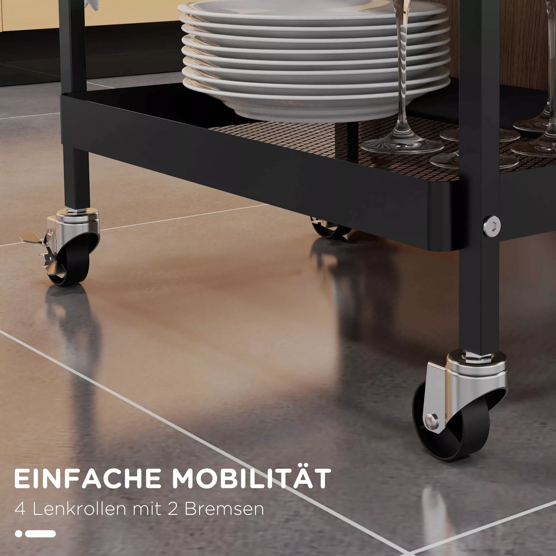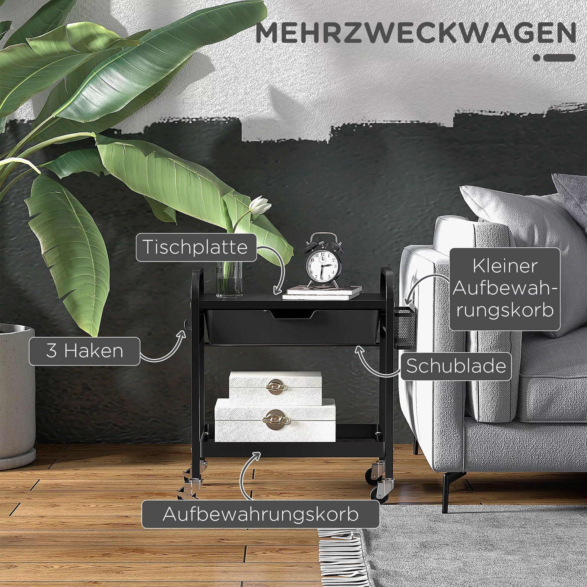 Šis vežimėlis yra kompaktiškas ir puikiai tinka mažiems kambariams, kuriems reikia daugiau vietos daiktams laikyti. Apatinė lentyna, stalčius, šoniniai kabliukai ir nedidelis krepšelis suteikia daug vietos įvairiems aksesuarams. Su lengvai naudojamomis rankenėlėmis, užtikrinančiomis sklandų judėjimą. Keturi lengvai judantys ratukai ir fiksuojami stabdžiai leidžia vežimėlį perkelti ten, kur jo reikia. Jis gali būti naudojamas kaip serviravimo vežimėlis, virtuvės vežimėlis ir universalus vežimėlis. Praktiškas laikymo sprendimas jūsų namams.