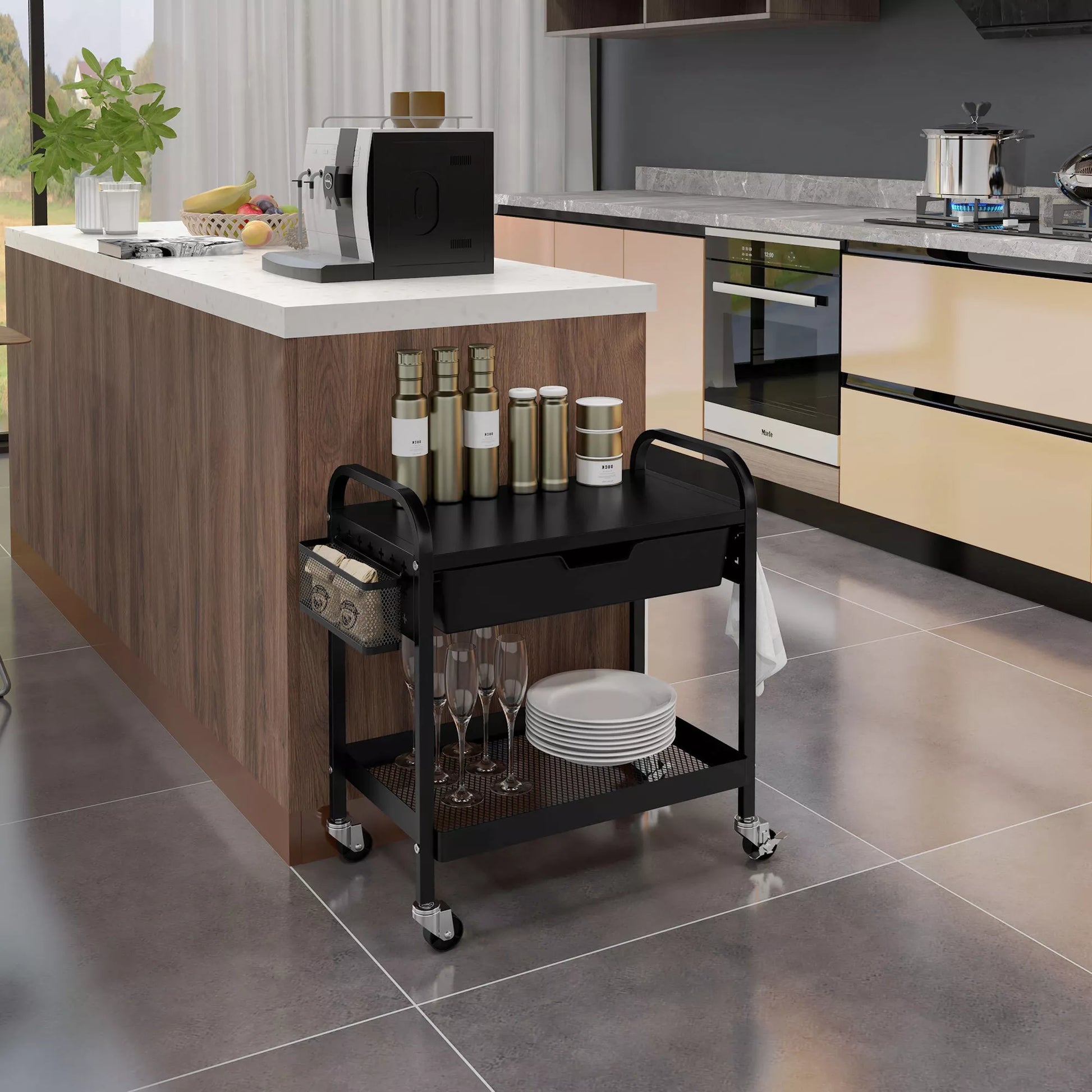 Daugiafunkcis vežimėlis su 1 stalčiumi, 1 lentyna, 4 ratukais, virtuvės vežimėlis, juodas