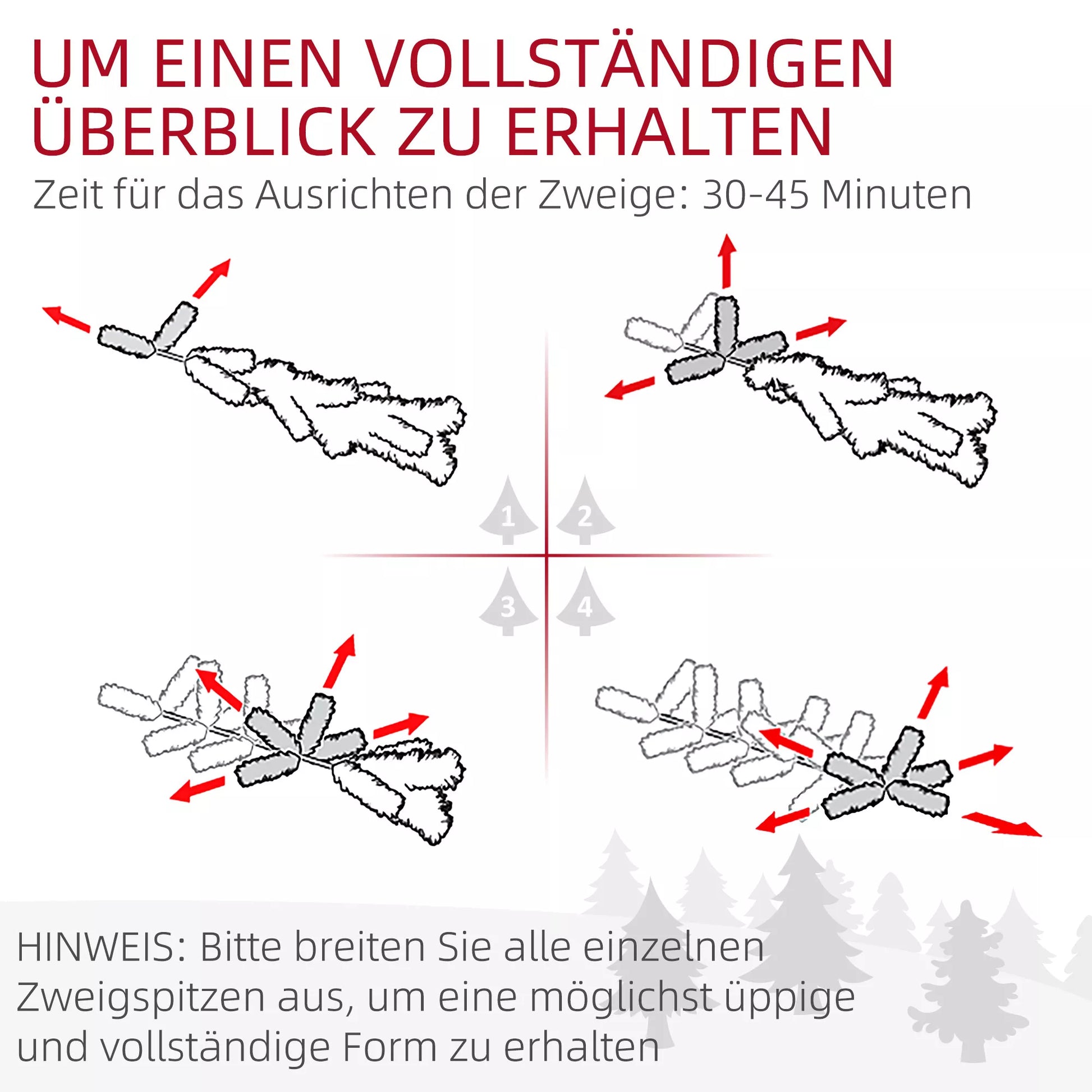 - 2, Norint pasiekti pilną išvaizdą, prašome išskleisti visas atskiras šakeles. Rekomenduojama formuoti eglę 30-45 minutes
