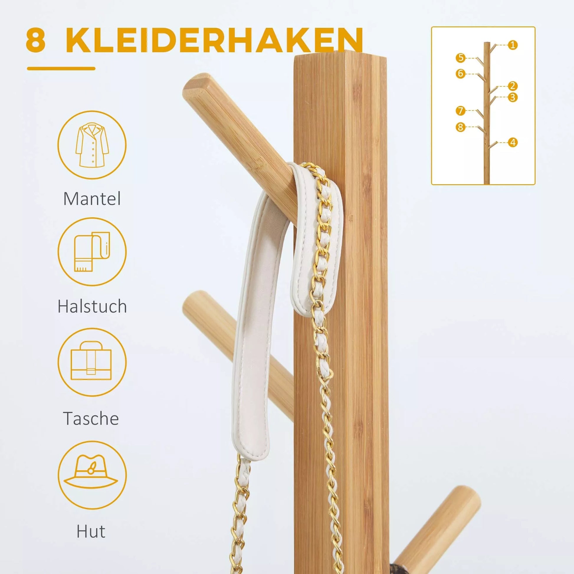 Sutvarkykite savo prieangį su mūsų bambukine grindine drabužių kabykla. Dėl tvirtos konstrukcijos ir 8 kabliukų galėsite pasikabinti paltus ir skrybėles. Kompaktiškas dizainas leis jai tilpti net ir ankštose erdvėse, o natūrali medžio apdaila derės prie bet kokio interjero stiliaus.