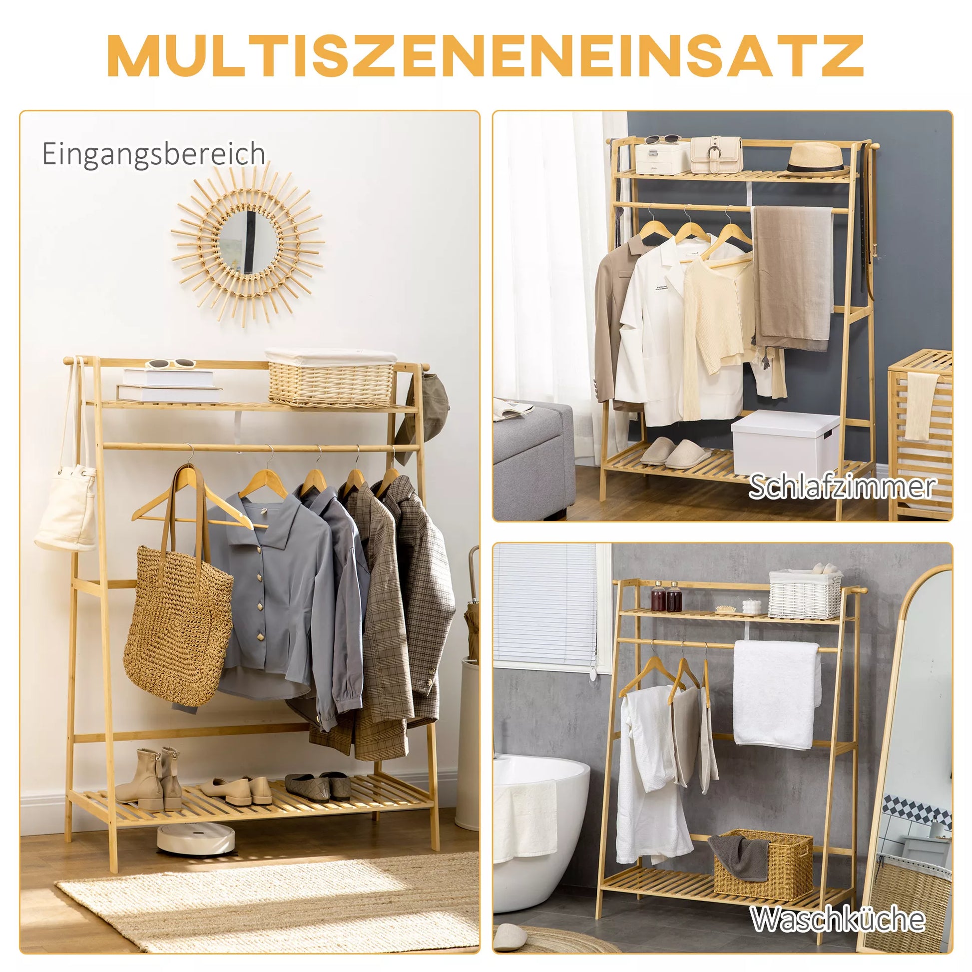 Drabužių stovas iš bambuko, 2 pakabos kabliukai, drabužių kabykla, 2 lentynos, 114 x 40 x 139 cm