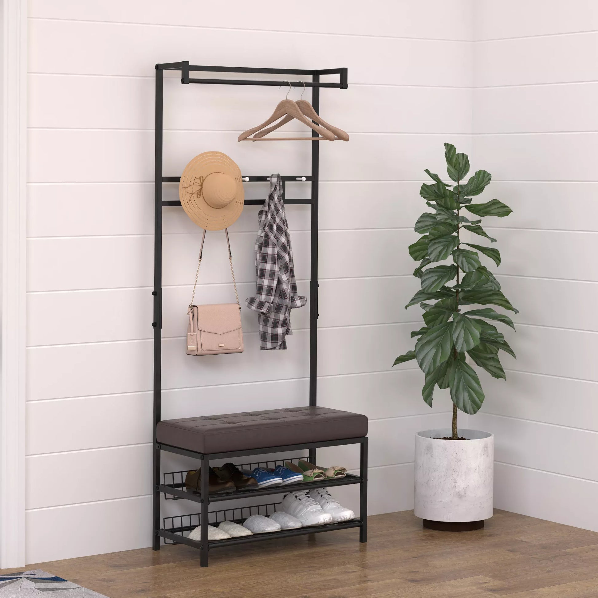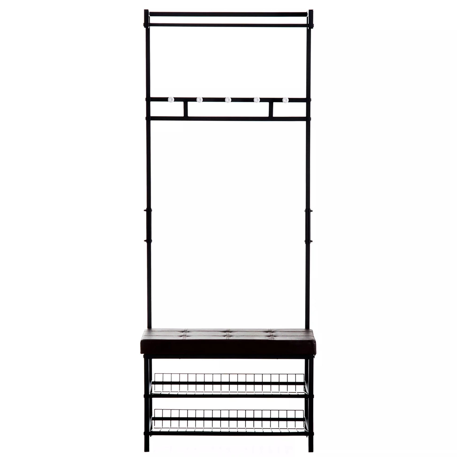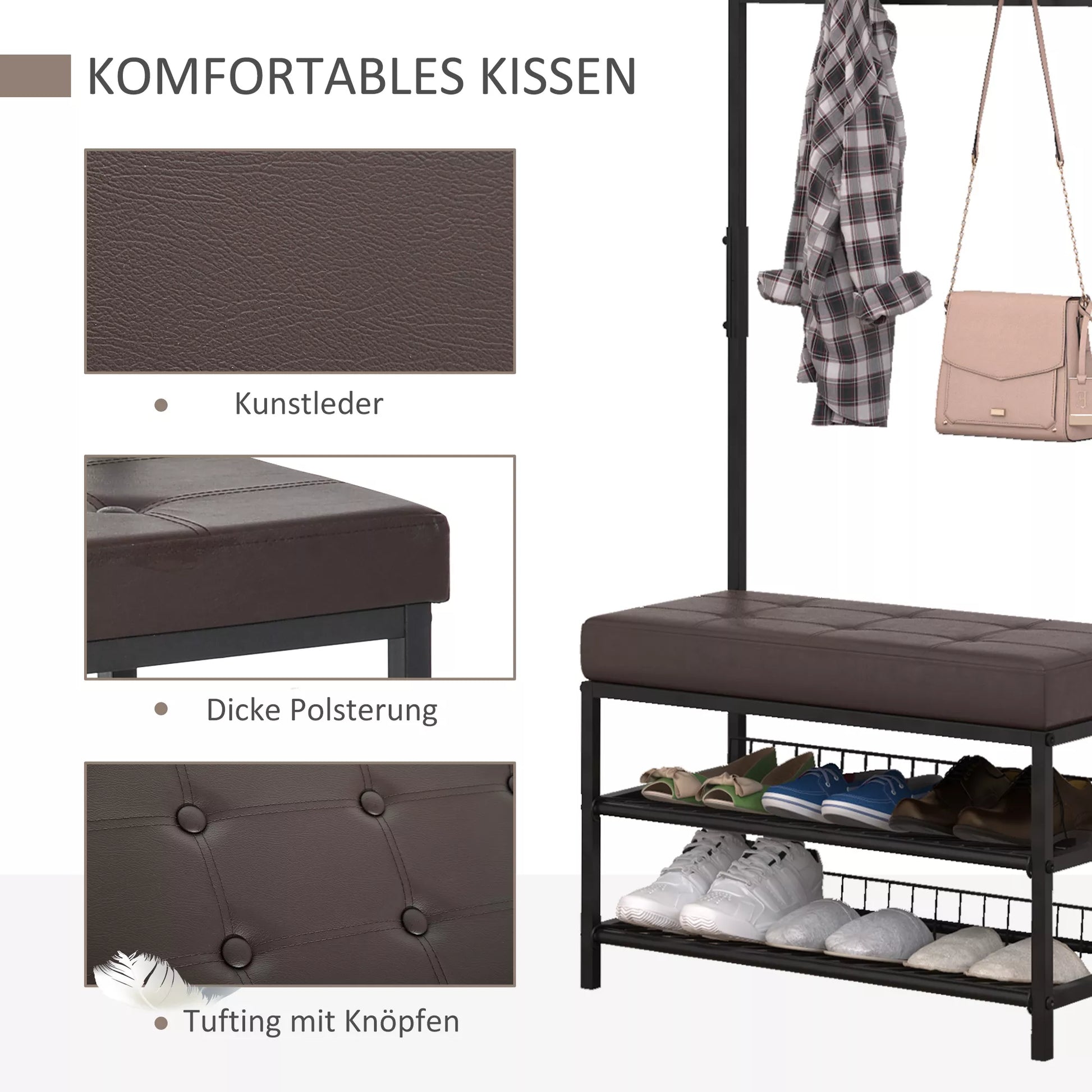 Praktiškas ir universaliai pritaikomas - Šis drabužių kabyklos stovas sujungia drabužių kabyklą, dvi lentynas ir sėdimą vietą patogiam batų pervėrimui. Dėl savo paprasto ir kompaktiško dizaino jis puikiai tinka prieangiams, koridoriams, svetainėms ir svečių kambariams. Milteliniu būdu dengto metalo rėmas užtikrina ilgaamžiškumą ir atsparumą rūdims. Paminkštinta sėdimoji dalis, padengta atspariu dirbtiniu odos pakaitalu, suteikia tiek aukštą komfortą, tiek ilgaamžiškumą.