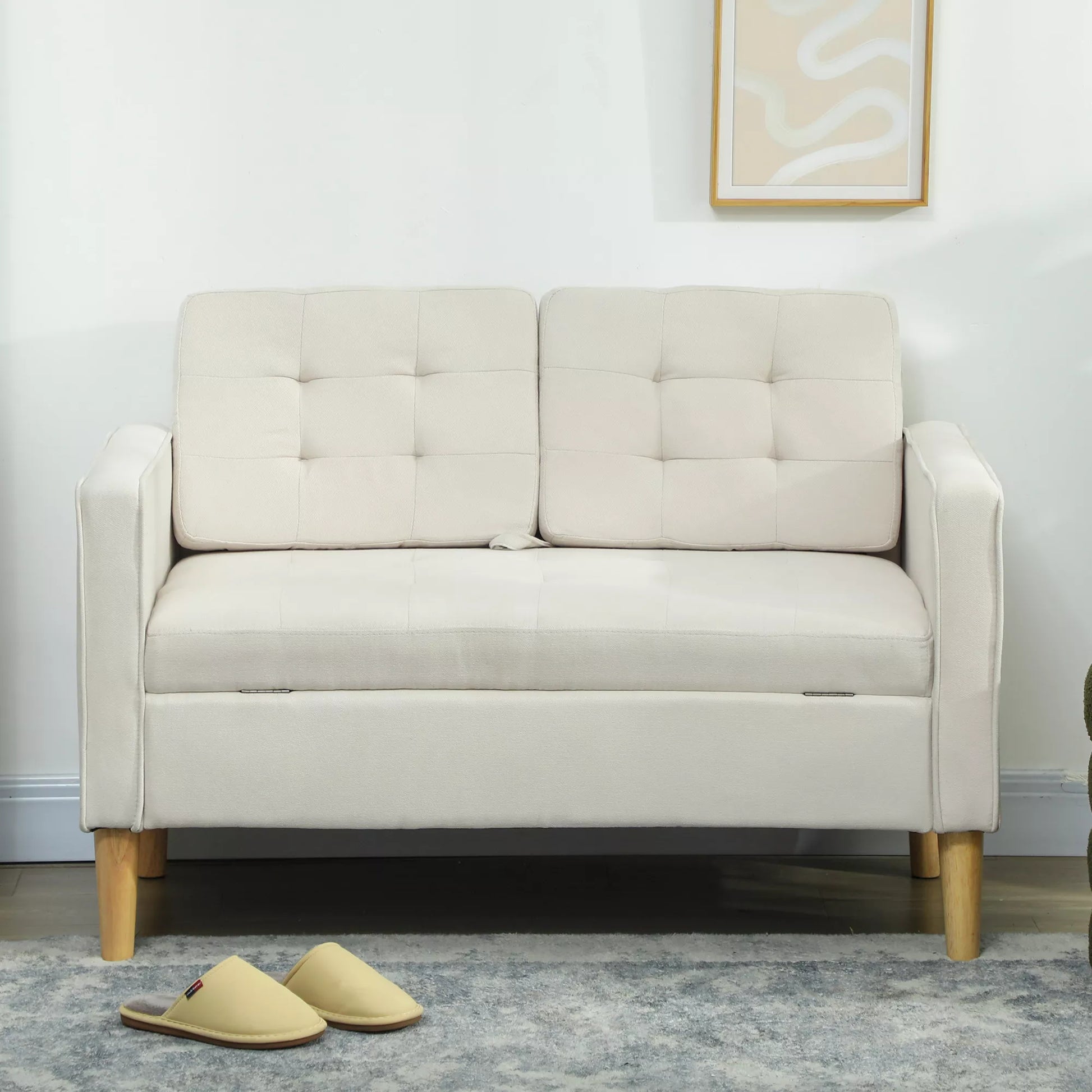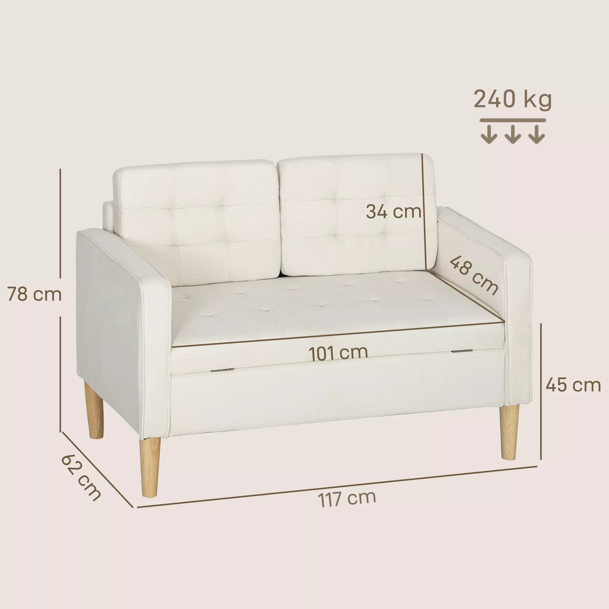 Dvivietė sofa su daiktadėže, sagų apmušalais, pagalvėlėmis, pagaminta iš kaučiukmedžio, 117x62x78cm, kreminės baltos spalvos.