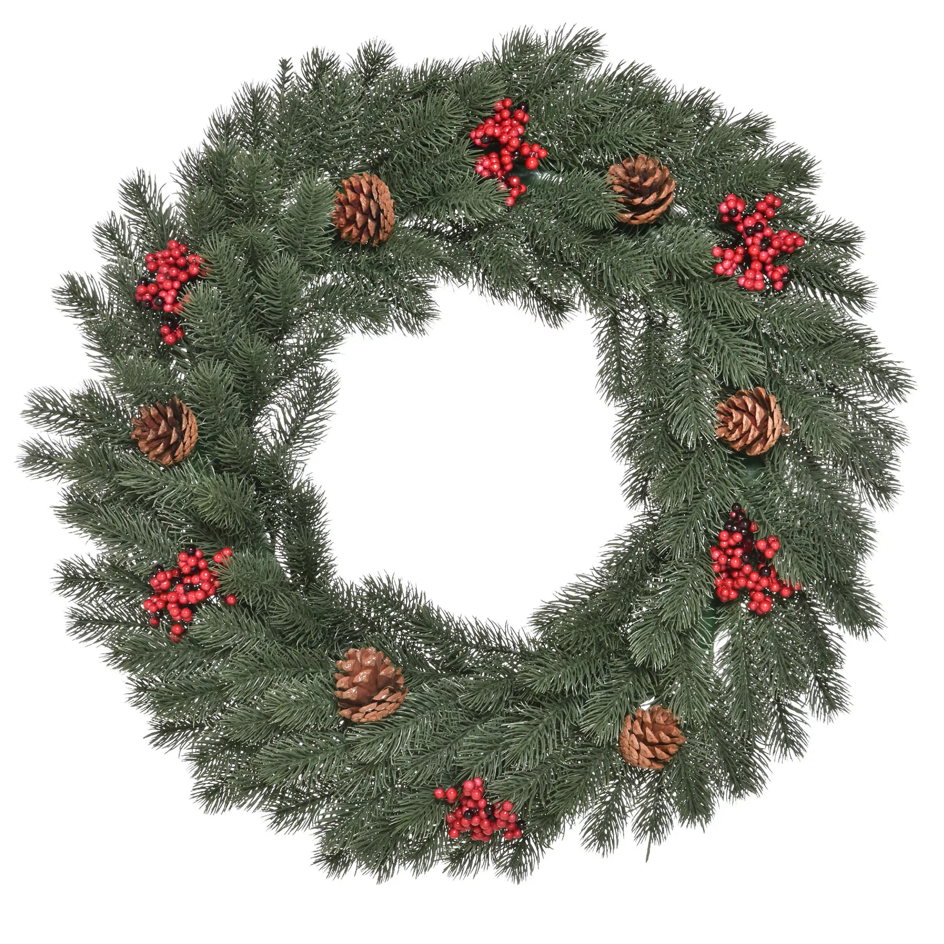- ✔ Dirbtinis kalėdinis vainikas, kurio skersmuo 60 cm, papuoštas 6 pušies kankorėžiais ir 6 raudonomis uogomis