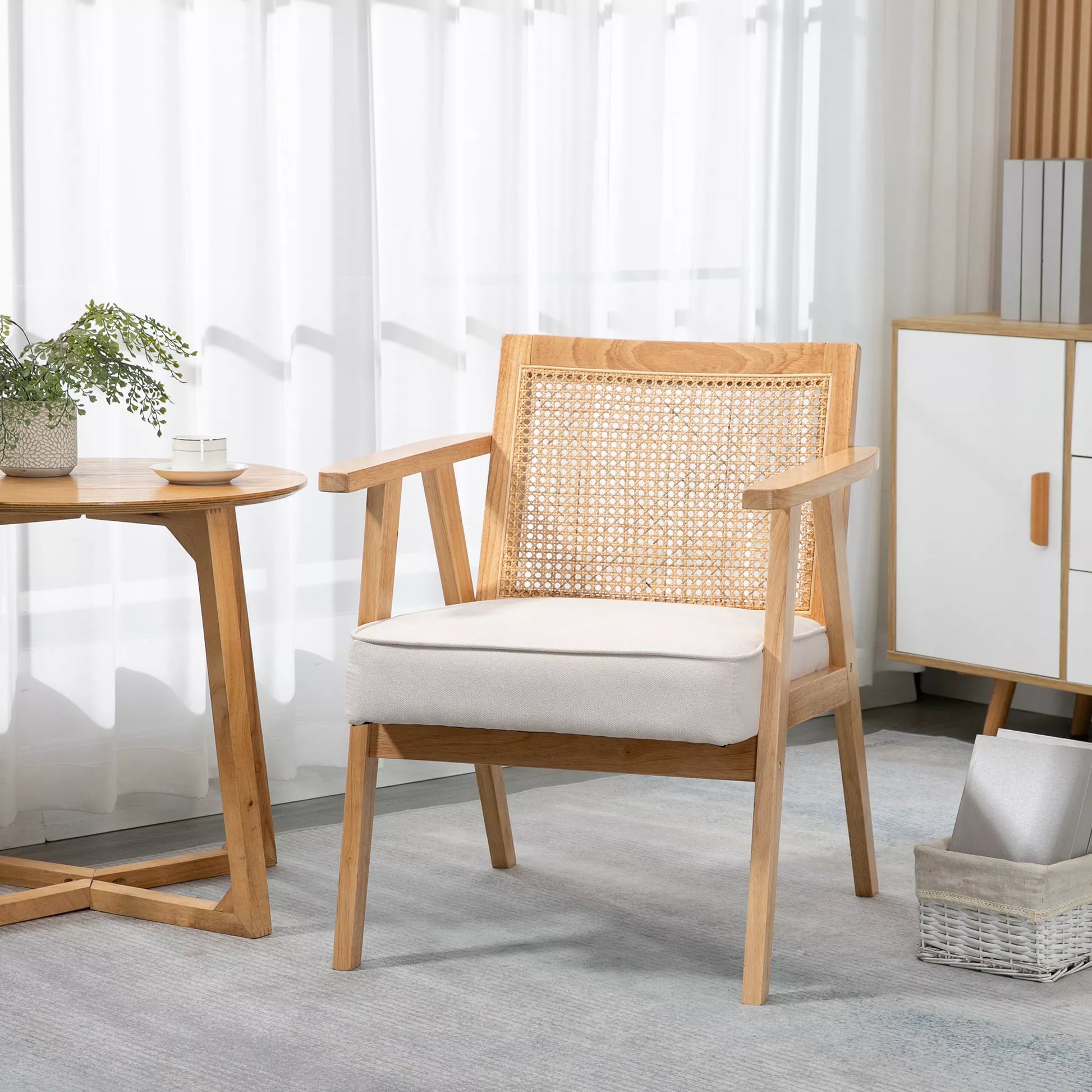 Egzotiškas minkštasuolis, kaučiukmedis, sėdynės pagalvėlė su lininės išvaizdos apdaila, 63 ilgis x 69 plotis x 78 aukštis cm, kreminės baltos spalvos