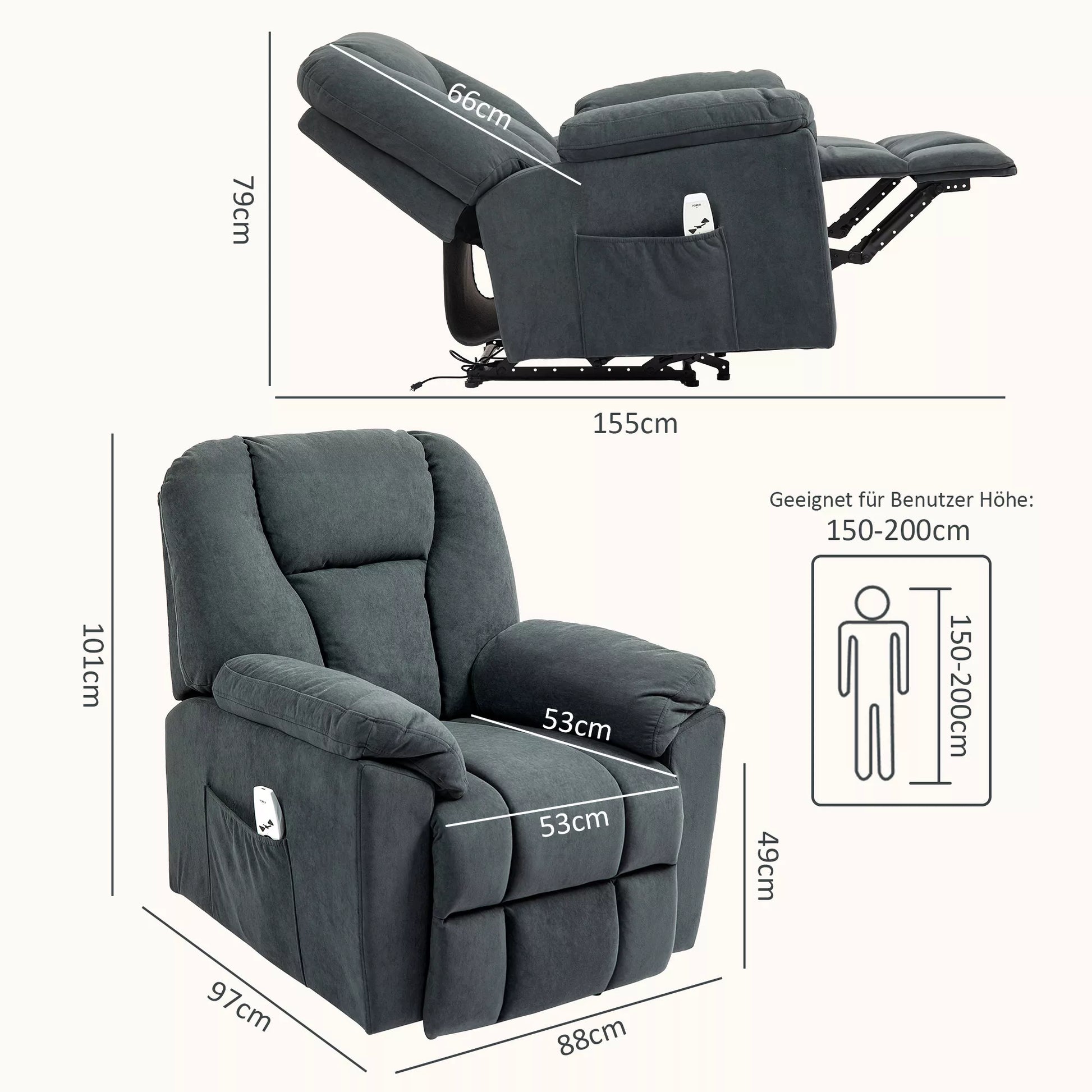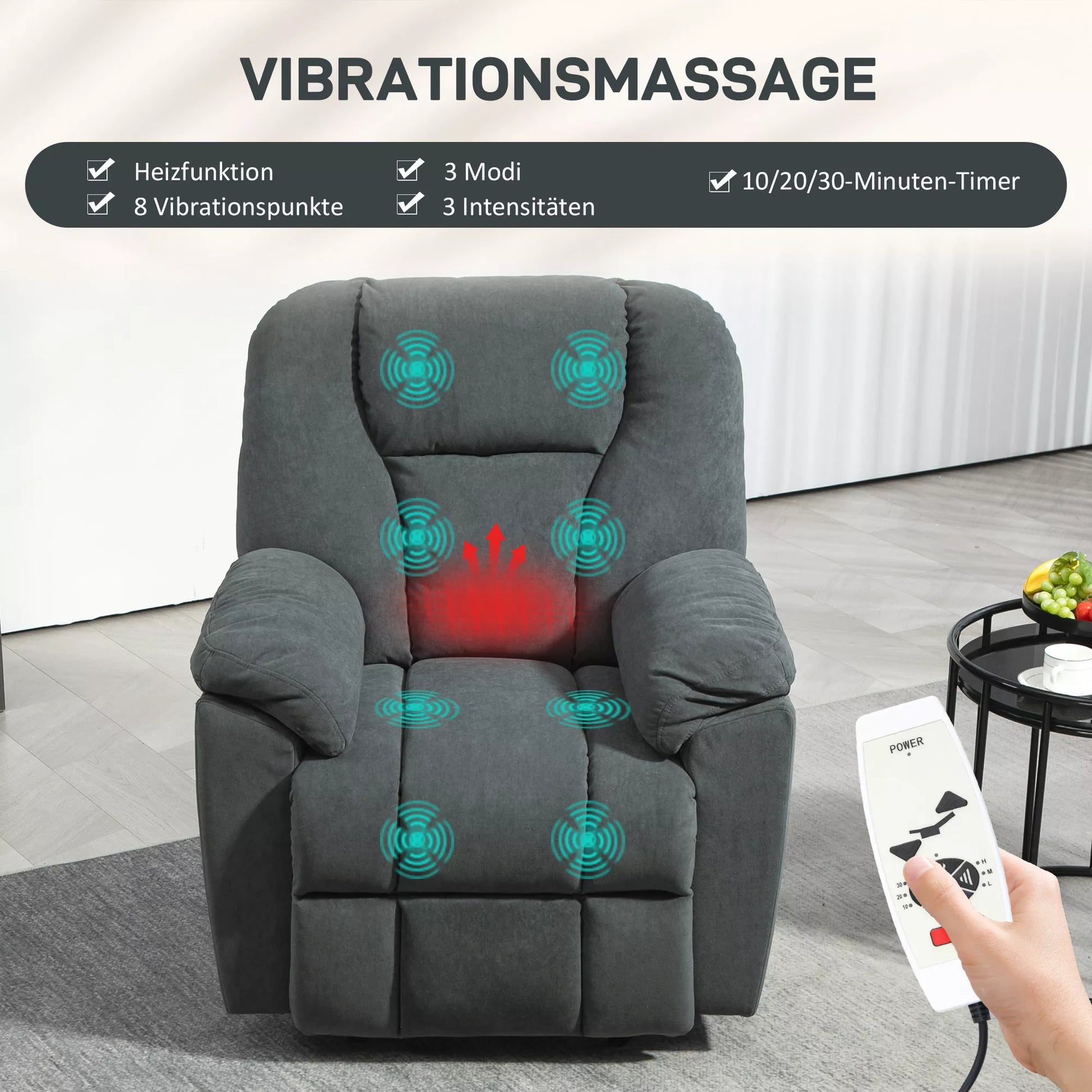 Patirkite didžiausią komfortą su poilsio krėslu su gulėjimo funkcija! Atsipalaiduokite individualiai, naudodami 135° laipsnių reguliuojamą atlošą ir išskleidžiamą kojų atramą, kuriuos lengva valdyti nuotolinio valdymo pulteliu. Aštuoni vibracinės masažo taškai poilsio krėsle tikslingai mažina įtampą nugaroje, juosmens srityje, šlaunyse ir kojose. Vėsesniais vakarais taip pat pagelbės integruota juosmens šildymo funkcija. Jaukiai atsisėskite ir mėgaukitės užtarnauta pertrauka.