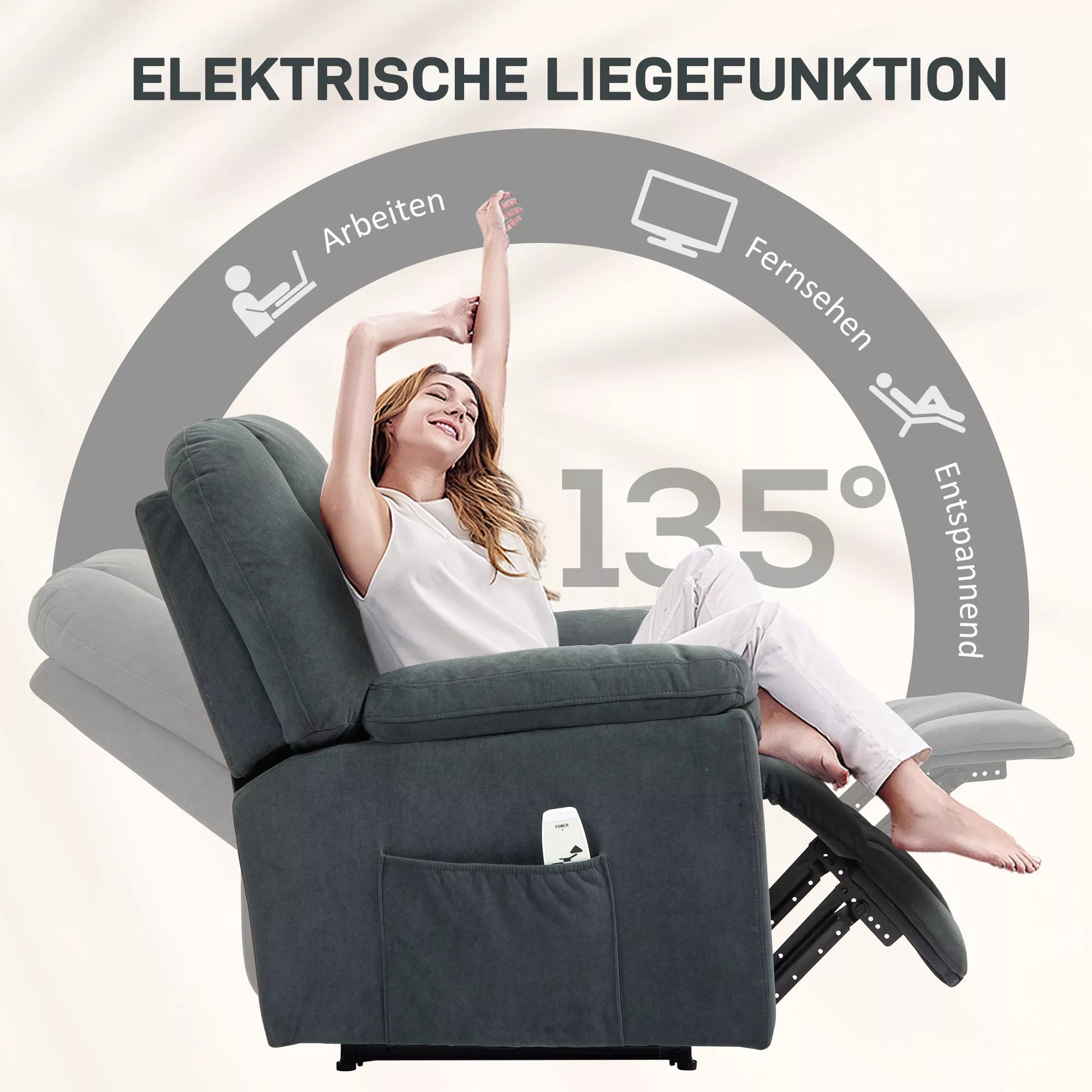 - ✔ 135° laipsnių laipsniškas pasvirimas su kojų atrama individualiam komfortui, valdomas nuotolinio valdymo pulteliu