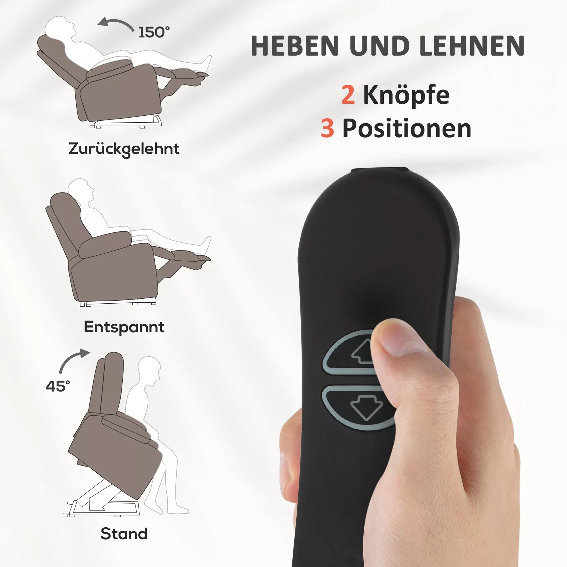 Mėgaukitės nepakartojamu komfortu su mūsų elektriniu TV krėsle su gulėjimo funkcija! Dėl 45° pakėlimo funkcijos atsistoti bus daug lengviau, o 150° kampu reguliuojamas atlošas užtikrins visišką atsipalaidavimą. Šis elektrinis masažinis krėslas su 8 masažo taškais ir juosmens šildymo funkcija suteikia individualią poilsio patirtį, o jį apgaubia švelnus, lygus audinys.