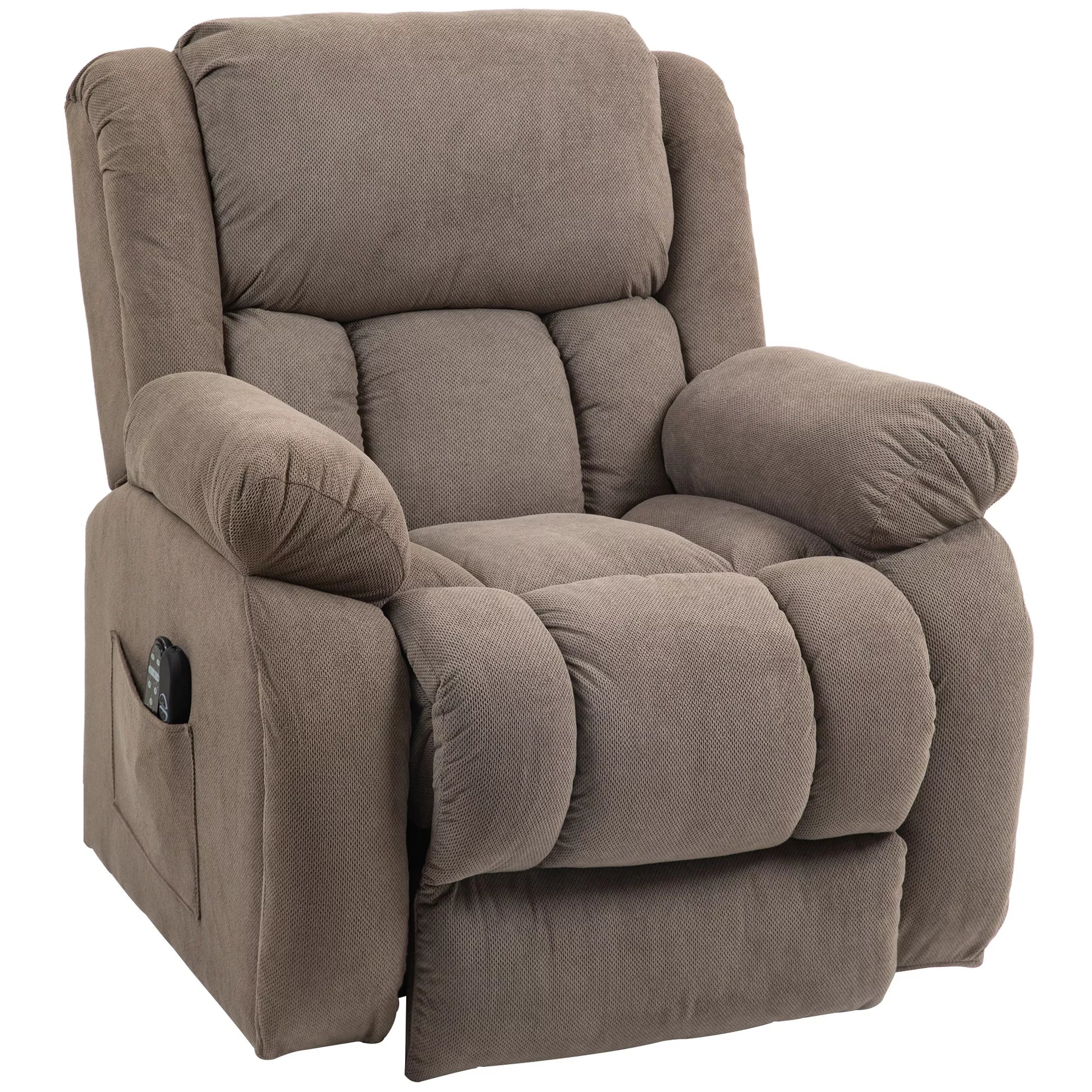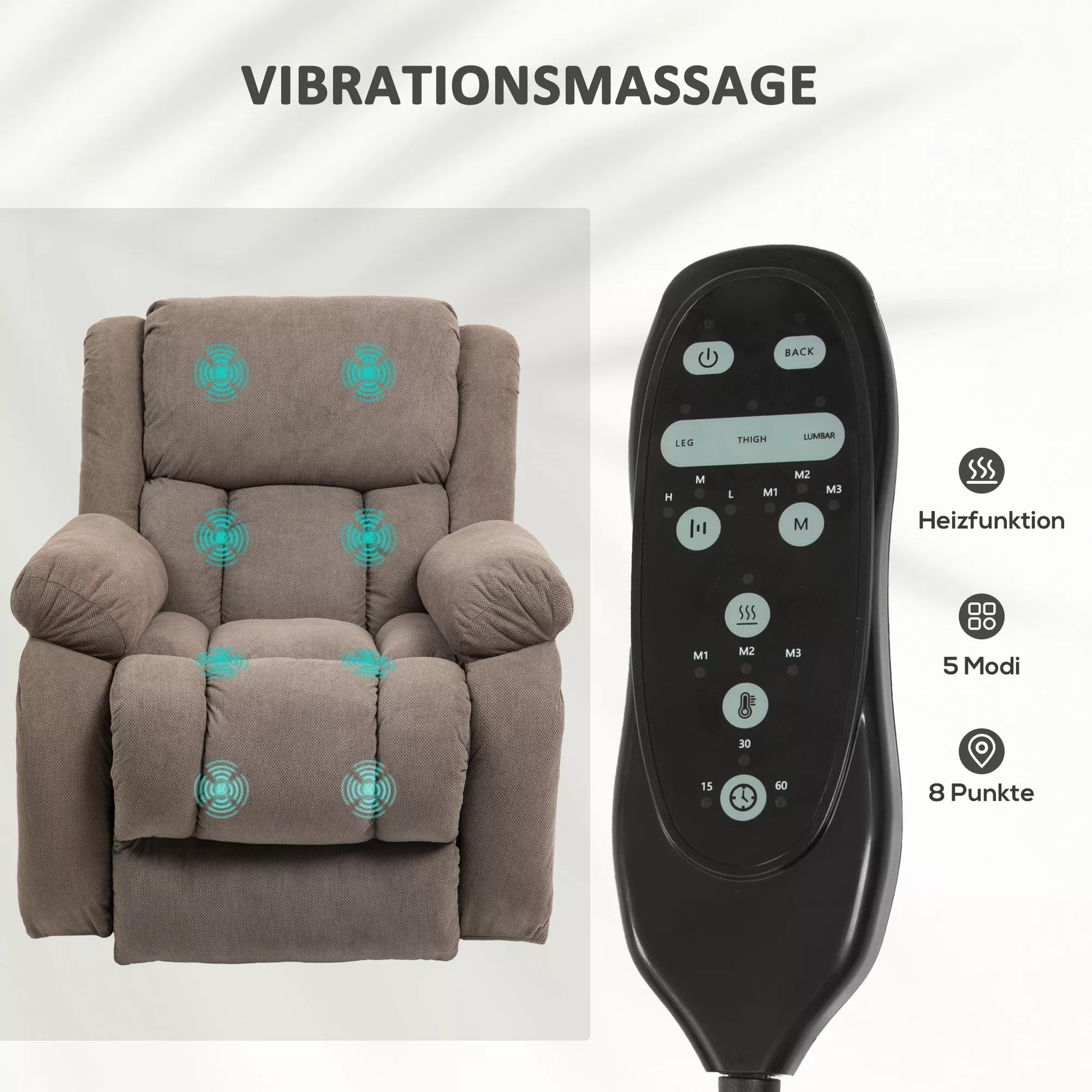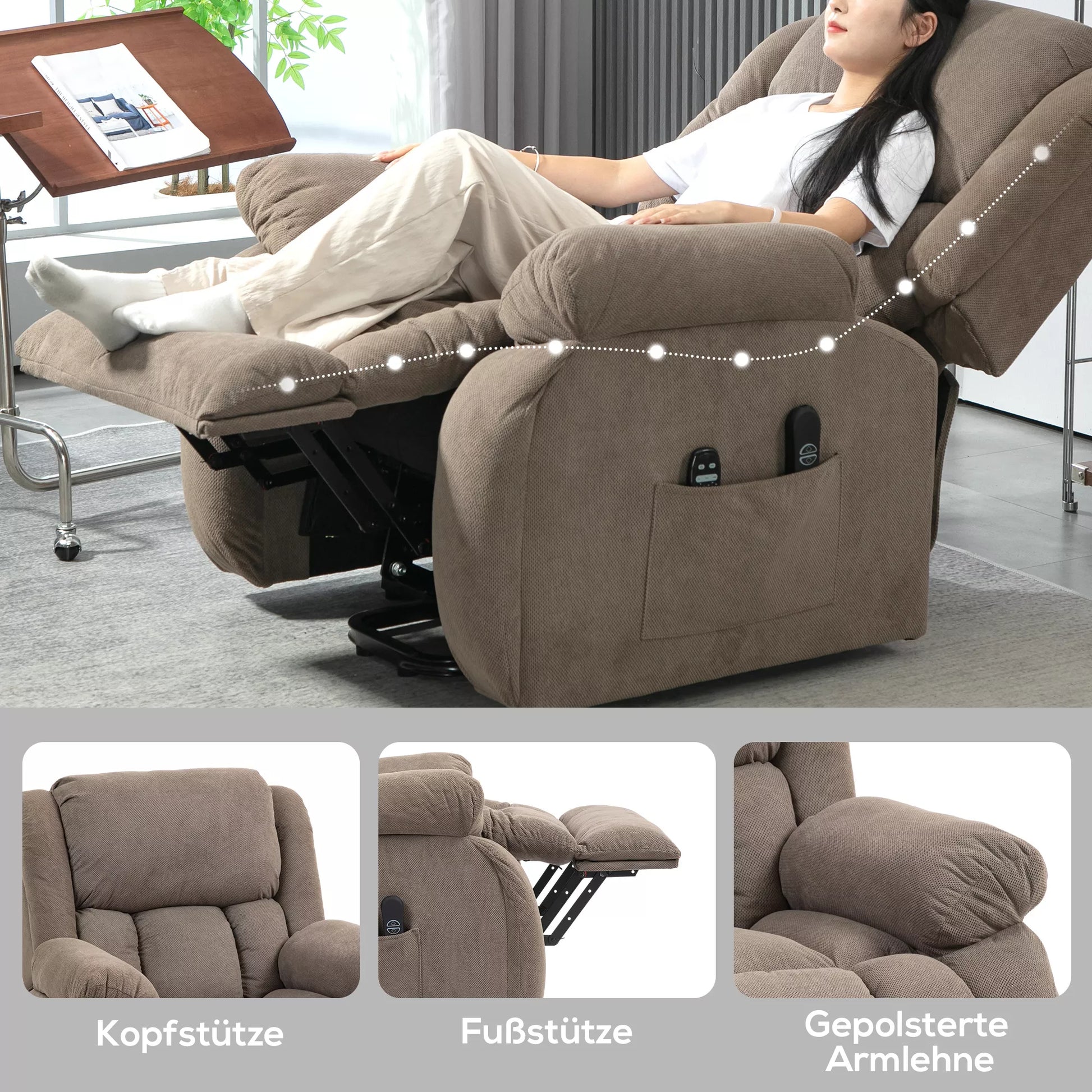 Televizoriaus krėslas su masažo ir šildymo funkcija, elektrinis pakeliamas fotelis, nuotolinio valdymo pultas, šoninės kišenės, šviesiai rudas