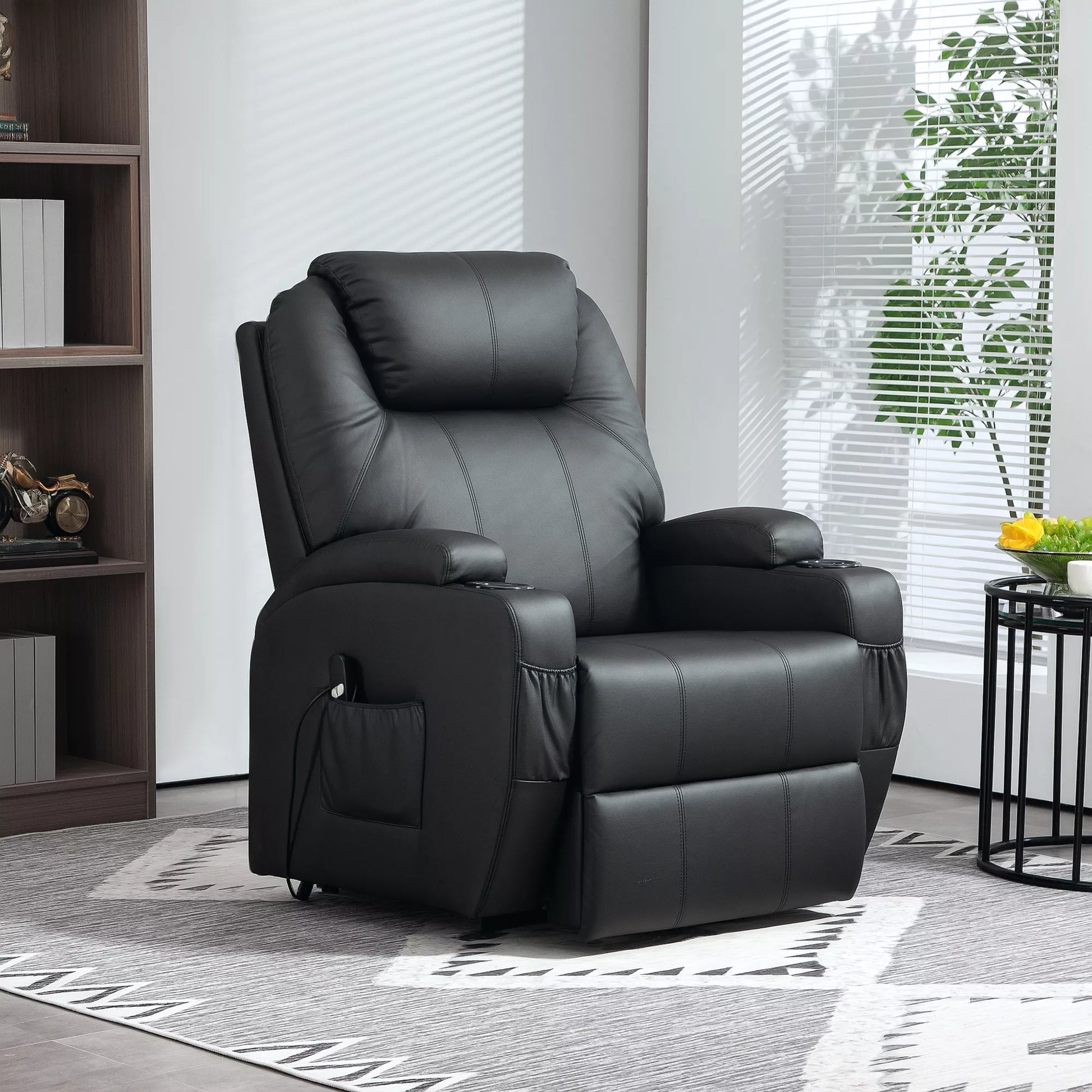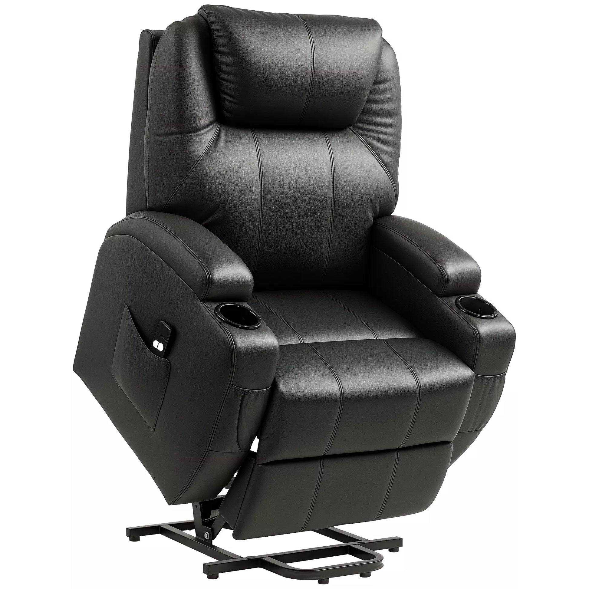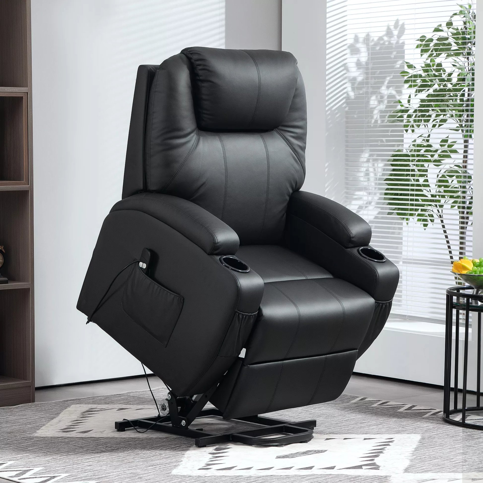 Elektrinis TV fotelis su pakėlimo funkcija, relaksacinis krėslas su gulėjimo funkcija, TV-fotelis su puodelių laikikliu, šonine kišene ir nuotolinio valdymo pulteliu, dirbtinė oda, juodas