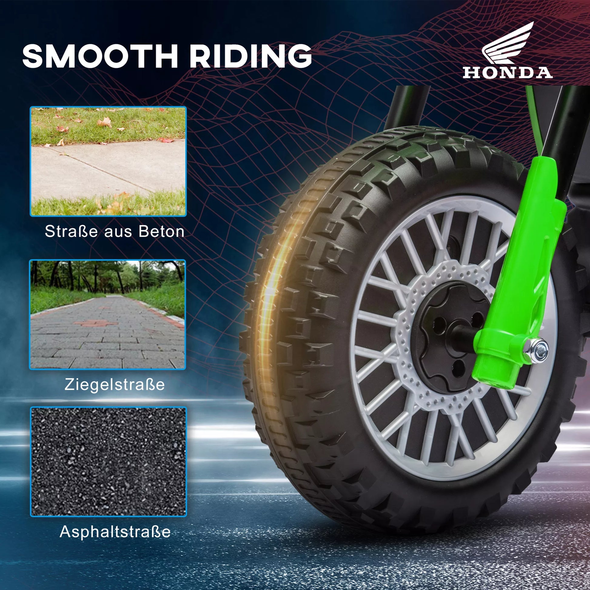 Beribis smagumas su elektriniu vaikišku motociklu! Nesvarbu, ar tai švelnus važiavimas asfaltu, greitas važiavimas akmenimis grindiniais, ar betoninių kelių įveikimas – šis elektrinis motociklas žada įdomių nuotykių su Honda kokybės ženklu. Su autentiškais paleidimo garsais ir garsiniu signalu kiekvienas vaikas jausis kaip tikras baikerių. Saugus, kokybiškas važiavimo malonumas, kuris sukuria nepamirštamus prisiminimus.