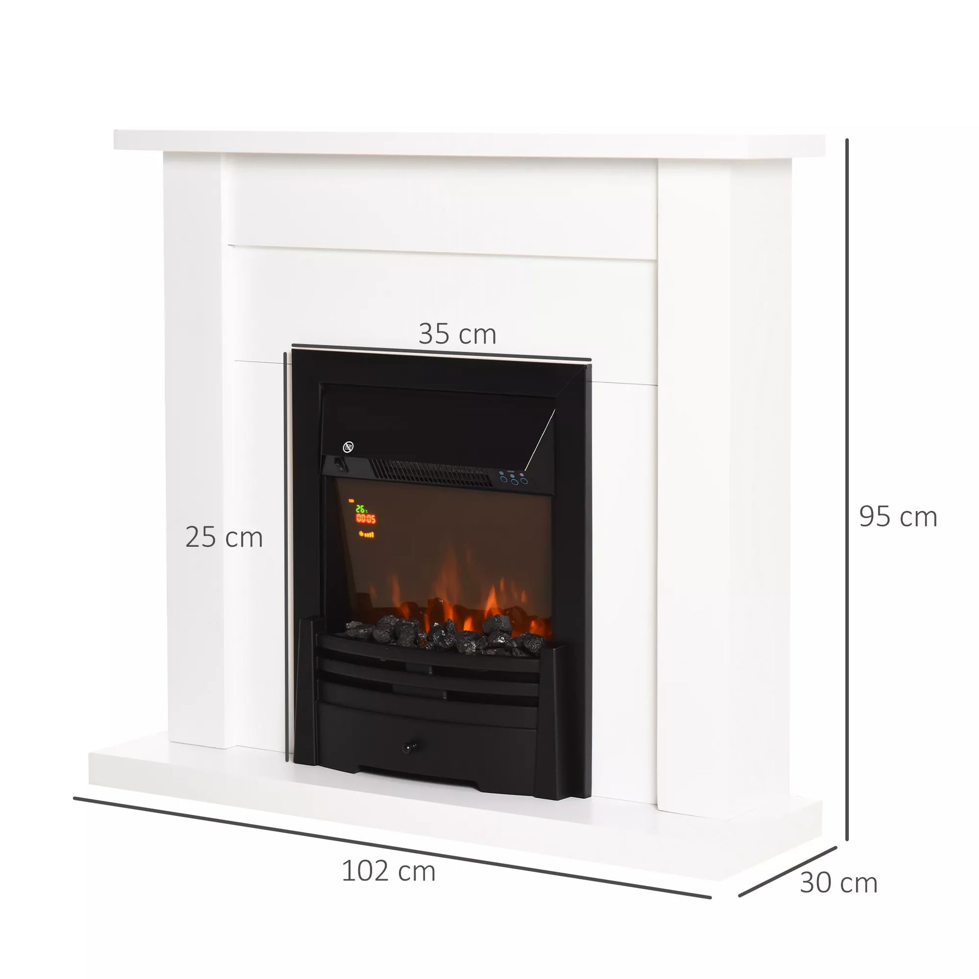 - ✔ Baltas korpusas, užtikrinantis stabilų židinio stovėjimą