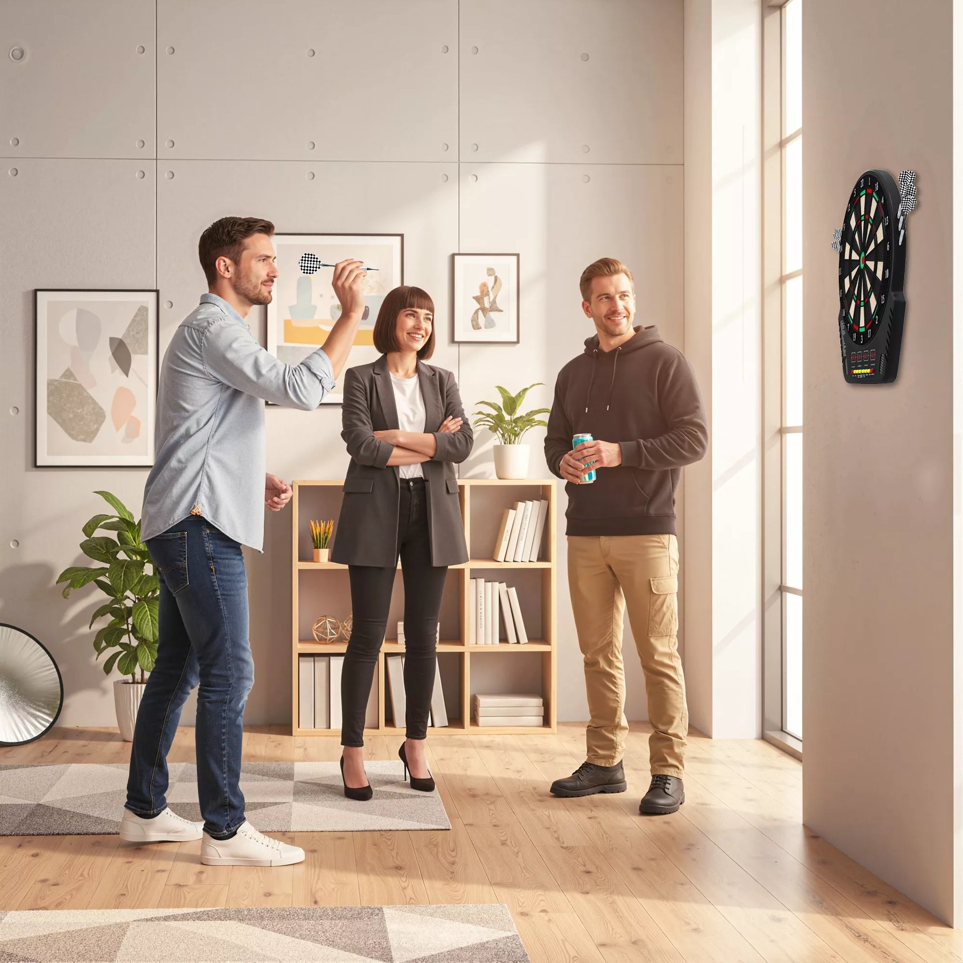 Žaiskite smiginį namuose kaip profesionalai! Šis puikus smiginio rinkinys komplektuojamas su 6 smiginukais, maitinimo adapteriu ir iš anksto išgręžtomis skylėmis greitam tvirtinimui prie sienos, kad galėtumėte iškart pradėti. Rinkitės iš 27 žaidimų ir 243 žaidimo variantų, įskaitant turnyro režimą. Interaktyvūs garso efektai ir balso komandos visada informuos jus ir jūsų iki 15 kitų žaidėjų, kokia jūsų padėtis. Idealiai tinka sodui, vakarėlių nameliui ar kaip dovana.
