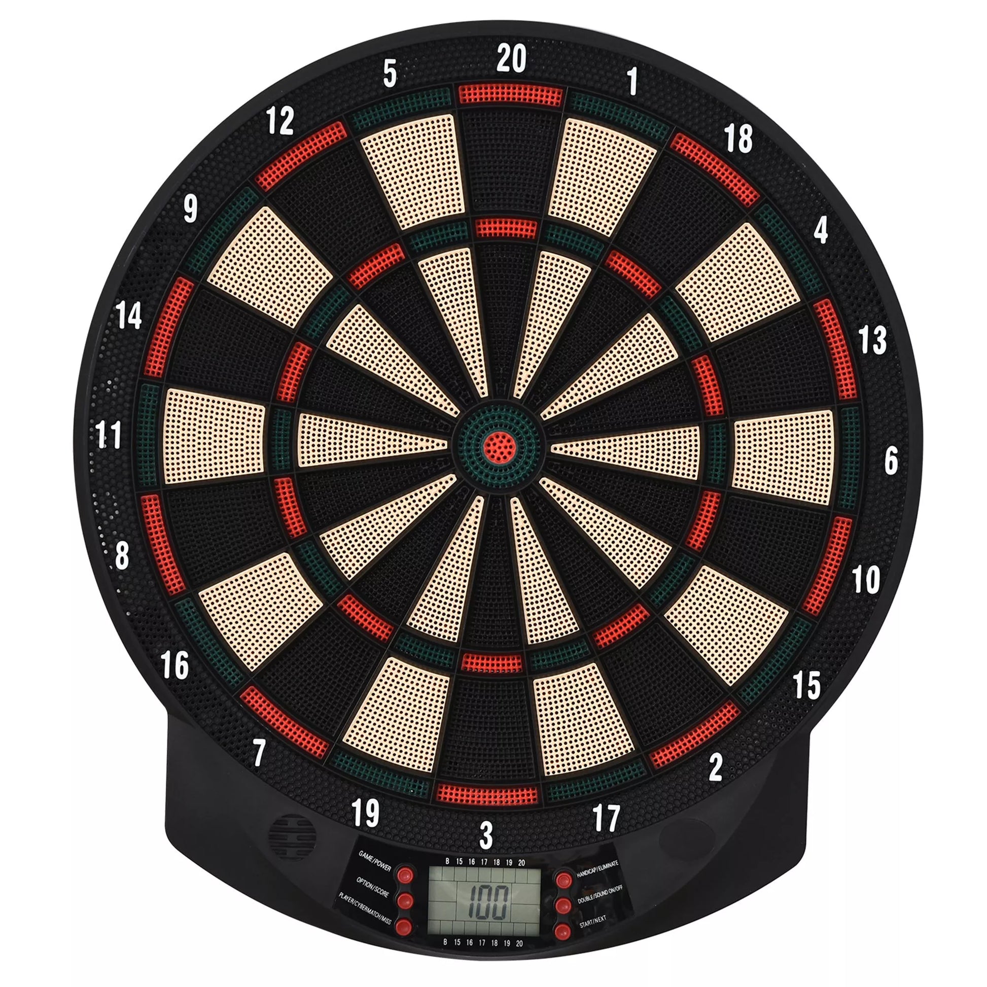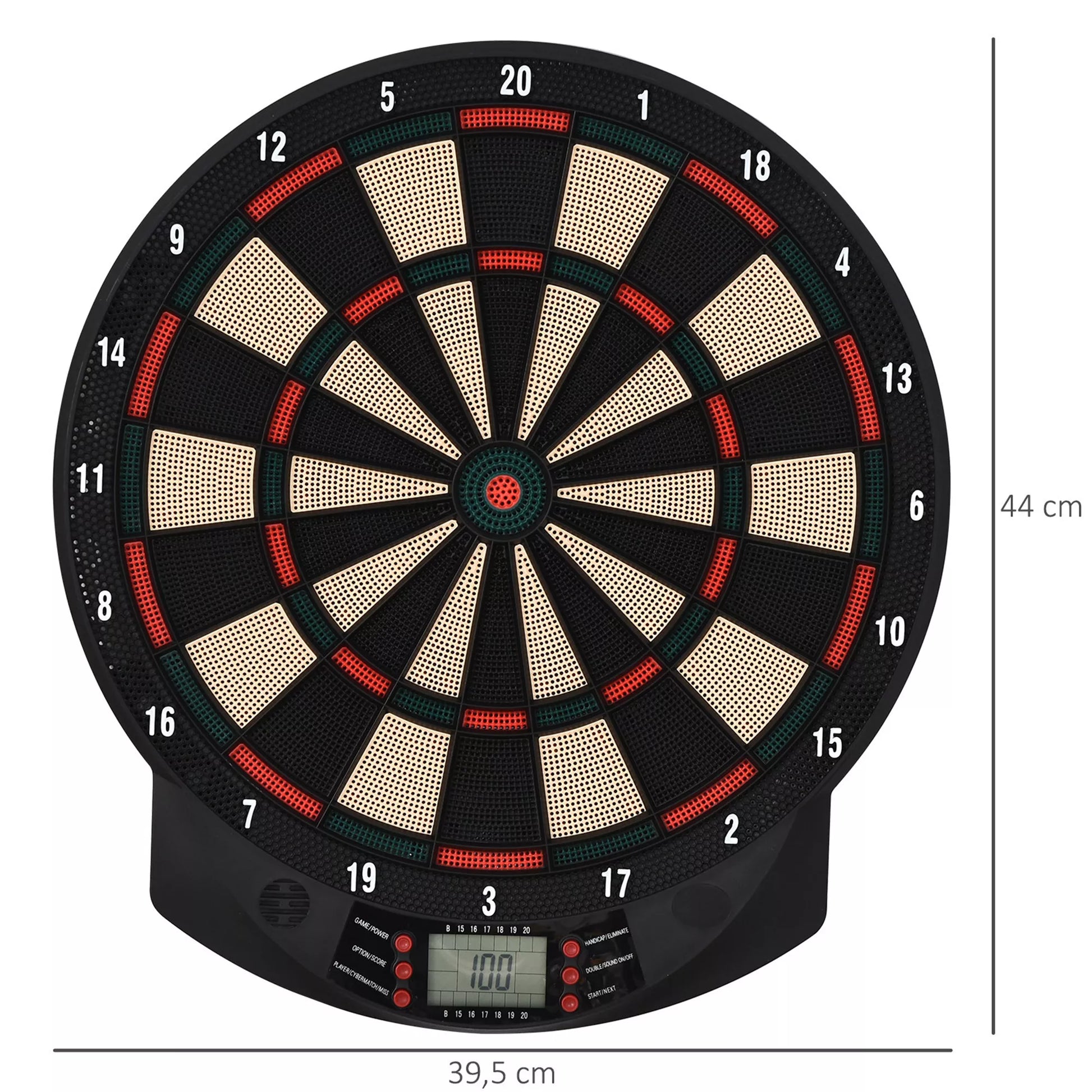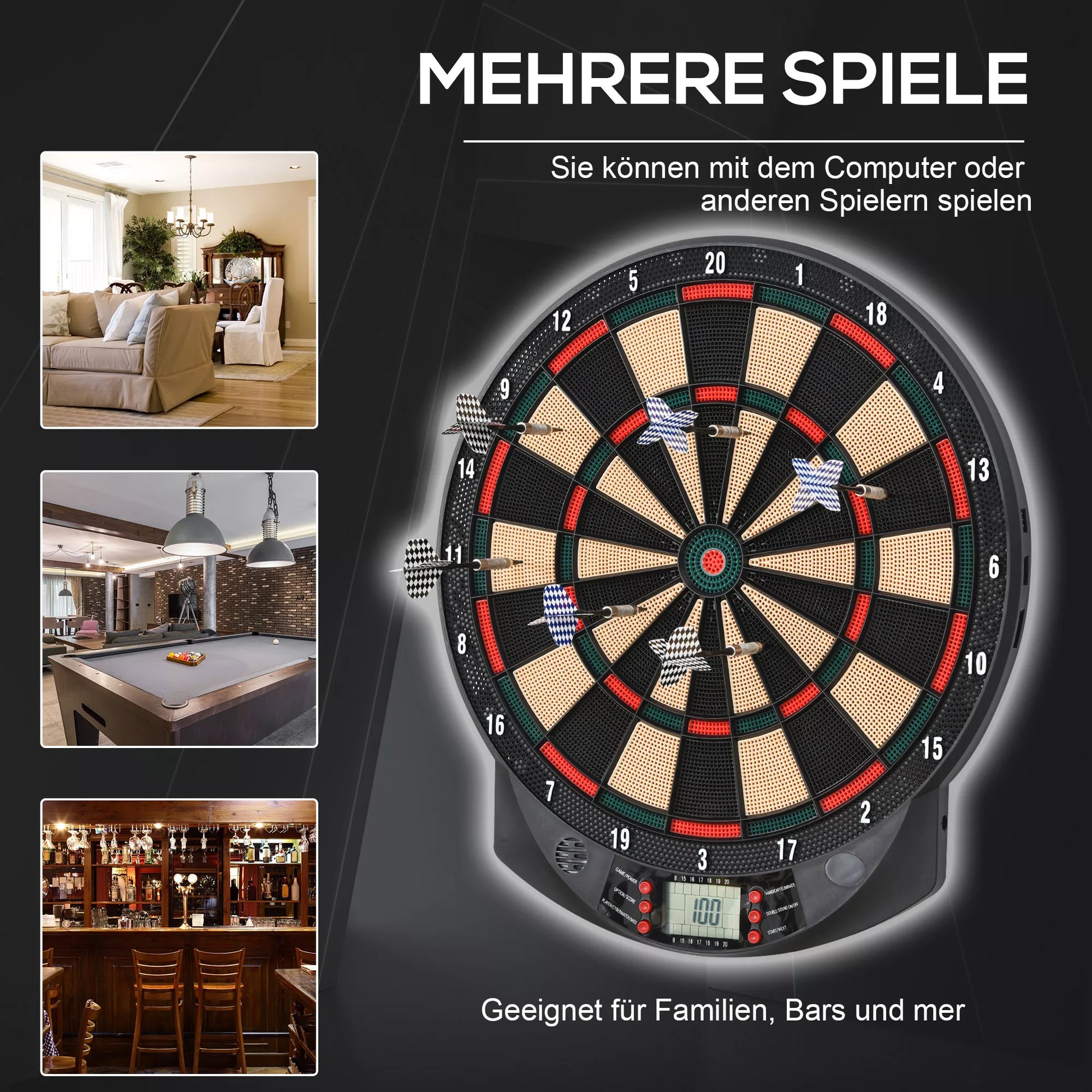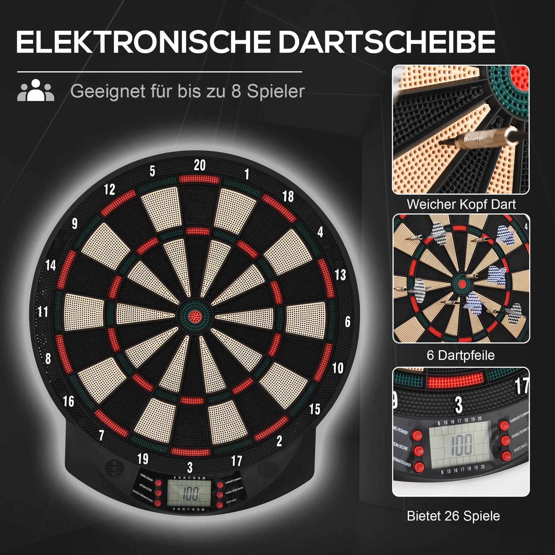 Elektroninis smiginio lenta su automatiniu taškų skaičiavimu, Dart-rinkinys su 6 strėlytėmis, 30 strėlyčių antgalių, 26 žaidimai ir 185 taškų variantai 8 žaidėjams, Garso efektai, Juoda, 44 x 39,5 x 2,2 cm