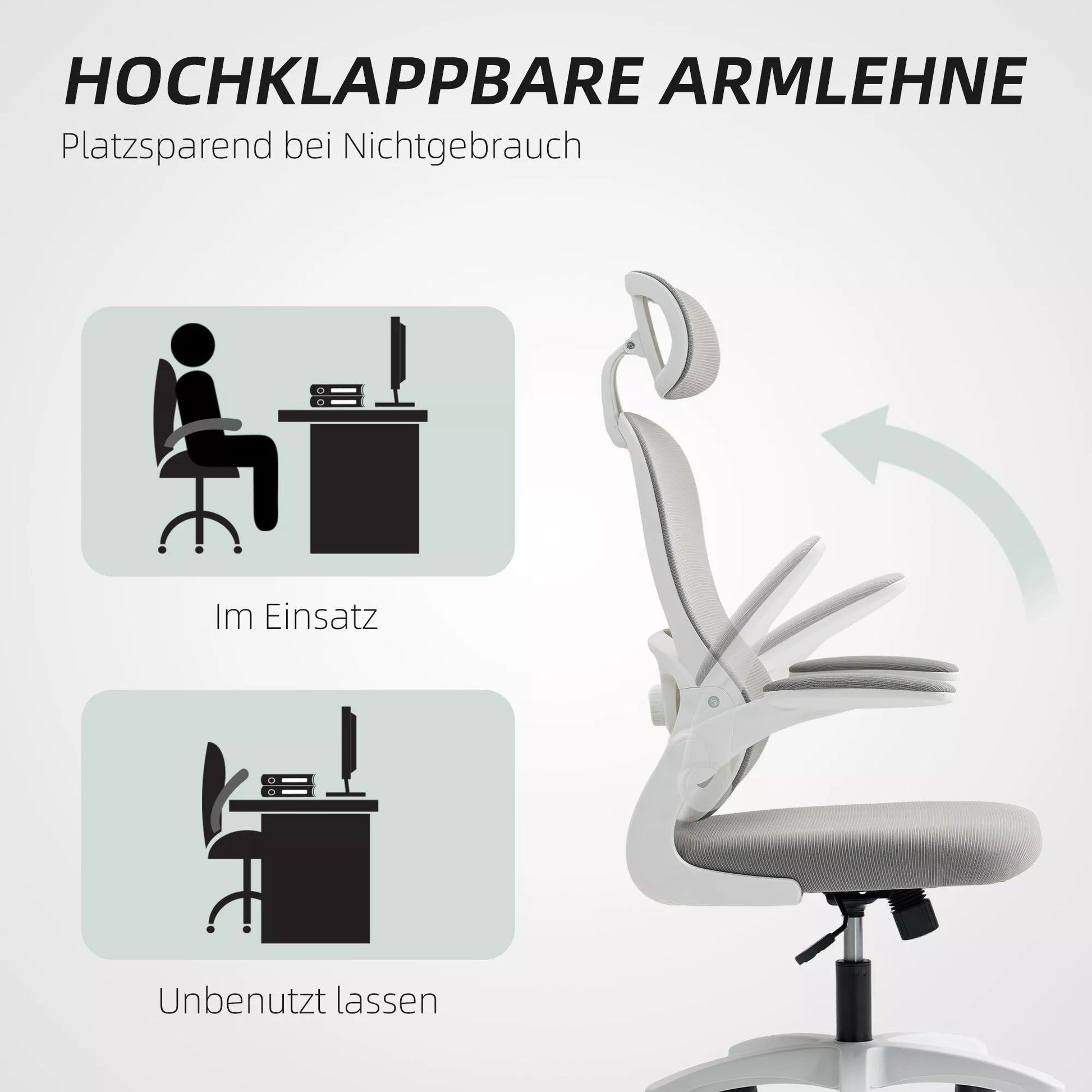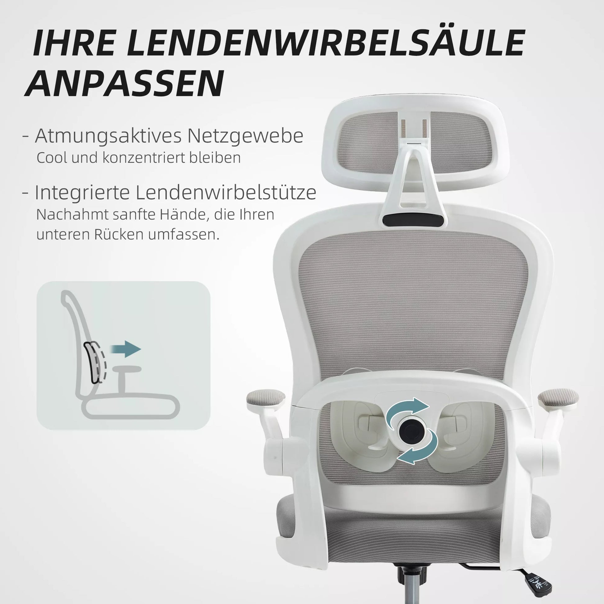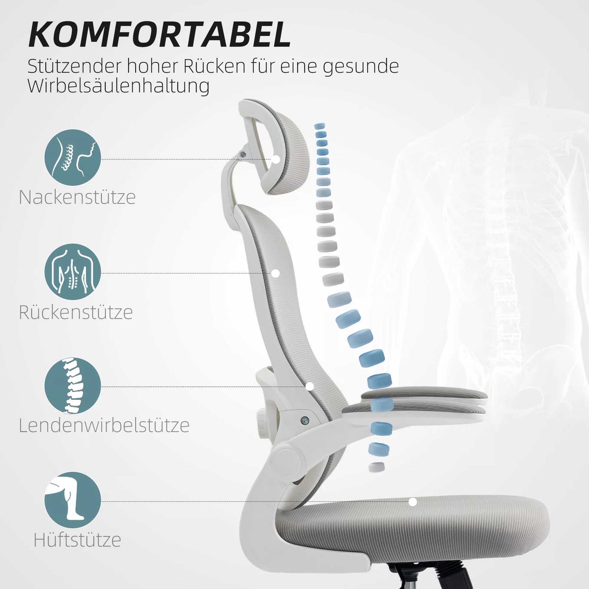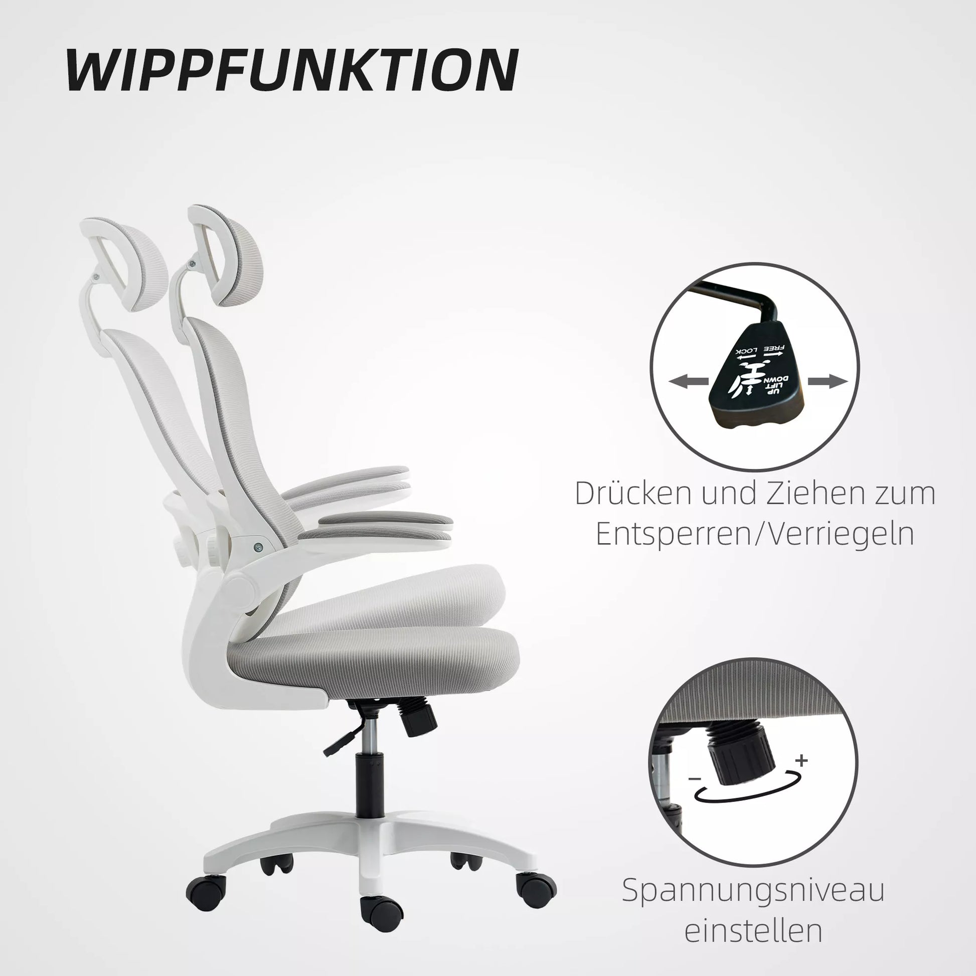 Ergonomiška biuro kėdė su tinklelio atlošu, reguliuojamo aukščio, sulankstomais porankiais, 5 ratukais, svyravimo funkcija, pilka