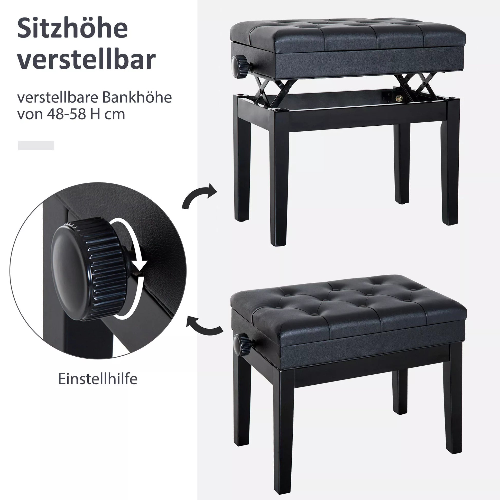 Aukščio reguliuojamas pianino suolas su paslėpta daiktadėže, pianino suolas su dirbtinės odos pagalvėle, klavišinių instrumentų suolas 54,5 x 33 x 48-58 cm Juodas