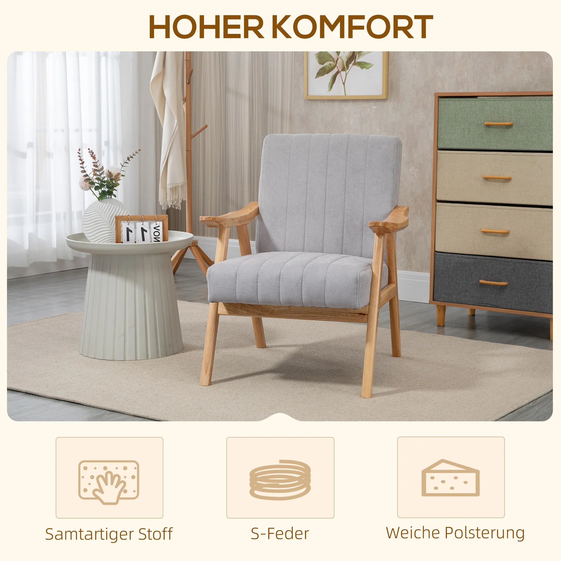Krėslas skandinaviško dizaino, iki 120 kg, aksomo išvaizdos, medžio masyvo; 68 cm x 74 cm x 82 cm, natūralus + pilkas
