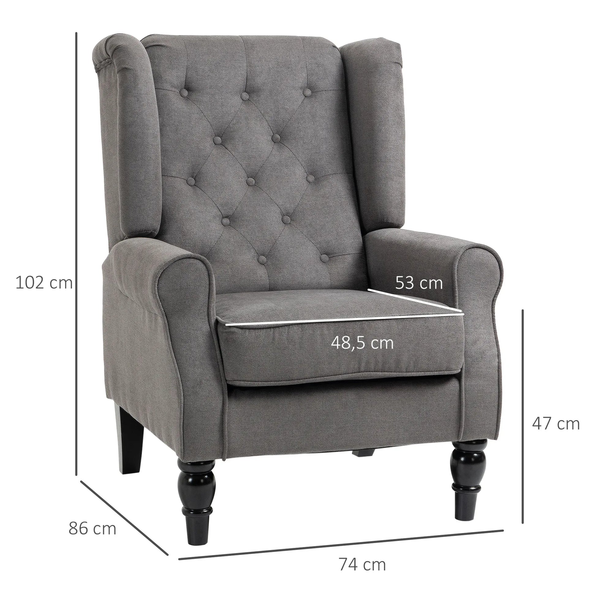 Spalvotas fotelis su "vintage" dizainu, skaitymo fotelis, akcentinis fotelis, medinės kojos, sagų apdaila, pilka + juoda