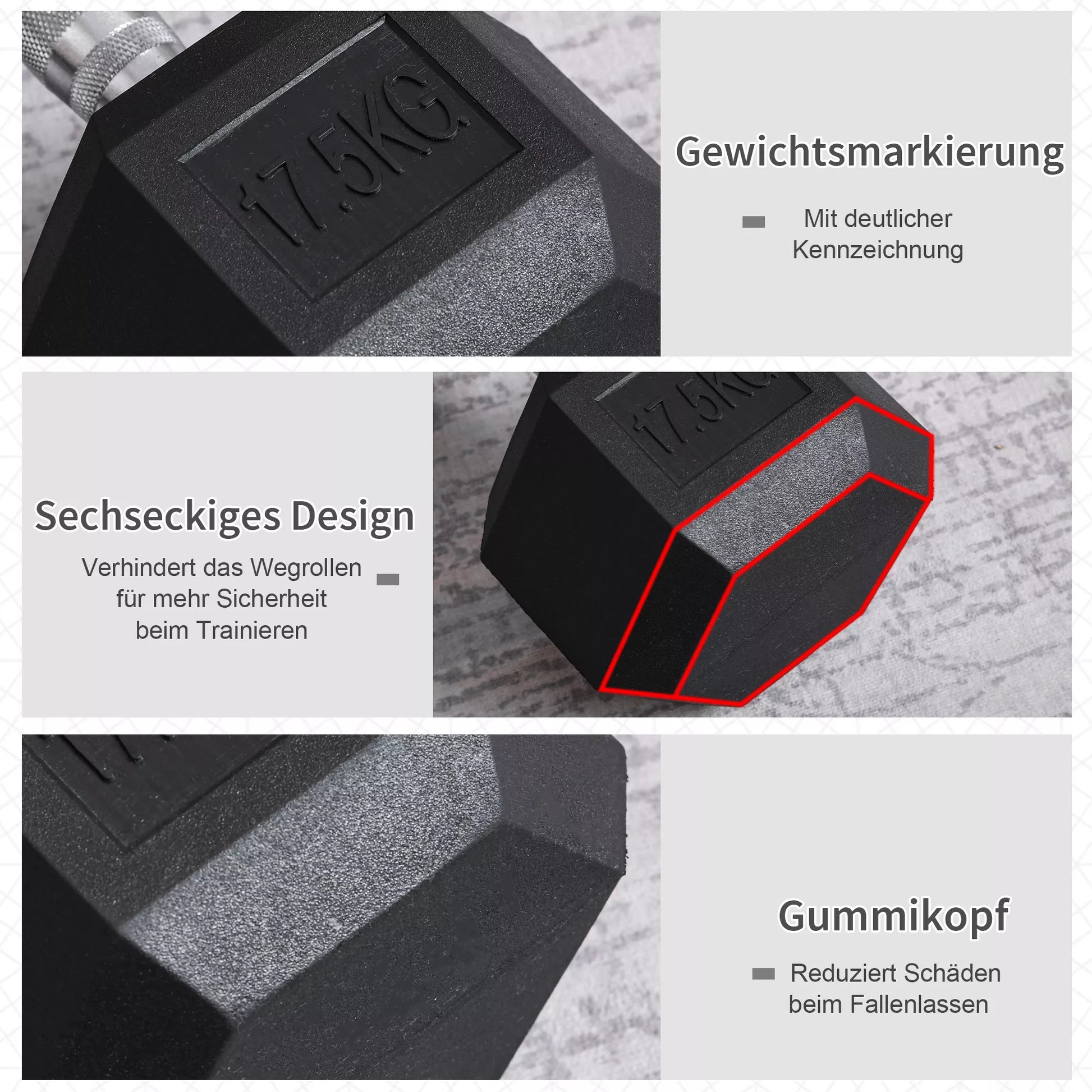 Ši guminė šešiakampė hantelio svarmenis puikiai tinka jūsų treniruočių režimui, tinkamas naudoti namuose, sporto salėje ir biure. Kiekvienas svoris pagamintas iš metalo ir gumos, todėl yra patvarus ir nesibraižo grindų. Rantytas paviršius užtikrina jūsų saugumą atliekant hantelių lenkimą, pečių kėlimą, tricepso pratimus su hanteliu ir kt. Tai idealus būdas atlikti treniruočių rutiną su hanteliais.