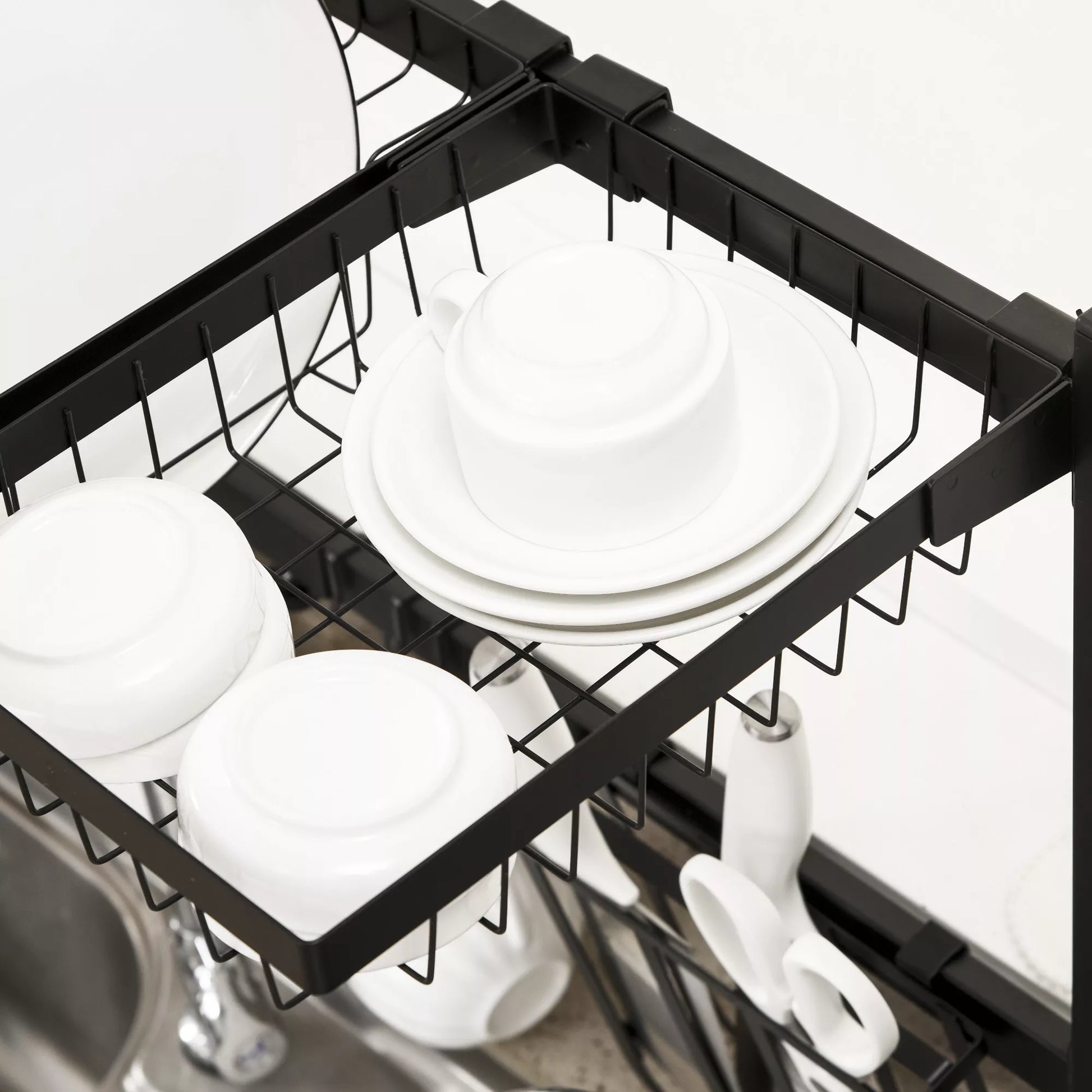 - ✔ Komplekte yra lėkščių laikiklis, vaisių krepšelis, indų laikiklis, stalo įrankių laikiklis, muilo/kempinės laikiklis, pjaustymo lentelės laikiklis, 5 kabliukai ir pjaustymo lentelės lentyna