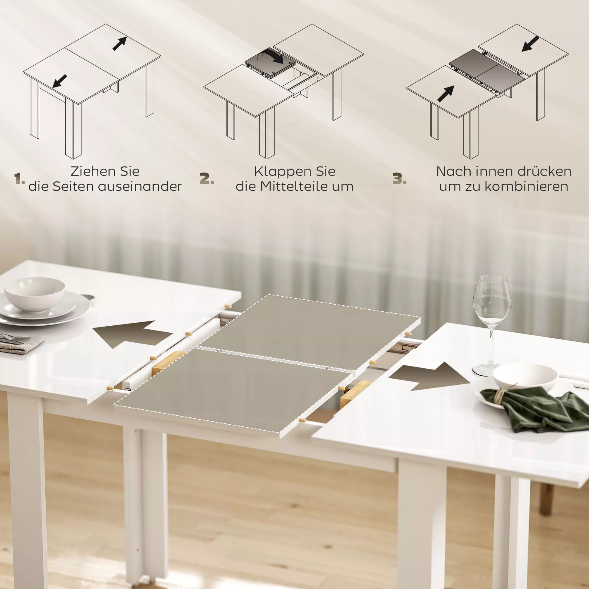 - ✔ Pastumkite šonines plokštes ir atlenkite centrą, kad stalą prailgintumėte nuo 120 cm iki 160 cm