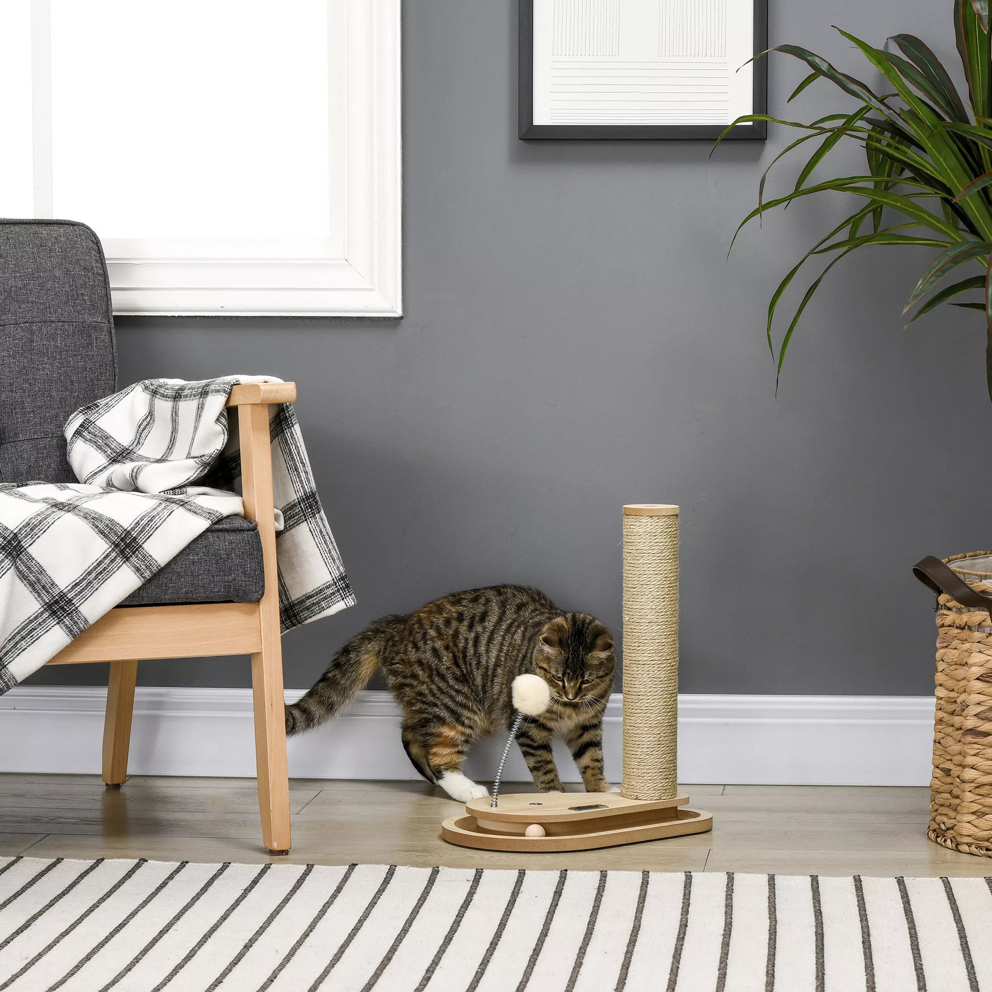 Šis su žaislais esantis draskymo bokštelis padės jūsų katei nenusibosti, kai jūsų nėra šalia. Su kamuoliuku ant spyruoklės ir takeliu su mažais kamuoliukais, užtikrinančiais begalinį linksmybių laiką. Jūsų katės visą dieną žais su šiuo erdvę taupančiu draskymo bokšteliu su integruota pramoga. Jūros žolės draskymo paviršius leidžia katėms galąsti nagus ir nebraižyti jūsų baldų. Paprastas dizainas ir neutralūs atspalviai puikiai dera prie jūsų namų interjero.