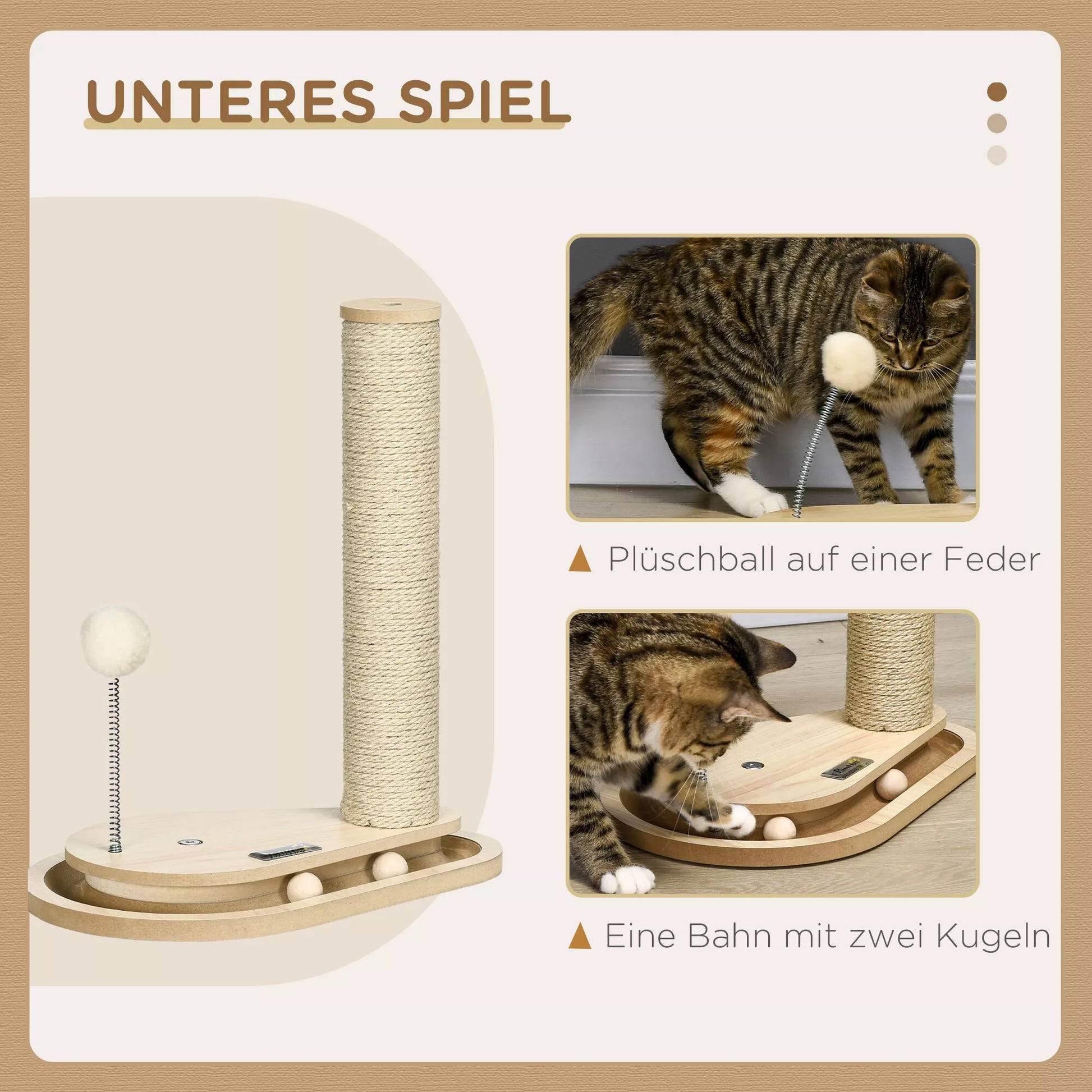 Katės draskyklė kačiukams su žaislu, kamuoliukų takeliu, kamuoliuku su spyruokle, 35 cm x 23 cm x 40 cm, natūrali