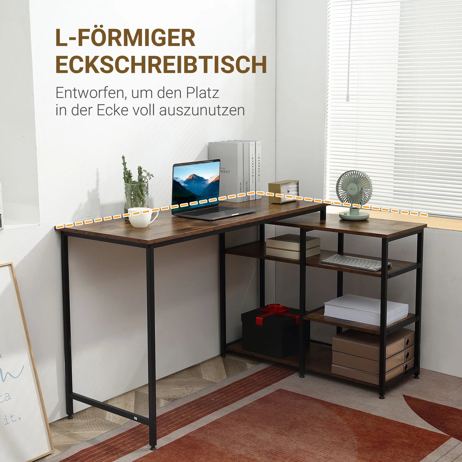 Kampinis rašomasis stalas, kompiuterio stalas, biuro stalas su lentyna ir stalčiumi, L formos, MDP, metalas, rudos spalvos, 135 x 90 x 79 cm